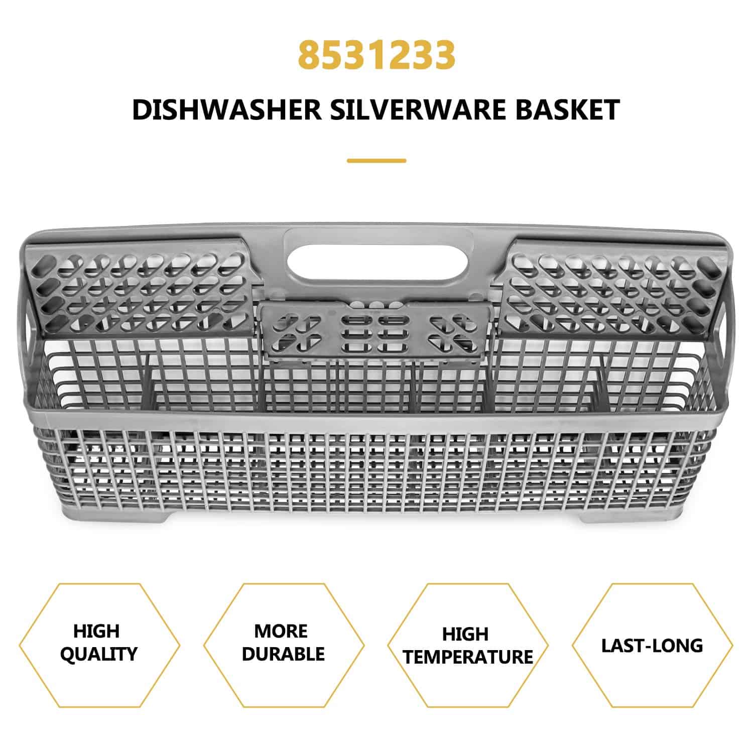 5. MODELOS UNIVERSALES: La canasta para lavavajillas 8531233 actualizada es de material ABS de calidad superior y duradero, compatible con lavavajillas Whirlpool, Kenmore. Garantizando una operación duradera y efectiva. Por favor, verifica el tamaño de tu canasta antes de ordenar, para evitar los problemas causados por la devolución y el cambio.