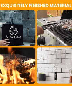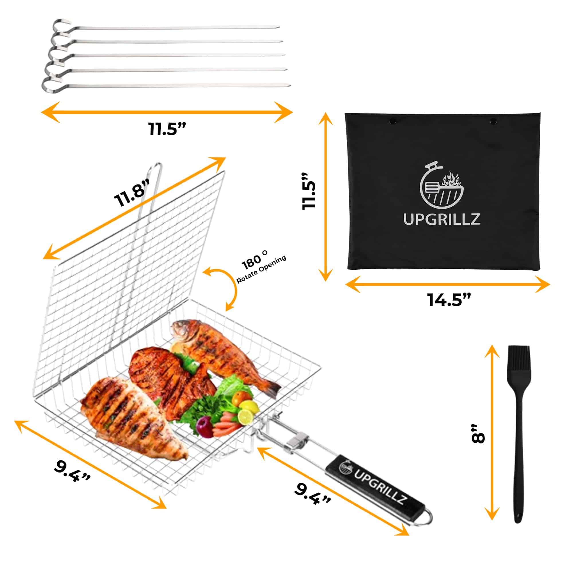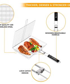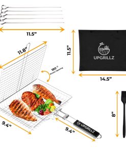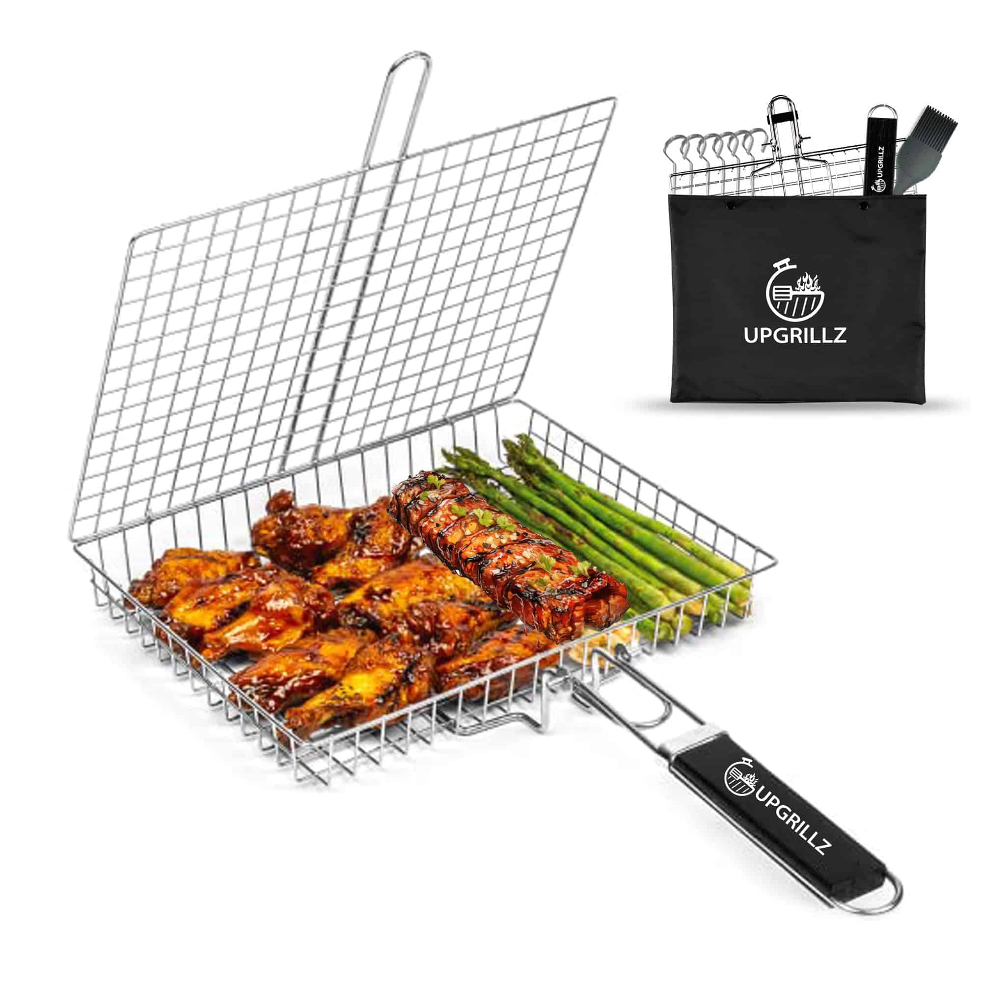 1. Almacenamiento fácil Nuestra canasta para pescado para parrilla viene con un mango de madera plegable y desmontable que es lo suficientemente largo para funcionar como una extensión de la mano junto con una bolsa, haciéndola conveniente para almacenar y transportar. 2. Sin problemas al voltear Con el mecanismo de bloqueo perfecto acompañado por el peso ligero de nuestra canasta para parrilla de barbacoa, voltear la comida se ha vuelto más fácil que nunca. 3. Superficie de cocción ideal La canasta de parrilla de pescado Upgrillz para parrilla exterior mide 11.8 pulgadas de largo, 9.4 pulgadas de ancho y 1.6 pulgadas de profundidad, dimensionada de manera que distribuye el calor de manera uniforme en toda la canasta de parrilla y es suficiente para alimentar a 3-4 personas. 4. Paquete perfecto Upgrillz se preocupa por brindarte una experiencia de parrilla definitiva, por lo tanto, además de la canasta para parrilla de pescado, hemos incluido 5 pinchos de acero inoxidable y un pincel de silicona en el paquete para ahorrarte tiempo y dinero comprándolos por separado. 5. A prueba de óxido Es una rejilla de parrilla de pescado de acero inoxidable 430 para la parrilla que te permite disfrutar con seguridad de cada bocado de una deliciosa barbacoa.