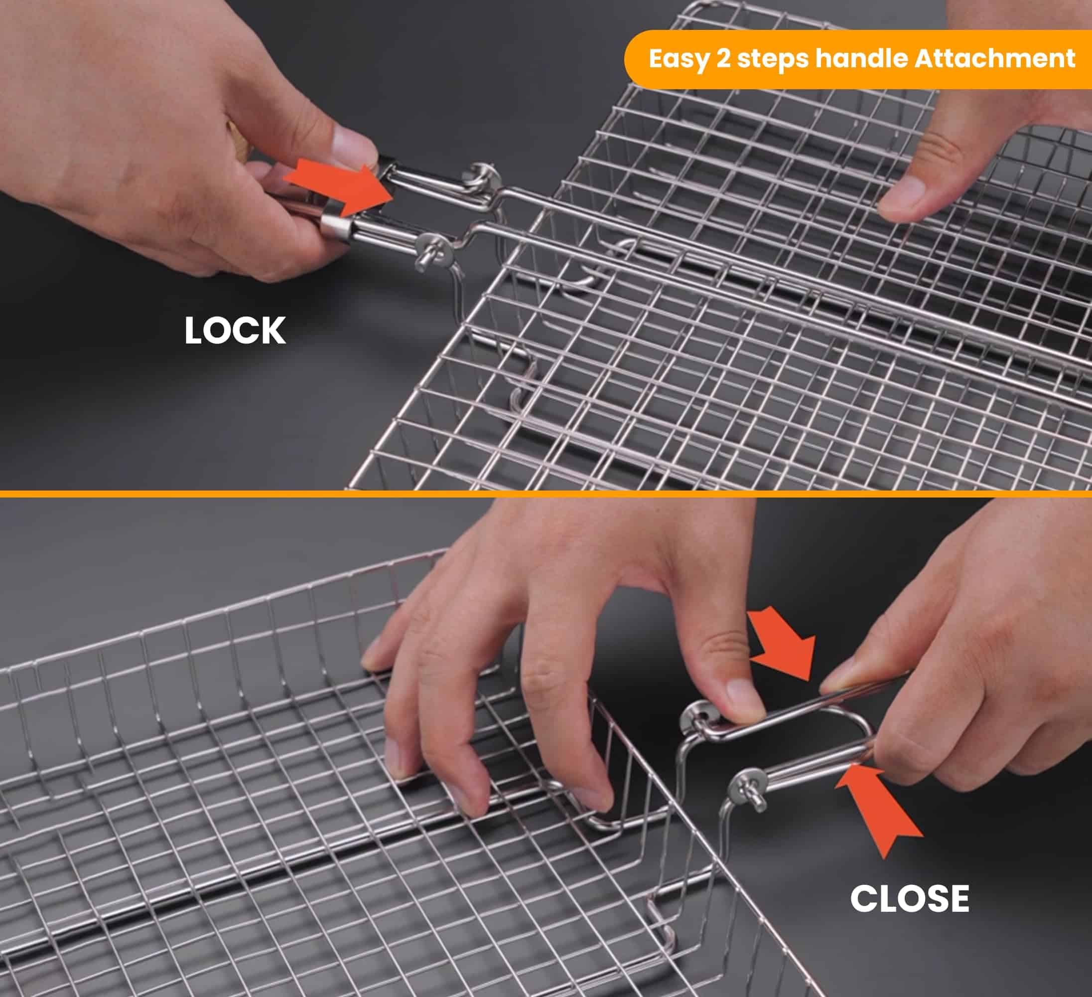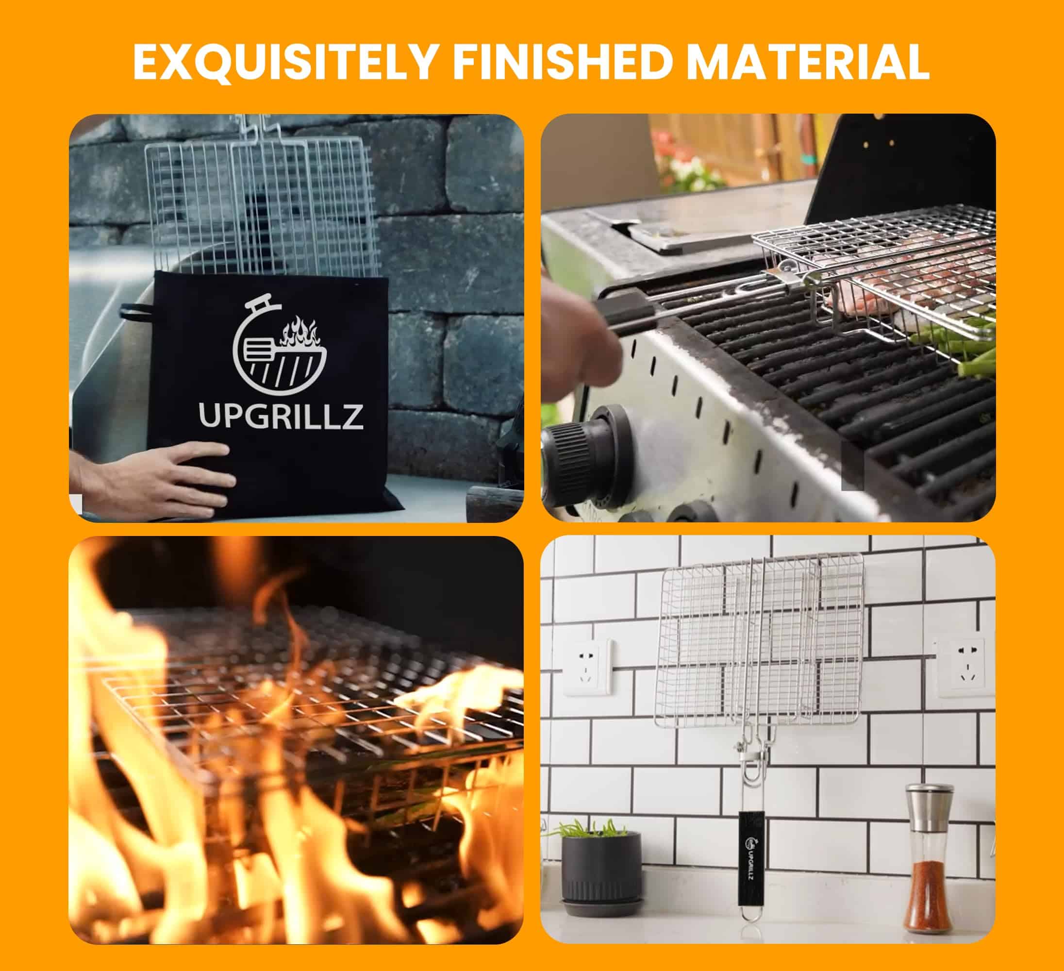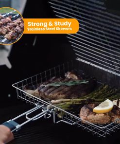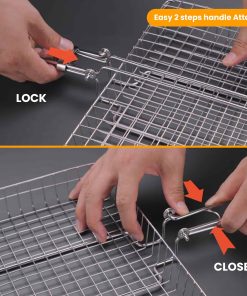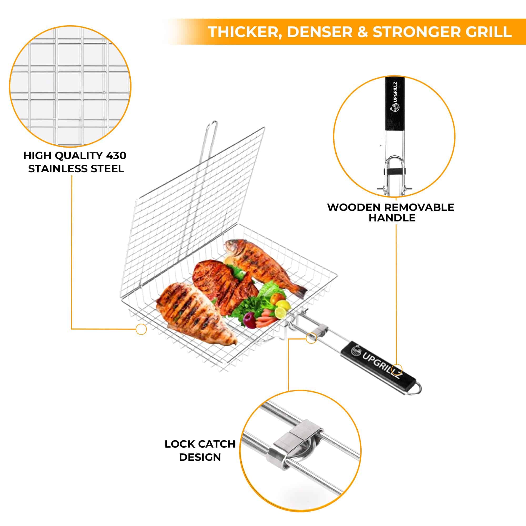 1. Almacenamiento fácil Nuestra canasta para pescado para parrilla viene con un mango de madera plegable y desmontable que es lo suficientemente largo para funcionar como una extensión de la mano junto con una bolsa, haciéndola conveniente para almacenar y transportar. 2. Sin problemas al voltear Con el mecanismo de bloqueo perfecto acompañado por el peso ligero de nuestra canasta para parrilla de barbacoa, voltear la comida se ha vuelto más fácil que nunca. 3. Superficie de cocción ideal La canasta de parrilla de pescado Upgrillz para parrilla exterior mide 11.8 pulgadas de largo, 9.4 pulgadas de ancho y 1.6 pulgadas de profundidad, dimensionada de manera que distribuye el calor de manera uniforme en toda la canasta de parrilla y es suficiente para alimentar a 3-4 personas. 4. Paquete perfecto Upgrillz se preocupa por brindarte una experiencia de parrilla definitiva, por lo tanto, además de la canasta para parrilla de pescado, hemos incluido 5 pinchos de acero inoxidable y un pincel de silicona en el paquete para ahorrarte tiempo y dinero comprándolos por separado. 5. A prueba de óxido Es una rejilla de parrilla de pescado de acero inoxidable 430 para la parrilla que te permite disfrutar con seguridad de cada bocado de una deliciosa barbacoa.