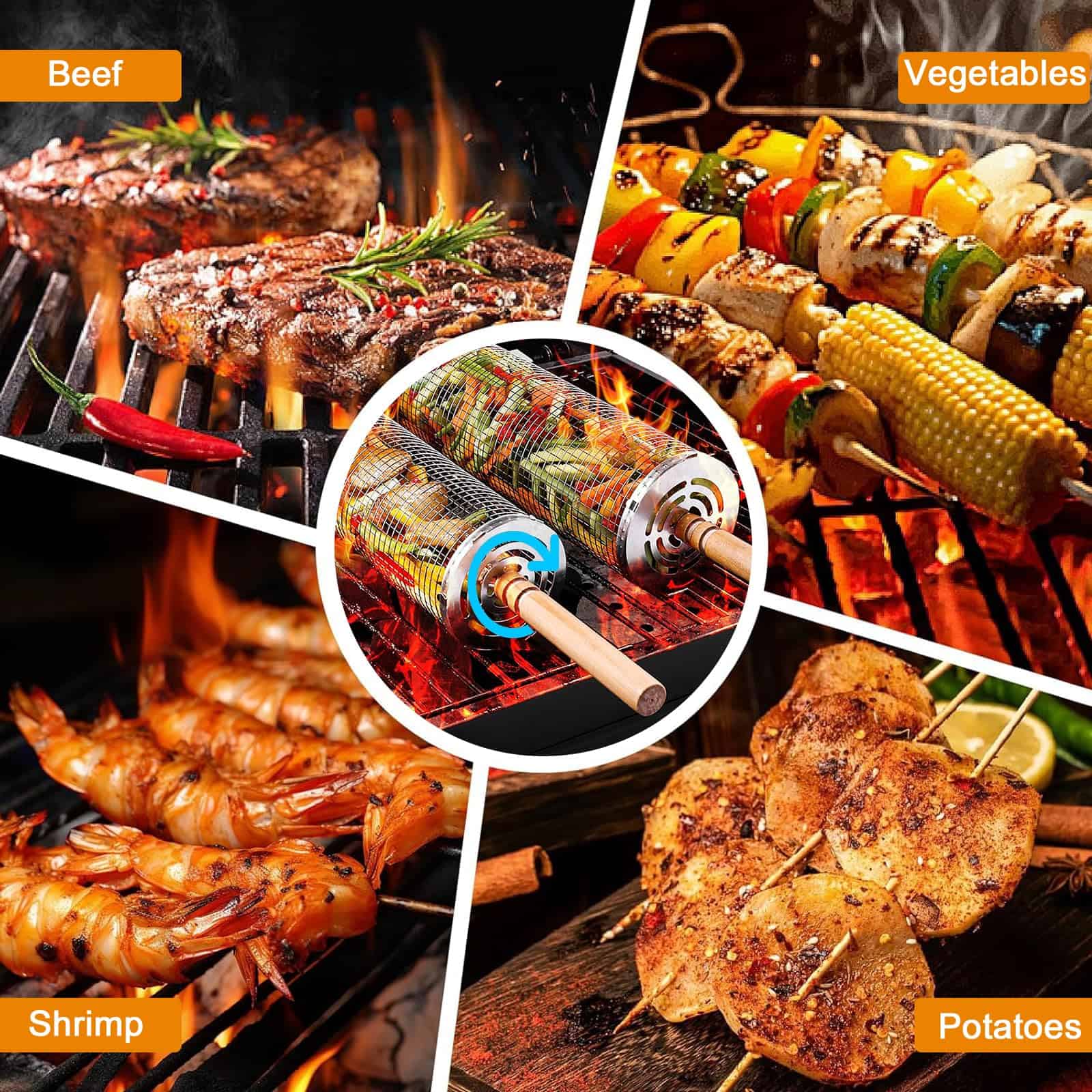 1. Tecnología de Auto-Rotación 360: Rotación manos libres para cocinar de manera uniforme sin necesidad de voltear. ¡Asa verduras, filetes, pescado, camarones, papas fritas e incluso pizza como un profesional! El diseño giratorio imita un mini asador, sellando los jugos para obtener resultados tiernos y de calidad de restaurante cada vez.