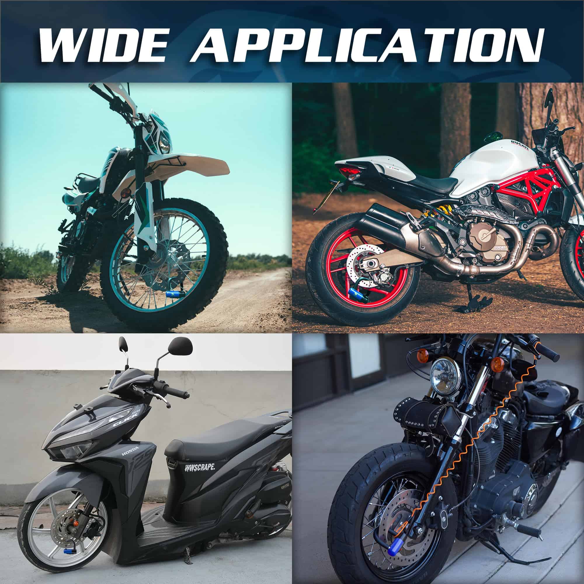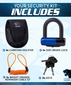 Incluido en la caja está el candado, un juego de tres llaves, el cable recordatorio y una bolsa de transporte que puede llevar ambas partes del candado y del cable recordatorio. La bolsa tiene un clip para cinturón adaptado para que tengas opciones de adjuntarlo ya sea a tu cinturón o jeans. ¡Simplemente desenfunda tu candado de disco para usarlo. Hemos probado este modelo de candado de disco en forma de U y podemos confirmar que es compatible con numerosas formas y tamaños de motocicletas clásicas, motocicletas de tierra, un quad de motocicleta de 4 ruedas ATV (y scooters & ciclomotores) incluyendo Harley Davidson, Suzuki, Indian, Yamaha, Victory, etc.