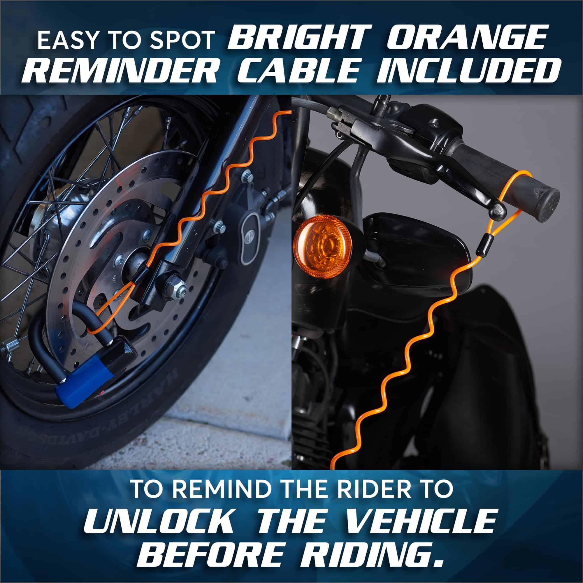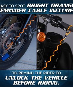 Incluimos un Cable de Recordatorio Altamente Visible que conecta el Candado de Disco al manubrio. Llama la atención de que tu Motocicleta está asegurada, por lo que alerta a un posible ladrón. También te recuerda a TI para que no intentes salir conduciendo con el Candado de Disco todavía puesto!