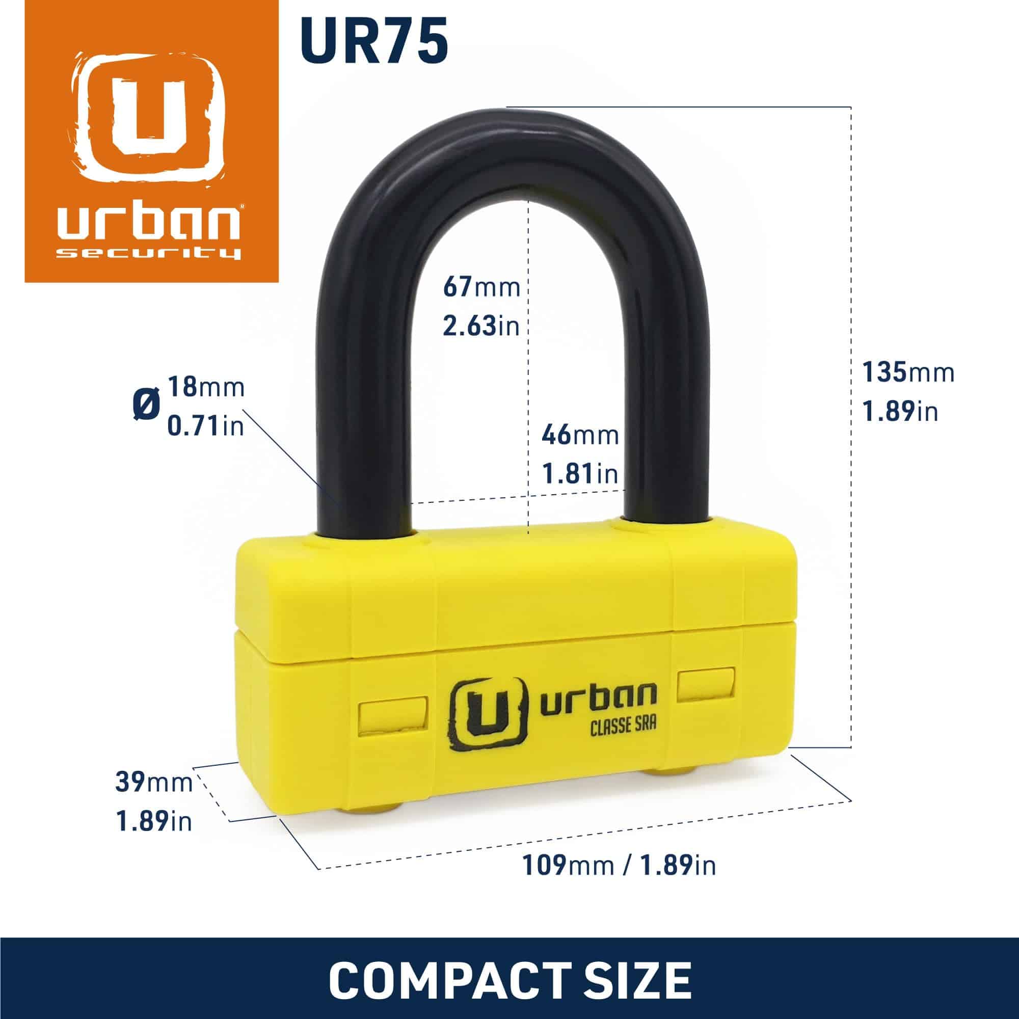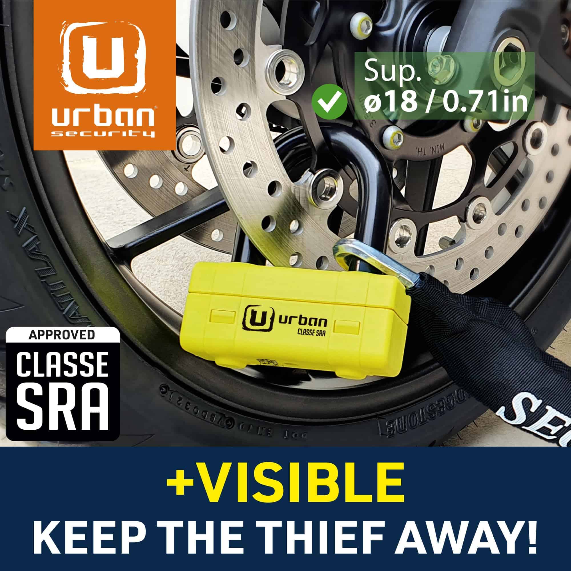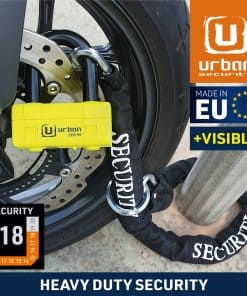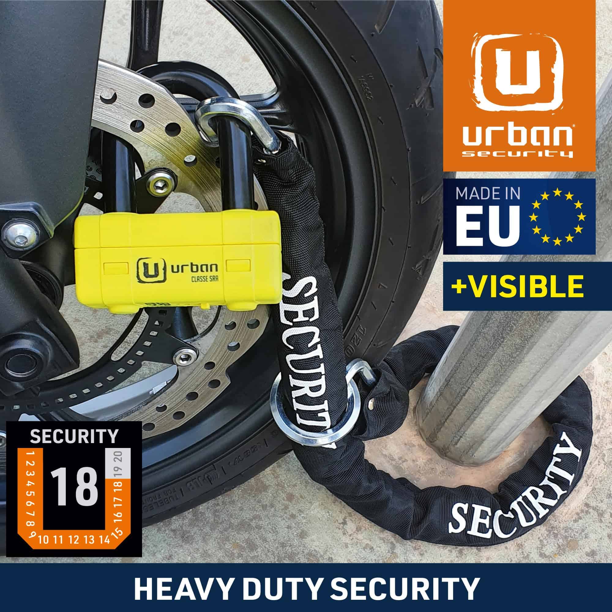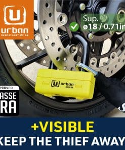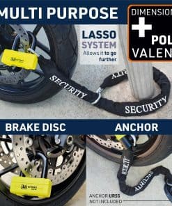 El pack URBAN UR75 DUO cuenta con la cadena 10 y lo mejor de los candados de disco con un arco de 18 mm de diámetro y que gracias a su diseño puedes cerrarlo en el disco de freno delantero alrededor de la cadena de la rueda trasera y por supuesto combinarlo con la cadena para anclarlo a un elemento extremo. La cadena también está cubierta por una cubierta textil para evitar daños en la pintura de la motocicleta. El pack está aprobado CLASSE SRA y fabricado en Europa.