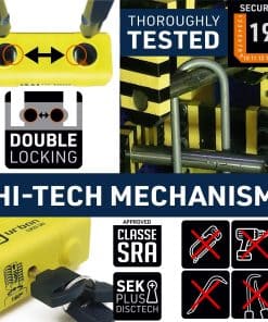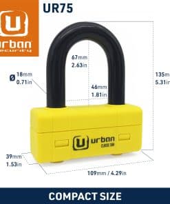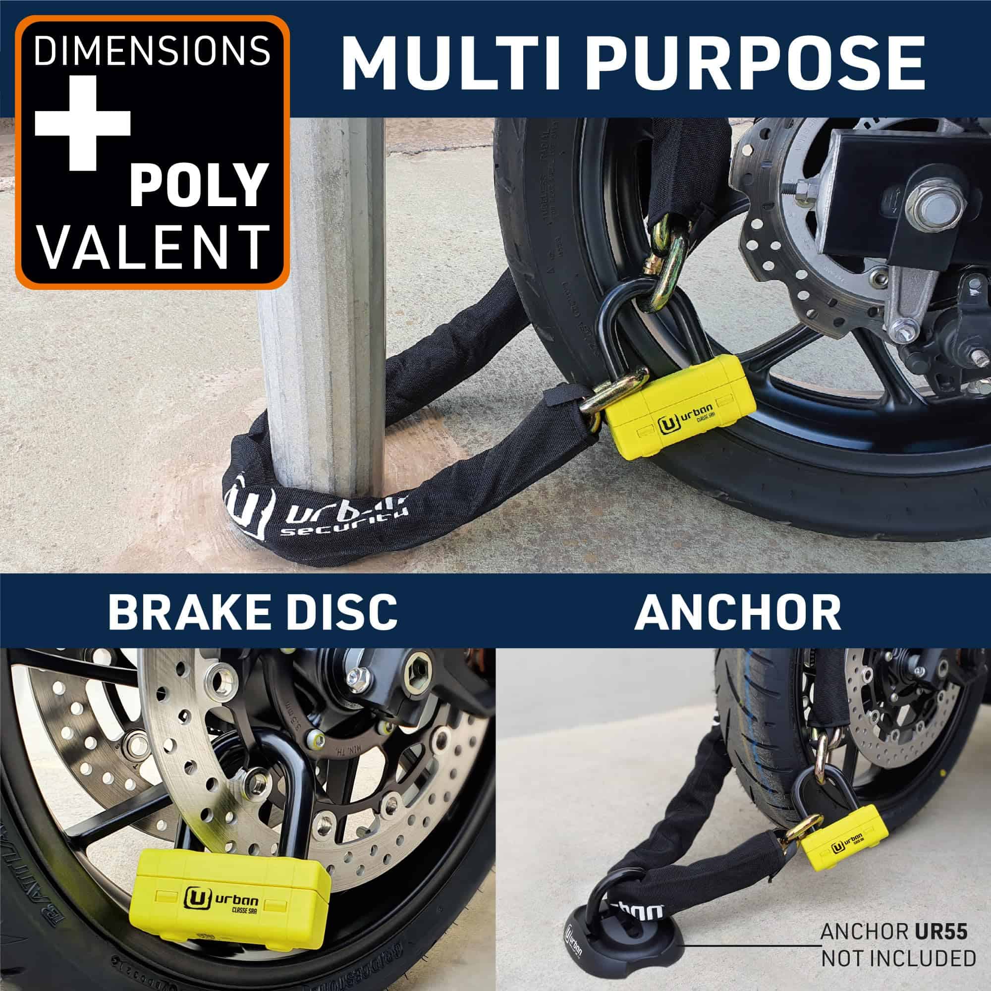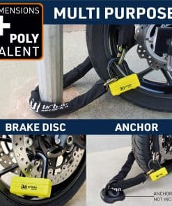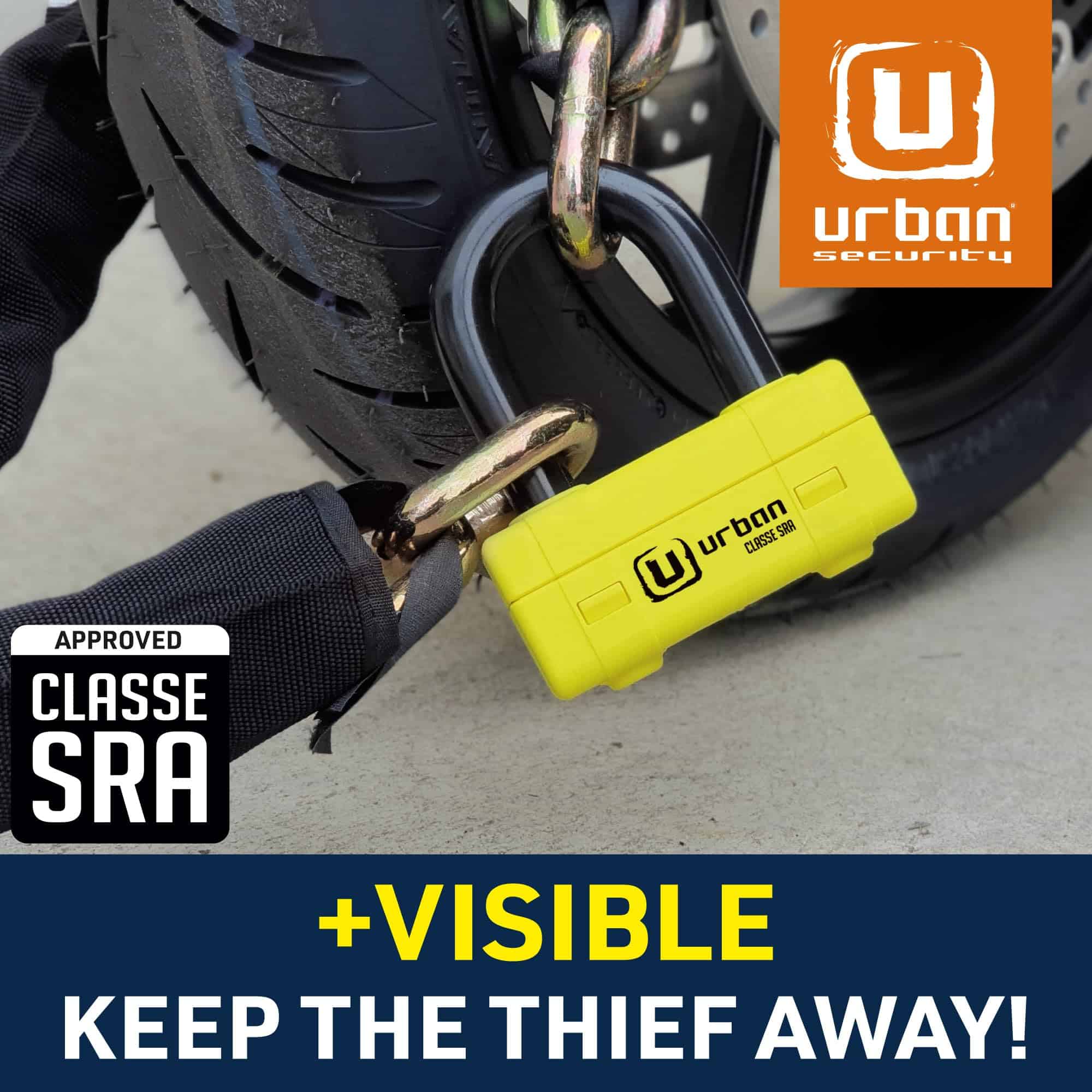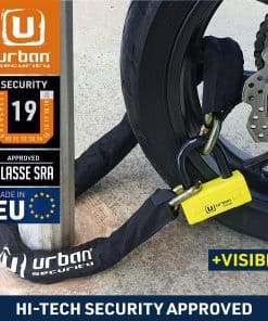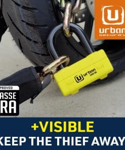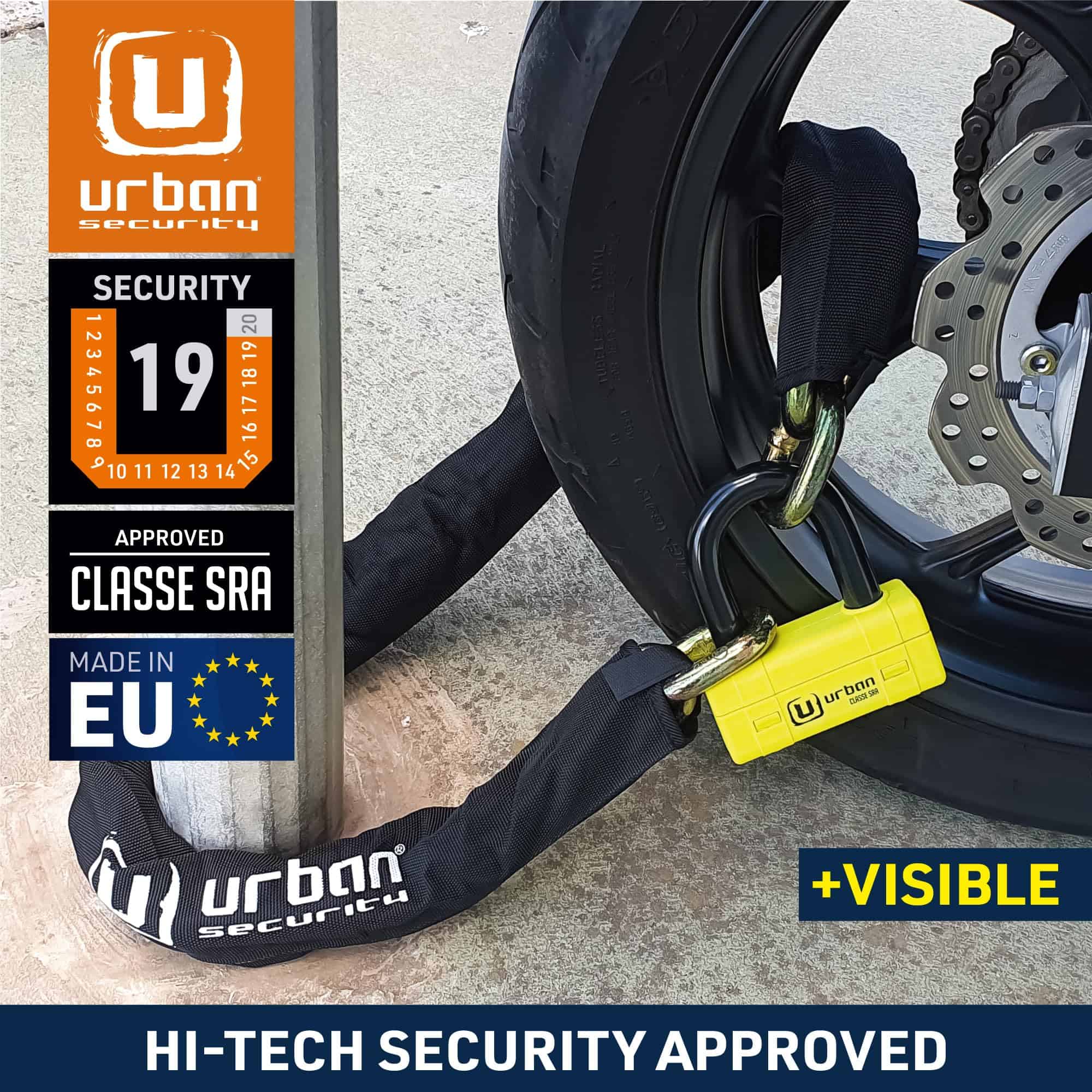 El pack URBAN Mini U y cadenas de 13.5 recomendado para asegurar motocicletas de alta gama y lo mejor de los candados de disco con un arco de 18 mm de diámetro y que gracias a su diseño puedes cerrarlo en el disco del freno delantero alrededor de la cadena de la rueda trasera y por supuesto combinarlo con la cadena para anclarlo a un elemento extremo. Está disponible en diversas longitudes 100 cm, 120 cm, bucle de 120 cm y 150 cm para adaptarse a tus necesidades. Toda la cadena también está cubierta por una cubierta textil para evitar daños en la pintura de la motocicleta. El pack está aprobado CLASSE SRA y fabricado en Europa.