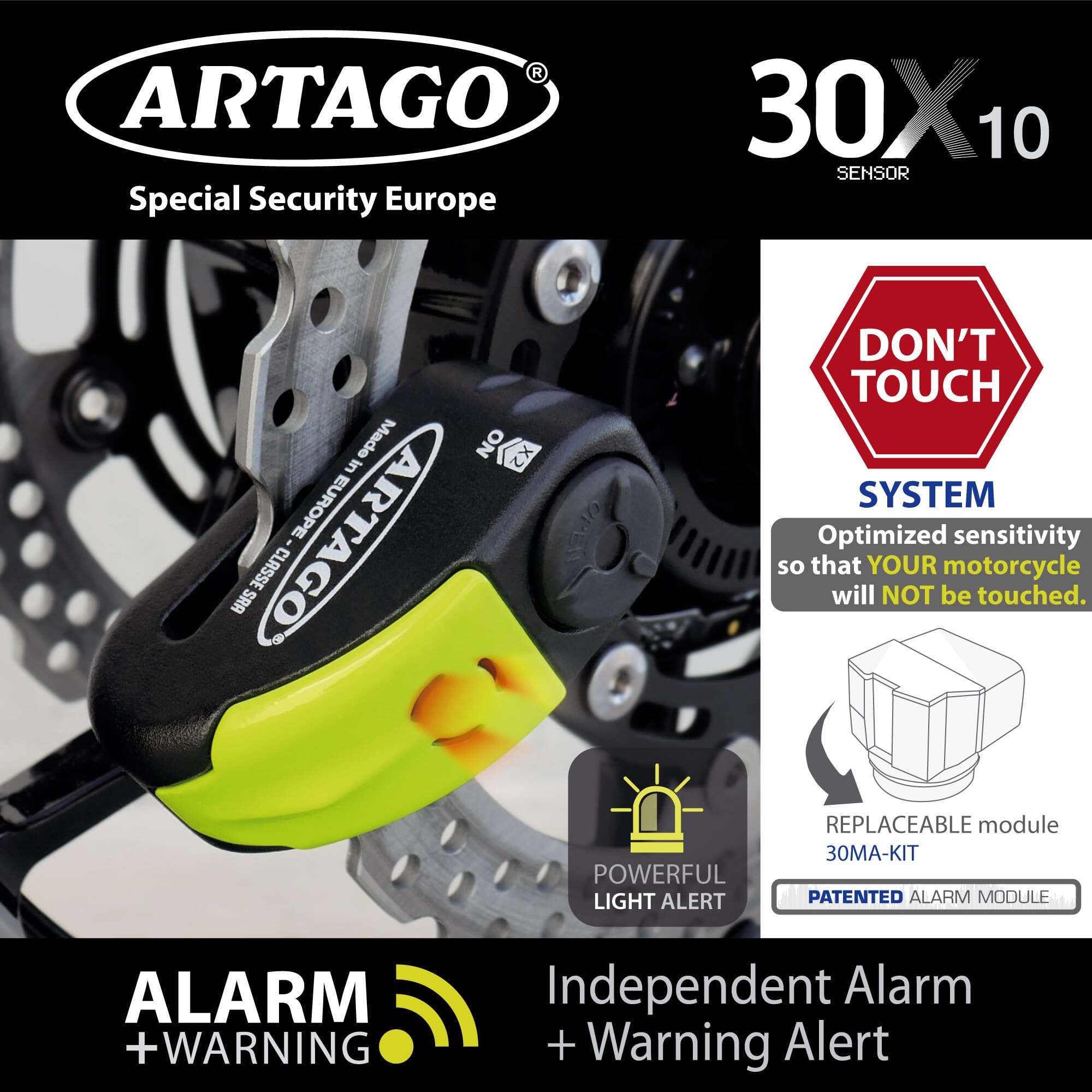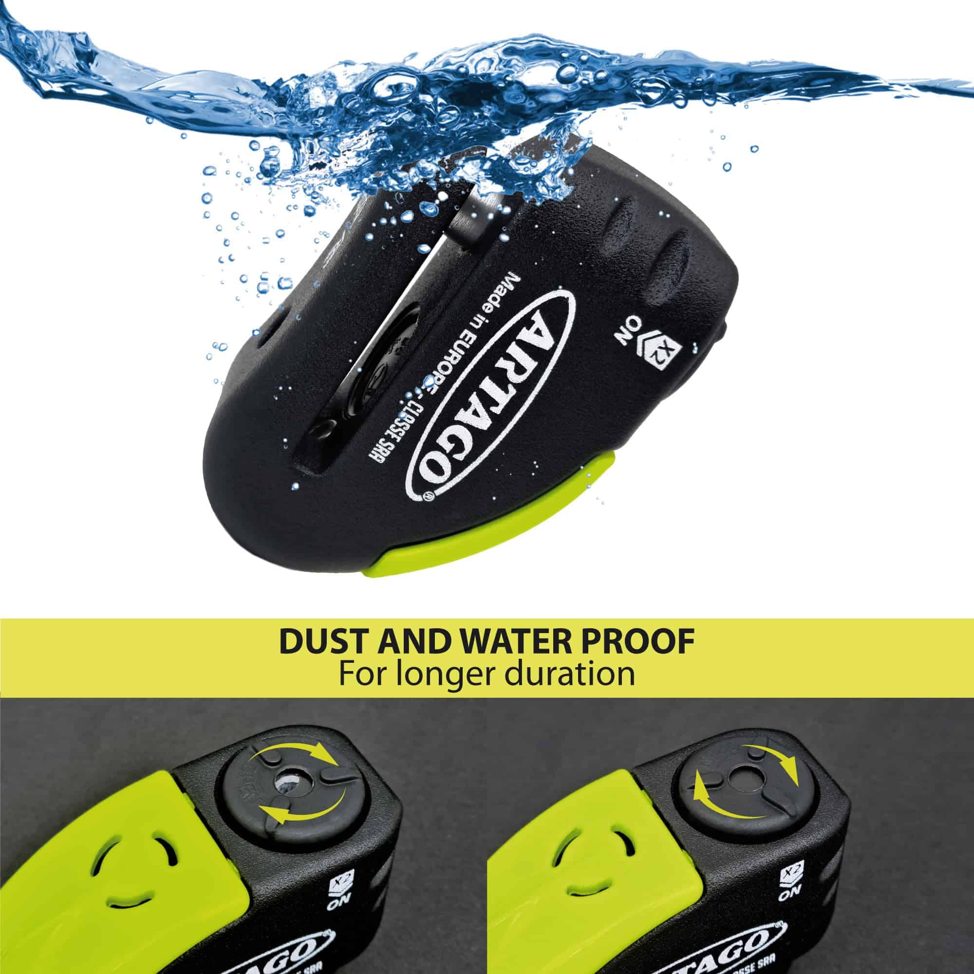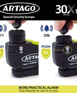 Candado de disco para moto de alta gama con sensor de alarma de alta tecnología que tiene una función de advertencia para evitar falsas alarmas. La potente alarma de 120dB suena solo si el ataque continúa. El candado de disco puede realizar la función de alarma para moto, pero sin gastos de instalación o problemas con la batería de la moto. Coloque el candado de disco y presione el bloqueo dos veces. Tecnología Disc-Tech ART +: Candado de disco para moto con el candado antirrobo más avanzado y seguro, con el exclusivo disco antitaladro de 5 mm. Su módulo electrónico está sellado herméticamente. Fabricado en Europa por ARTAGO SECURE, especialista en candados de disco de alta gama para motos y productos antirrobo para motos. Su fábrica se encuentra entre las más avanzadas a nivel mundial.