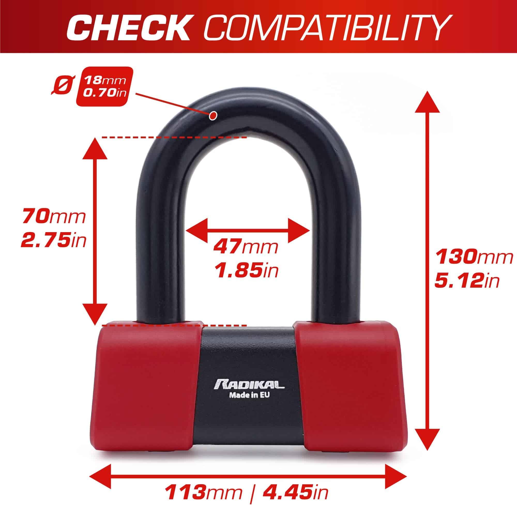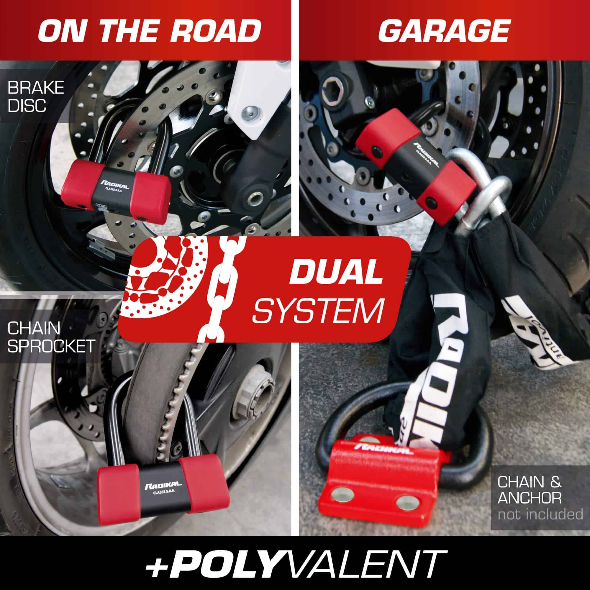 La versatilidad de este candado de disco mini U te permite utilizarlo en múltiples situaciones: desde la protección de tu motocicleta en la carretera hasta asegurar las puertas de tu garaje o portones. Su diseño polivalente se adapta a diferentes usos, ya sea en el disco de freno, piñón de la cadena o combinado con una cadena.