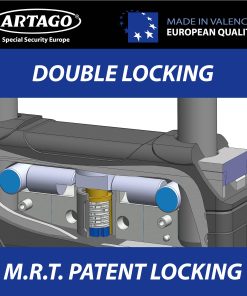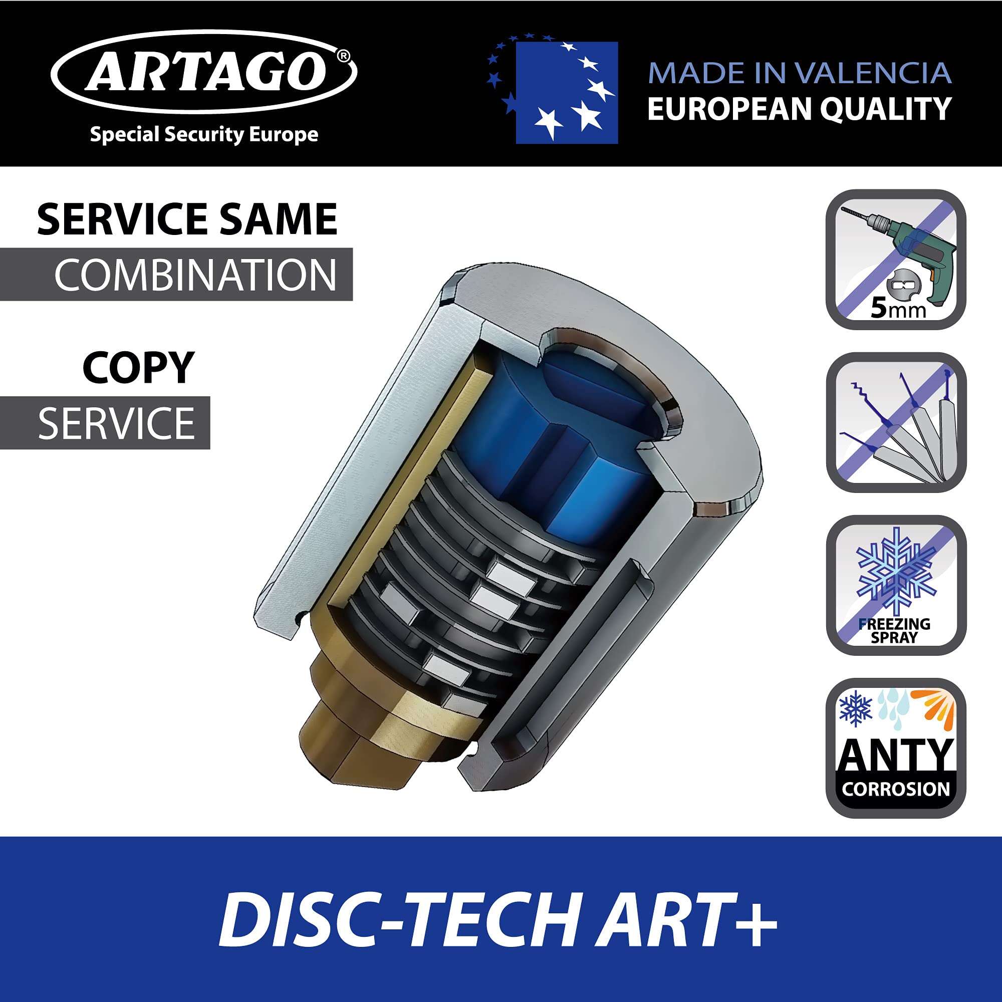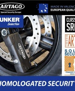 Candado anti-polvo, acolchado anti-rayaduras; probado por los mejores laboratorios europeos; versión más larga de 320 mm para alcanzar un punto fijo; mecanismo de bloqueo patentado con dispositivo anti-torsión de arco, blindaje de 10 mm, exclusivo sistema antivibración en el interior y carcasa de nylon reemplazable; tecnología disc-tech art+ , la cerradura más avanzada y segura contra ladrones y robos.