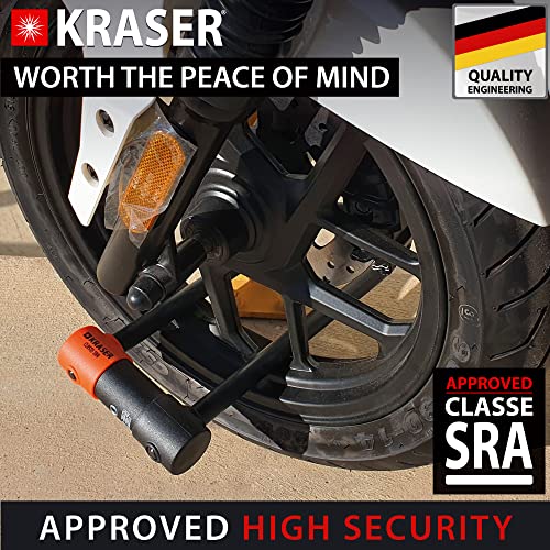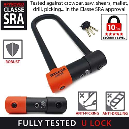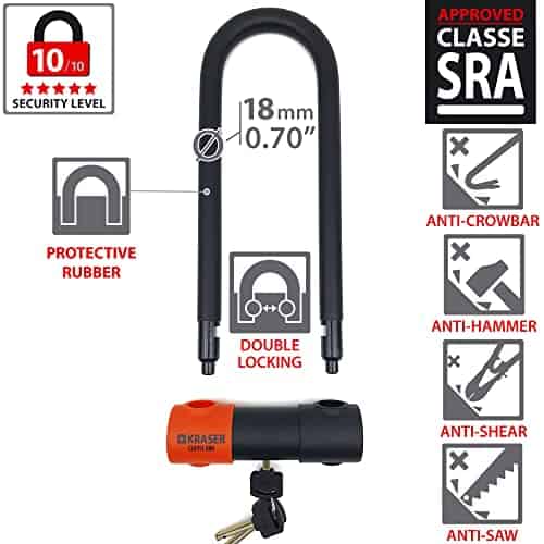 1. Dispositivo antirrobo muy resistente y sólido fabricado en acero templado de alta resistencia con una horquilla casi irrompible con un diámetro de 18 mm. Sólido y muy duradero, tiene una gran consistencia, la horquilla está revestida con goma para no dañar la motocicleta, un espesor total de 20 mm. 2. Candado antirrobo homologado para motocicletas, scooters o bicicletas, fue utilizado contra sierras, tijeras, martillos, palancas, etc. En laboratorios independientes, la certificación SRA garantiza la fiabilidad y eficacia como dispositivo antirrobo. 3. El candado de bicicleta particularmente elaborado es el disco de seguridad tubular con 7 discos, protege el candado contra ataques de ganzúas y lo convierte en un candado antirrobo para motocicletas. Incluye 3 llaves de seguridad. 4. Este candado de bicicleta tiene doble cierre, 2 puntos de cierre del Mini U. La horquilla está cerrada en ambos extremos para maximizar la efectividad del dispositivo antirrobo. Tiene un tratamiento antioxidante para protegerlo de los elementos. 5. Candado de bicicleta U versátil de 3,34″ de ancho, puede bloquear la rueda delantera o trasera a través de los radios, a través del disco de freno. Disponible en 3 longitudes diferentes (125, 250, 300 mm), cuanto más larga sea la horquilla, más formas de sujetar la U a un punto fijo. Perfecto en combinación con cadenas de seguridad y un anclaje como el KRASER KR40B.