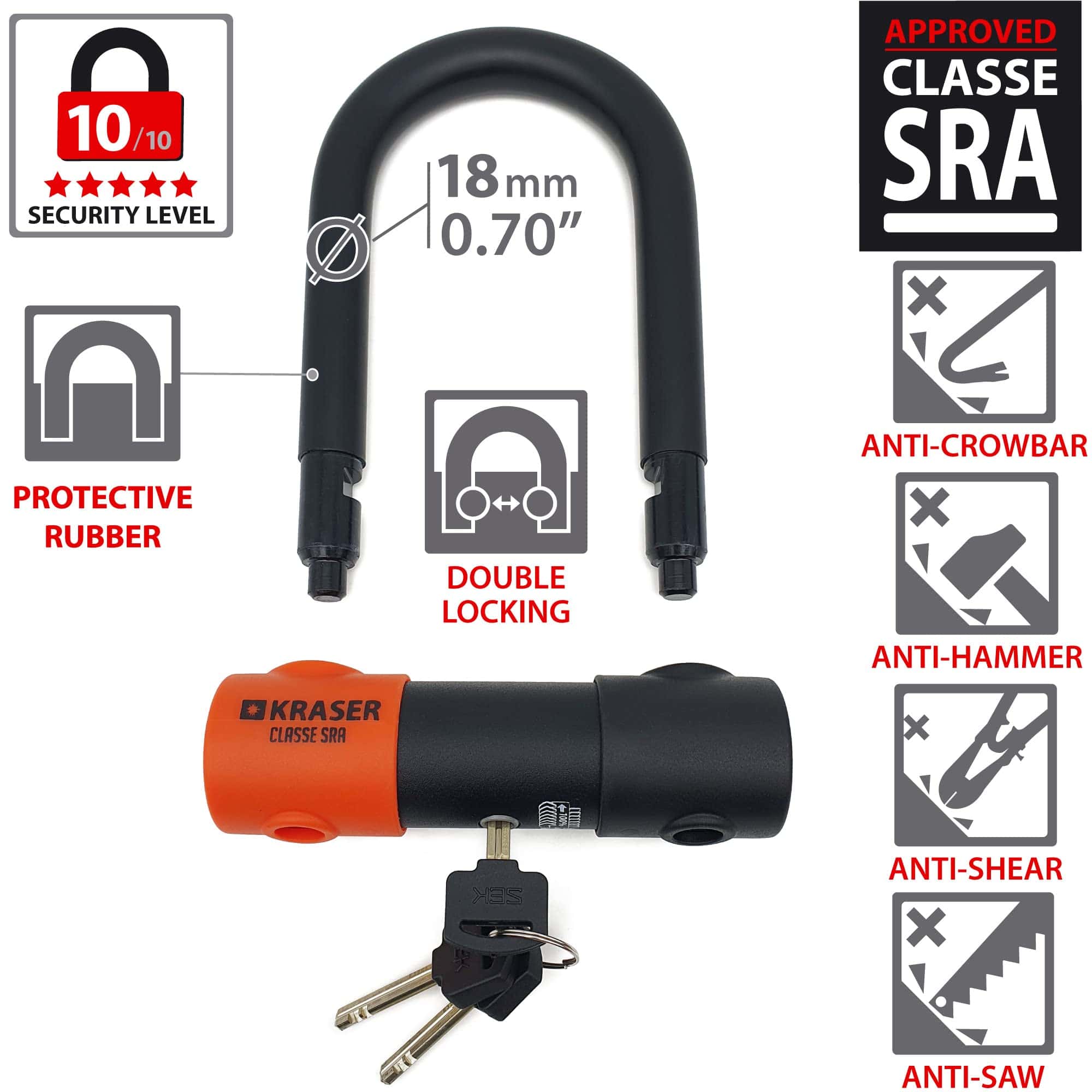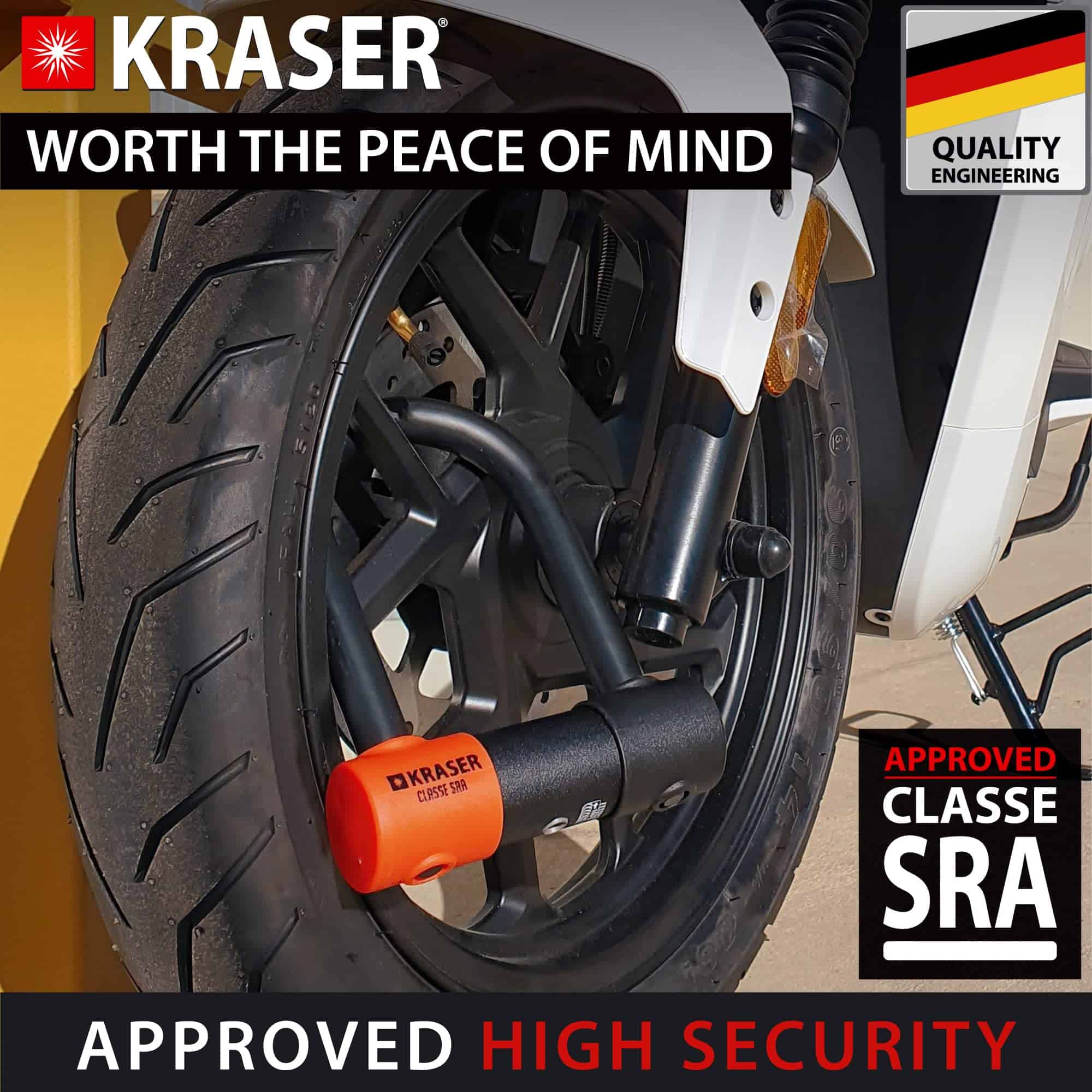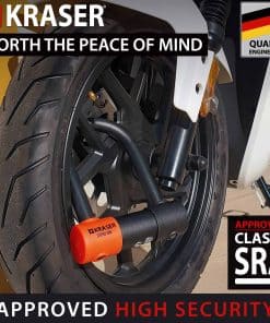 Candado para motocicletas con certificación SRA, protección efectiva contra sierras, tijeras, martillos, palancas, etc. Bloqueo de doble puto con horquilla bloqueada en ambos extremos para maximizar la efectividad del dispositivo antirrobo. El candado de bicicleta cuenta con un disco de seguridad tubular con 7 discos que protege el candado de ataques con ganzúas. Versátil candado con 2 puntos de bloqueo Mini U que se puede utilizar para bloquear la rueda delantera o trasera a través de los radios o del disco de freno. Producto de calidad alemana de la marca Kraser con garantía y servicio de Equipmotor.