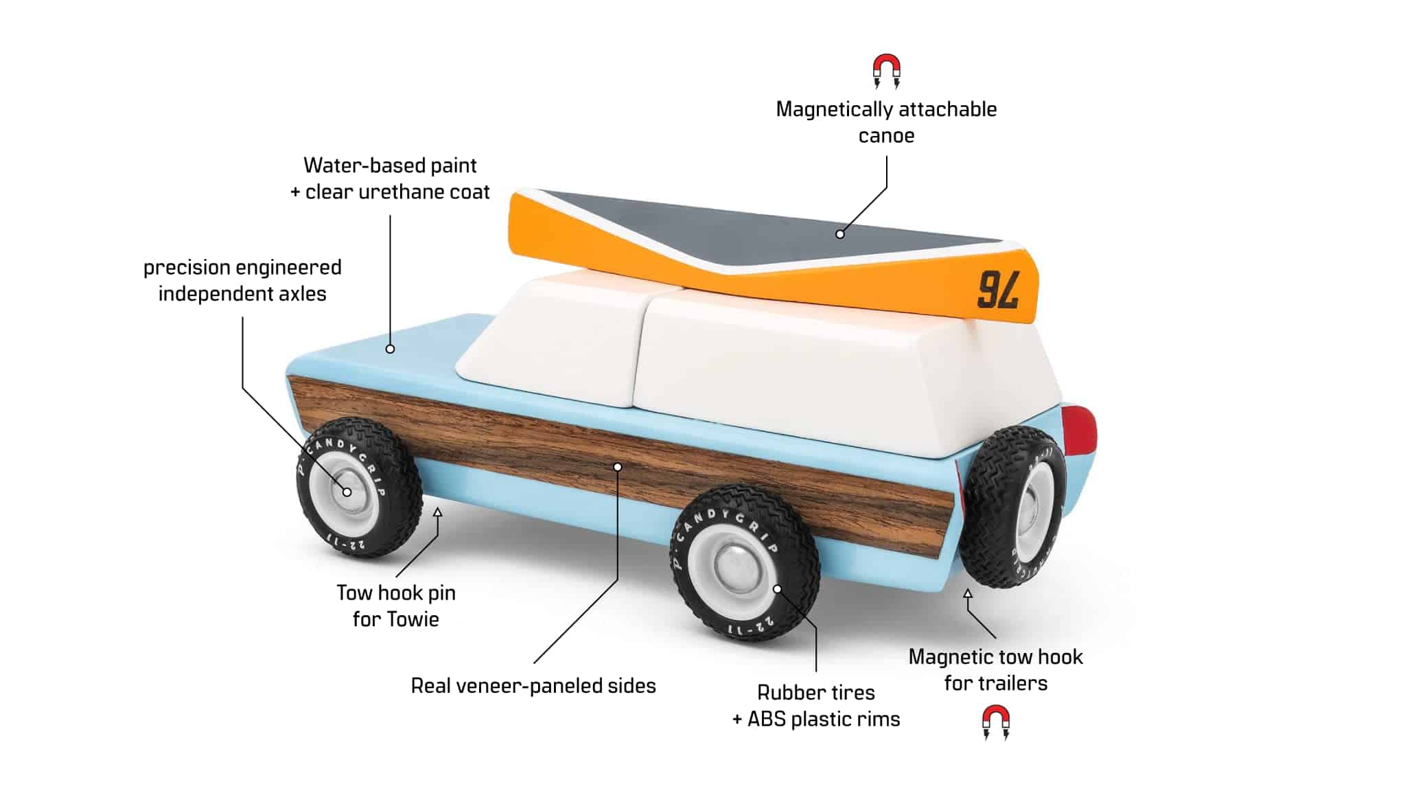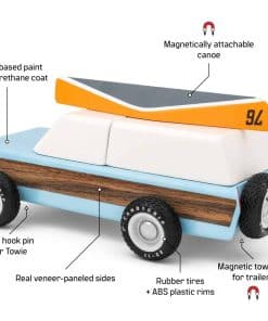 El más clásico de los clásicos, de esto están hechas las leyendas. Con paneles laterales de chapa de nogal real, y un imán incrustado en el techo, viene con una canoa que se acopla a él. Este coche también cuenta con un gancho de remolque magnético, lo que le permite enganchar nuestro igualmente impresionante remolque. Hecho de Madera de Haya Maciza. Probado de seguridad según las regulaciones de EE. UU. CPSIA y europeas, australianas y neozelandesas.
