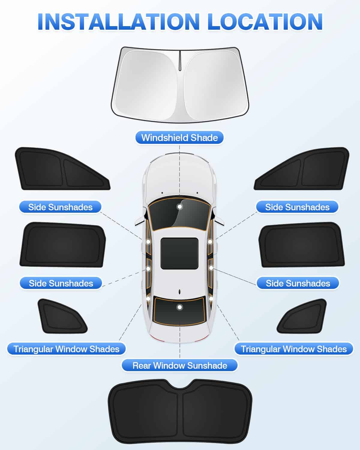 La instalación de este conjunto de parasoles es rápida y sencilla, basta con colocar las cubiertas en cada ventana del automóvil en solo 2 minutos. Cuando no se necesita la cubierta de la sombra de la ventana, se puede quitar fácilmente y guardar en la bolsa de almacenamiento incluida.