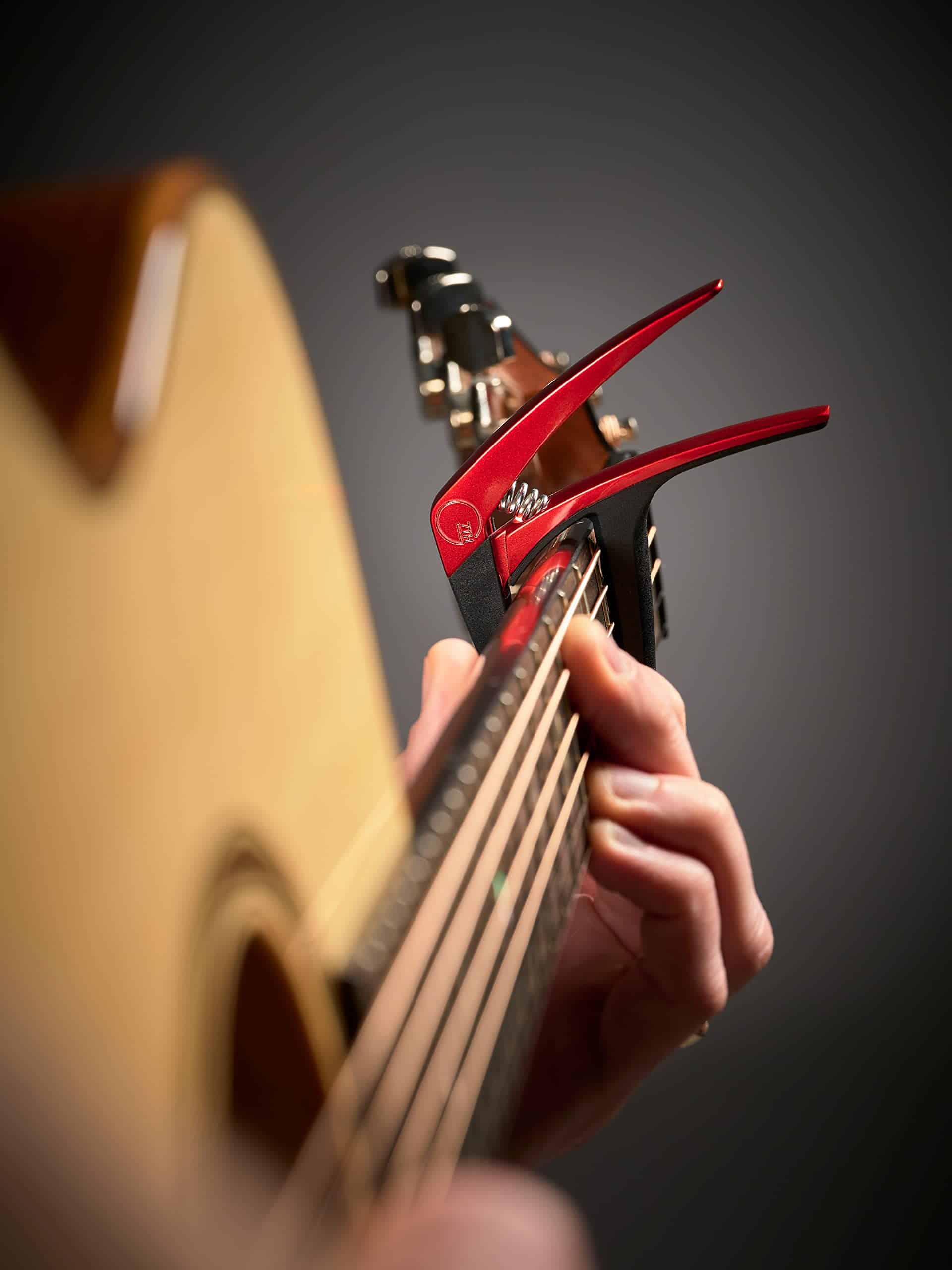 El cuidadoso diseño reduce drásticamente los problemas de afinación y el desgaste del diapasón asociado con la fuerza excesiva de sujeción causada por capos de muelle inferiores.