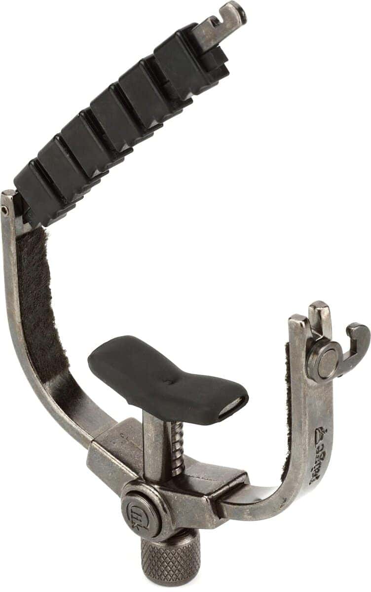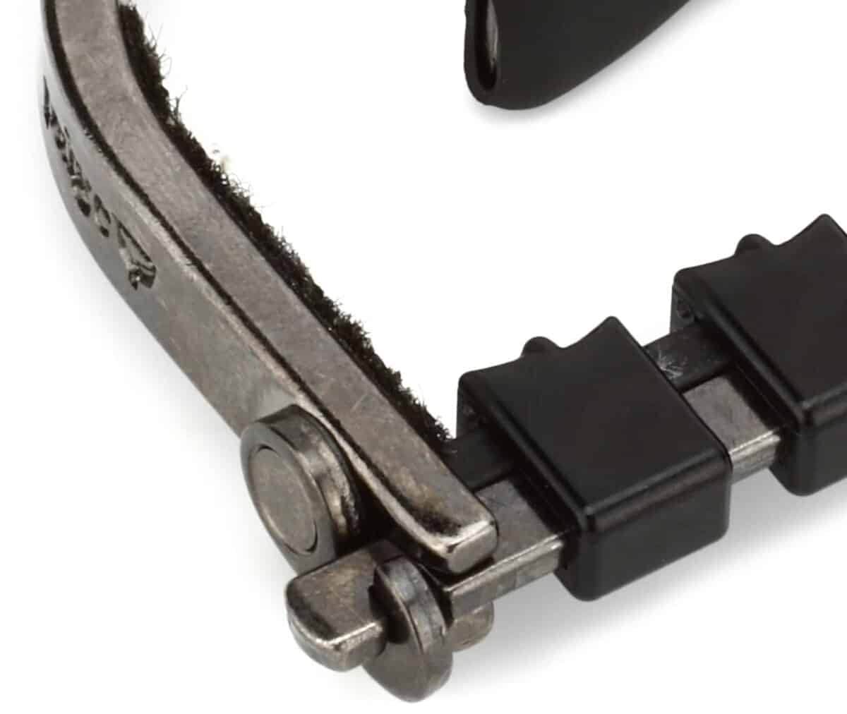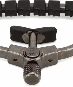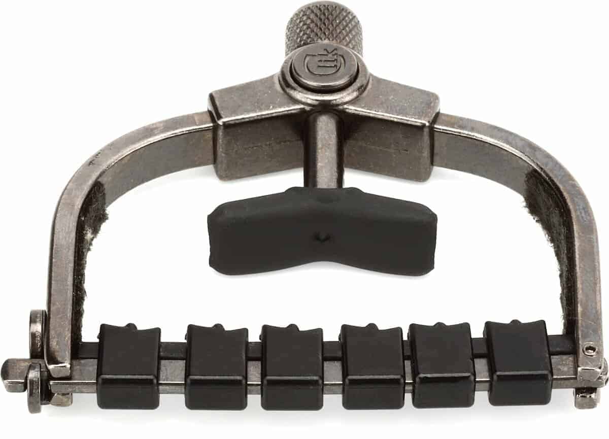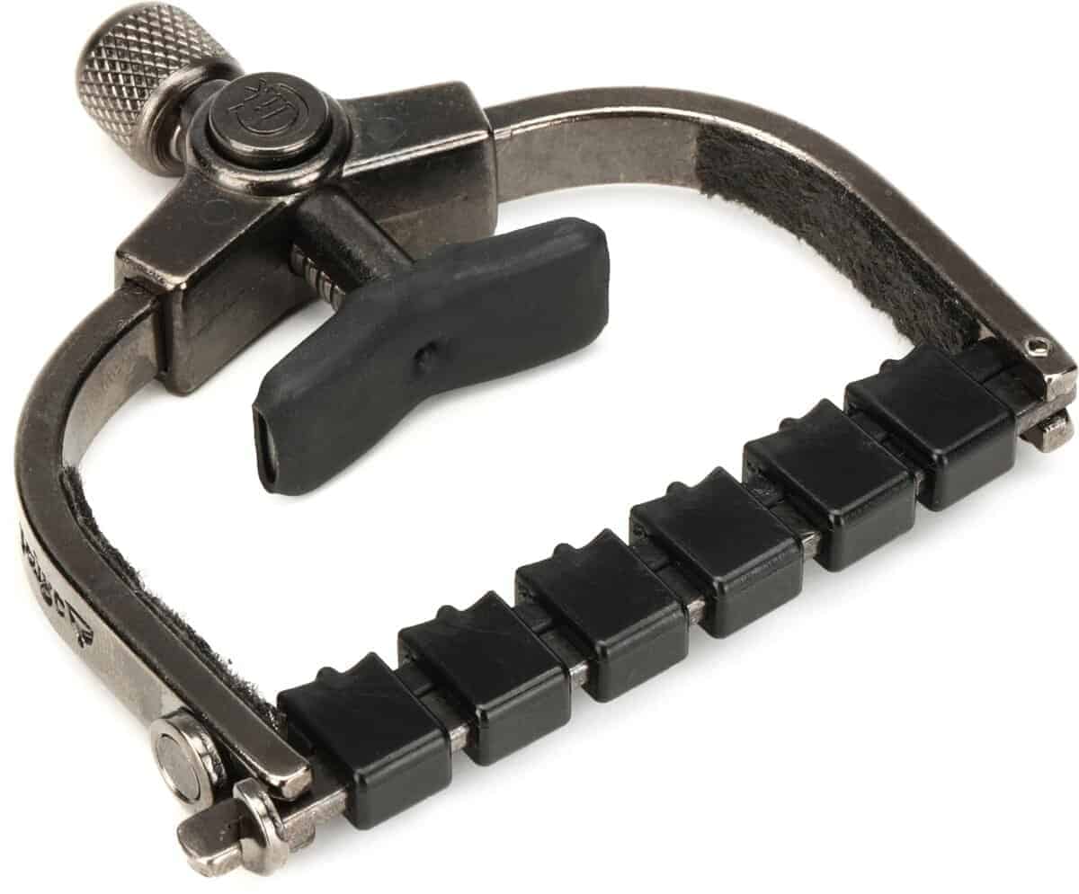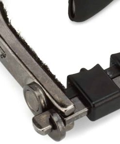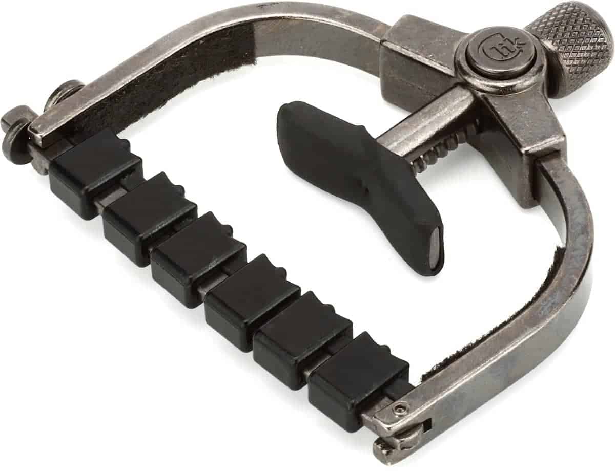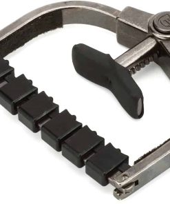El Clik ETI (Innovación de Tono Mejorado) le proporciona un ajuste fácil con una sola mano, un botón de liberación rápida avanzado y se puede guardar detrás de la tuerca cuando no está en uso. Además, el Paige Clik ETI cuenta con un sistema patentado de barra. En esencia, la barra actúa como una tuerca que requiere poco apriete. Esto reduce en gran medida la necesidad de volver a afinar cuando mueve el capo. El sistema de barra está compuesto por insertos especializados hechos de un material similar a una tuerca moldeados individualmente para cada cuerda. Cada inserto tiene un radio para asegurar que la cuerda siempre se posicione en el centro incluso después de doblarla. Los insertos para las 4 cuerdas superiores (pares de octava) tienen un escalón que compensa los diámetros de las cuerdas desiguales. Cada inserto tiene movilidad de izquierda a derecha para alinearse con el cambio del espaciado de las cuerdas mientras se desplaza por el mástil. Debajo de las piezas individuales hay un cojín de goma que permite una presión uniforme y se adapta al radio del diapasón. Esto resulta en un sustain sin zumbidos con un sonido más natural y brillante casi como si no estuviera usando un capo. Ya no tienes que preocuparte de que tu guitarra se desafine mientras mantienes un gran sustain. Hecho a mano en América desde 1988.