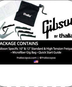 Los capotrastes para guitarras Gibson de Thalia con licencia oficial vienen equipados con nuestra almohadilla de traste estándar de tensión 12 Radius OctaveTouch instalada para su uso en modelos acústicos de Gibson de 6 cuerdas. En el paquete se incluye una almohadilla de traste de alta tensión de radio 12 OctaveTouch para su uso en modelos de 12 cuerdas y almohadillas de traste de radio 10 en ambas tensiones para su uso en otras guitarras. Las almohadillas de traste OctaveTouch imitan la elasticidad del dedo humano. El mecanismo de acción inversa patentado de Thalia Capos permite una instalación y movimiento fáciles en los diapasones de la guitarra. Para un ajuste fino mejorado, están disponibles almohadillas de traste intercambiables para que coincidan con el radio específico de casi todas las guitarras del mercado. Logotipo de Gibson grabado con láser en la carcasa