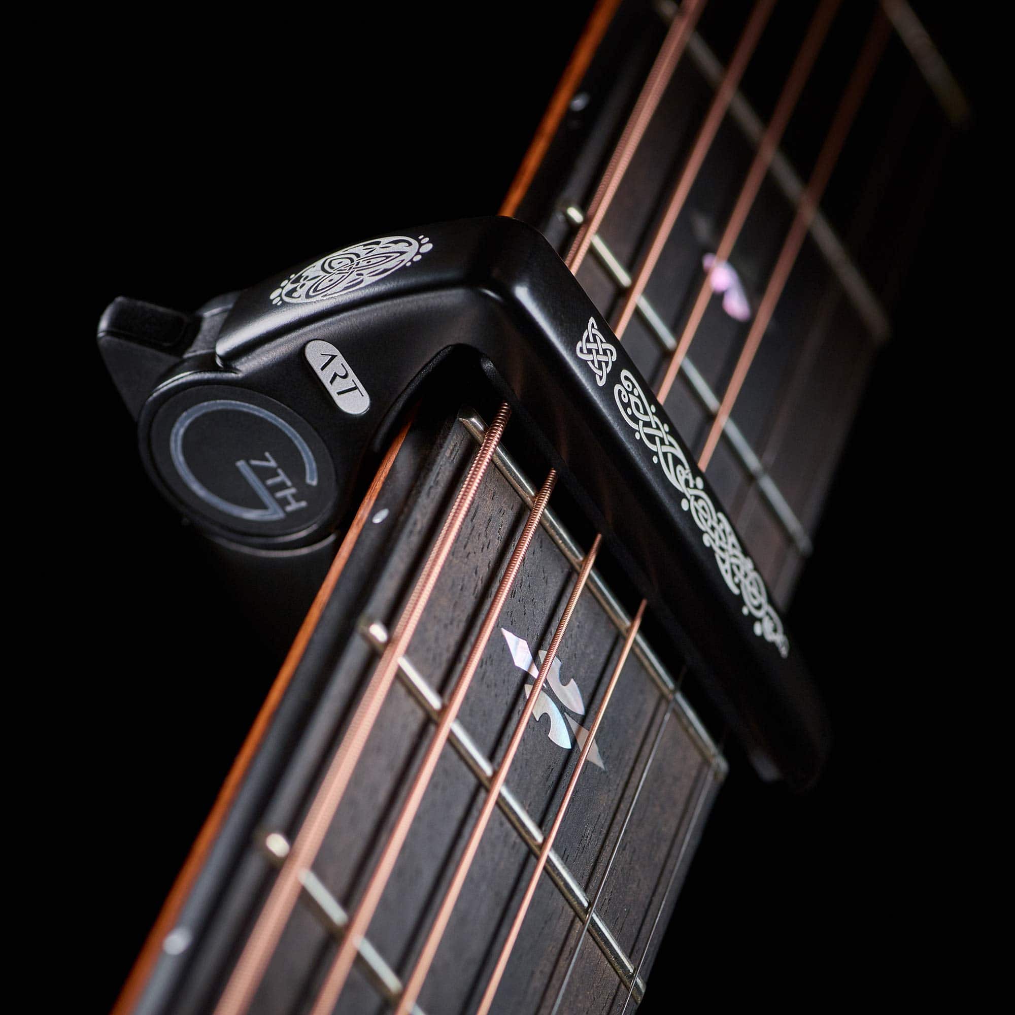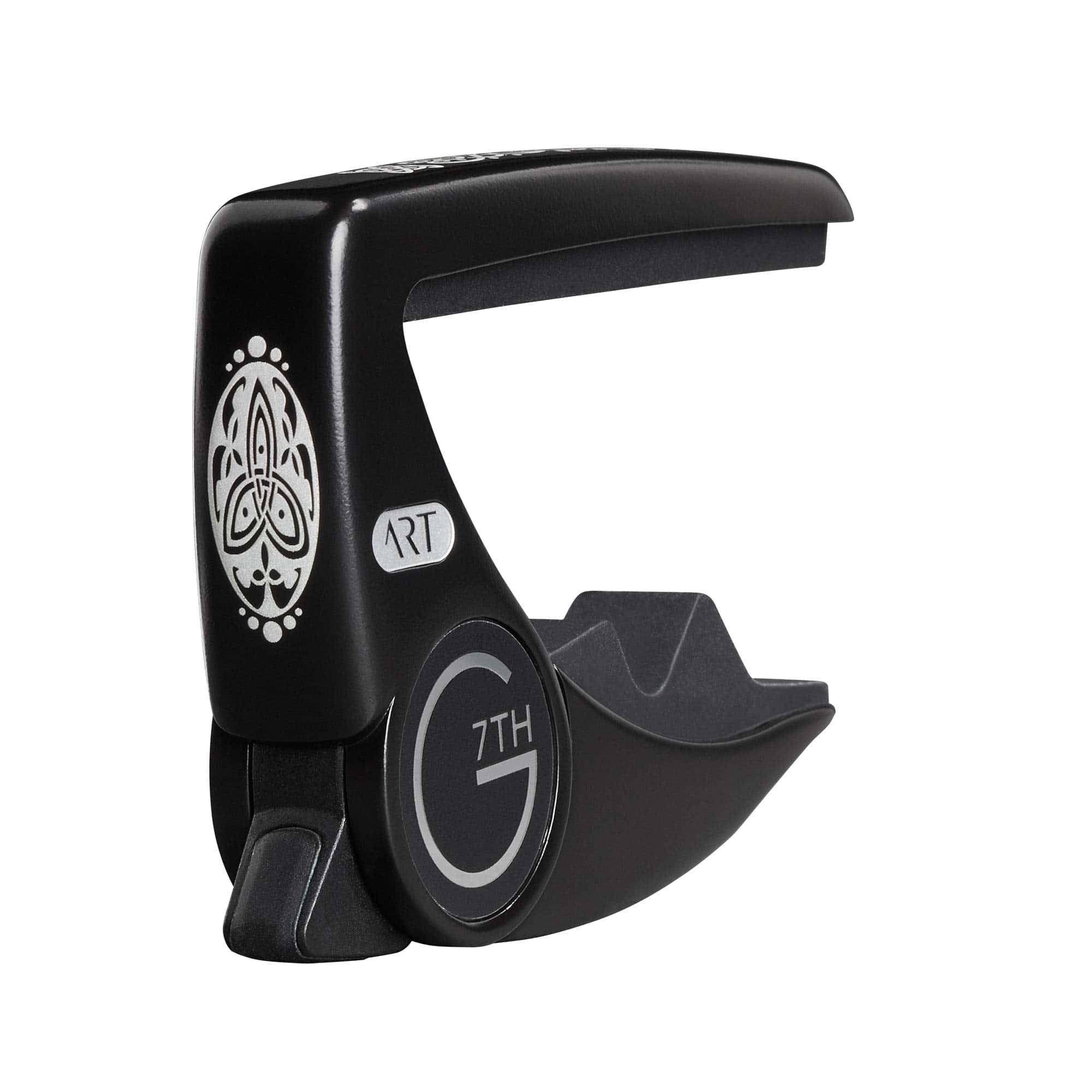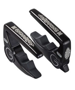 Todos los capotrastos G7th Performance 3 Edición Especial Celta vienen con el innovador sistema ART dentro de la barra superior que se adapta mecánicamente a la verdadera curvatura sobre tus cuerdas y diapasón, ejerciendo presión completamente uniforme en todas las cuerdas, estableciendo un nuevo estándar de uso afinado y libre de zumbidos. Ofrece máxima estabilidad de afinación con la mínima tensión posible en CADA posición, en CUALQUIER mástil de guitarra. Simplemente presiona para colocar y presiona para soltar, el capotrasto Performance 3 brinda control completo e intuitivo sobre la presión que ejerces en tus cuerdas. Ya sea una guitarra acústica o eléctrica, puedes tener la confianza de que estás en control y mantendrás tu guitarra afinada. Una versión grabada muy especial del capotrasto Performance 3 Satin Black con ART incluye un motivo celta grabado por Patrick Gallagher en la parte trasera y barra superior. La música celta se ha tocado durante siglos en una variedad de instrumentos y continúa influyendo en músicos de todo el mundo hoy en día. Entre canciones, puedes colocar fácilmente un capotrasto Performance 3 en el clavijero o justo detrás de la cejuela para un acceso rápido y conveniente. Con almohadillas de silicona protectoras no reactivas en cada punto de contacto, puedes estar seguro de que el acabado de tu instrumento está protegido al usar un capotrasto Performance 3.