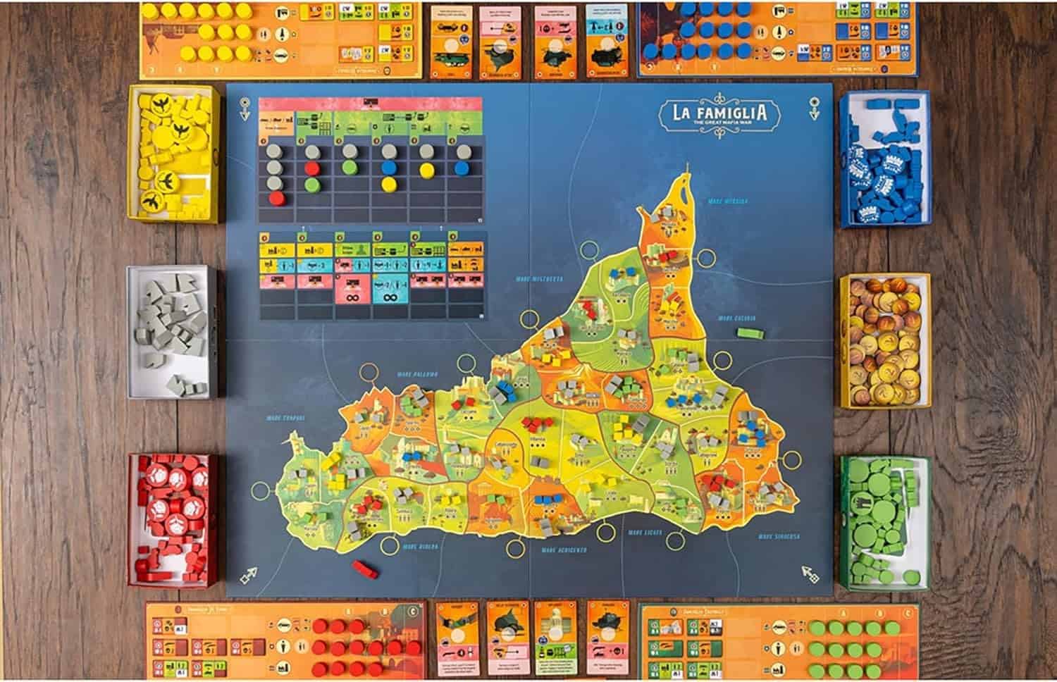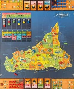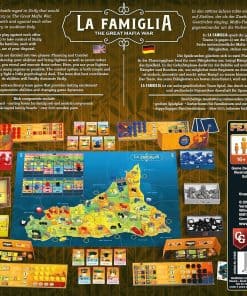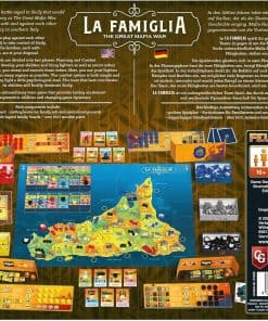 En los años 80, una batalla despiadada se libraba en Sicilia que luego pasaría a la historia como «The Great Mafia War». Diferentes familias de la mafia lucharon entre sí y contra otros por la supremacía en el sur de Italia. En La Famiglia: The Great Mafia War, juegas contra otros en equipos (2 contra 2) para tomar el control de Sicilia. Seis familias de la mafia diferentes, cada una con habilidades especiales, están a tu disposición. Las rondas de juego se dividen en dos fases: En la fase de planificación, desarrollas tus habilidades y colocas luchadores, así como órdenes secretas en el tablero. En la fase de combate, estas órdenes se revelan y ejecutan. Aquí, usas tus luchadores y bombas para dominar la mayor cantidad de regiones posible. El sistema de combate es simple e innovador, haciendo de cada pelea un emocionante duelo psicológico. El equipo que mejor combine y coordine sus habilidades finalmente dominará Sicilia. La Famiglia es un juego de equipo extraordinario que proporciona emoción duradera a través de habilidades asimétricas y una configuración de juego variable.