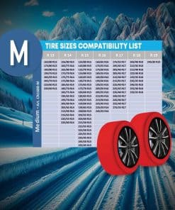 1 kit de 2 cadenas de nieve textiles para coches, silenciosas, sin vibraciones, fáciles y rápidas de instalar, sin dañar los neumáticos. Guantes incluidos en el kit. Para ser utilizado únicamente en carreteras nevadas o heladas, a una velocidad máxima de 40 km/h, aprobado con los estándares EN 16662-1-2020, instalación y desmontaje fácil en 2 minutos, consulte la tabla de compatibilidad en la ficha técnica. Consultar la descripción del producto para la lista completa de tallas compatibles.