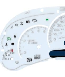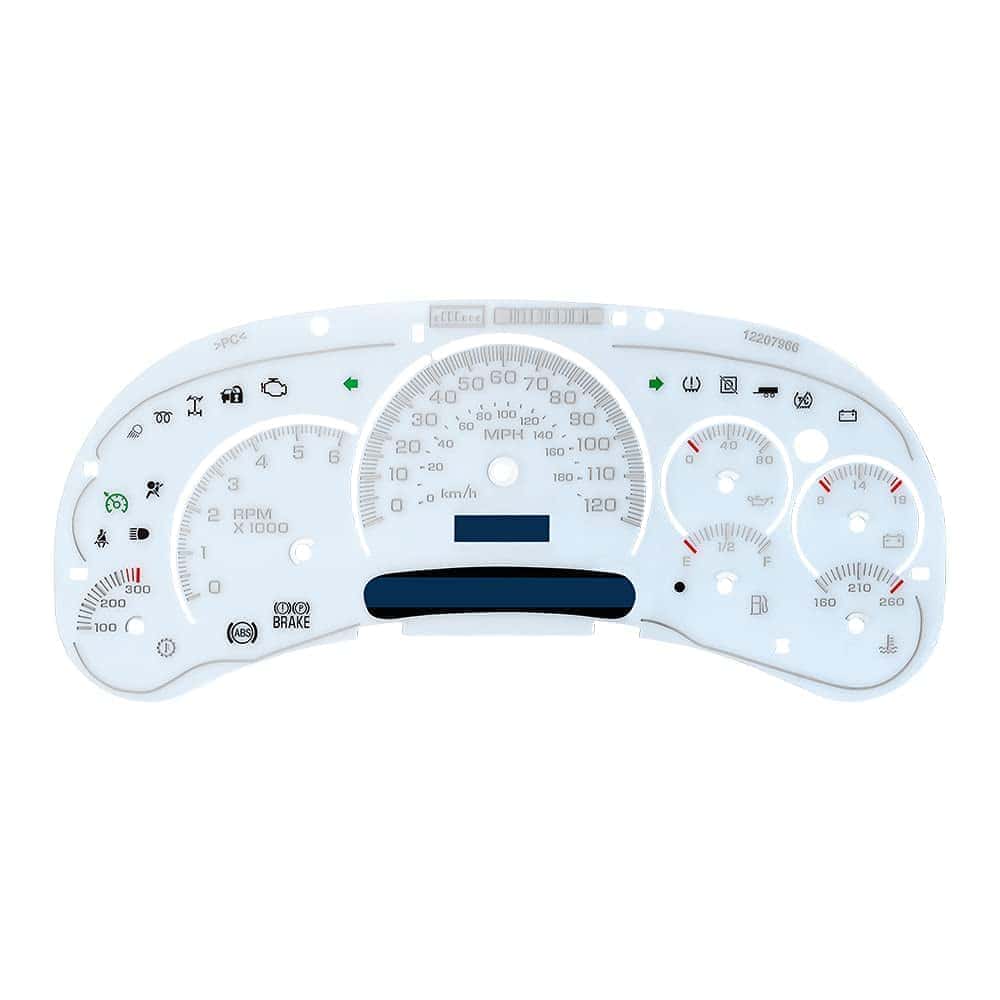 Carátula del Panel de Instrumentos en Blanco con LED Compatible con Temperatura de Transmisión para GM Silverado, Sierra, Tahoe, Yukon, Suburban, Denali, Escalade, Avalanche y H2 Hummers del 2003 al 2005. Compatible con motores de gasolina; transmisiones automáticas. La carátula blanca que vendemos es adecuada para camiones y SUV’s de tamaño completo de GM del 2003 al 2005. Estas son solo para motores de gasolina y son justo lo que necesita si está pensando en convertir de kilómetros a millas o también en agregar el medidor de temperatura de la transmisión a su panel de instrumentos existente. La carátula puede usarse para un grupo de 6 o 7 medidores. La cubierta se puede pegar con pegamento sobre el séptimo medidor (temperatura de transmisión) si solo necesita un grupo de 6 medidores. Esta es la versión LED que tiene los números impresos claramente, lo que permite que los LED brillen en el color de LED que elija. Si está planeando instalar LED para escalas de colores diferentes en su grupo, esta carátula es la mejor opción. Lo que vendemos es solo la carátula del medidor, no el grupo de instrumentos completo que solo sirve para mostrar la escena de aplicación.