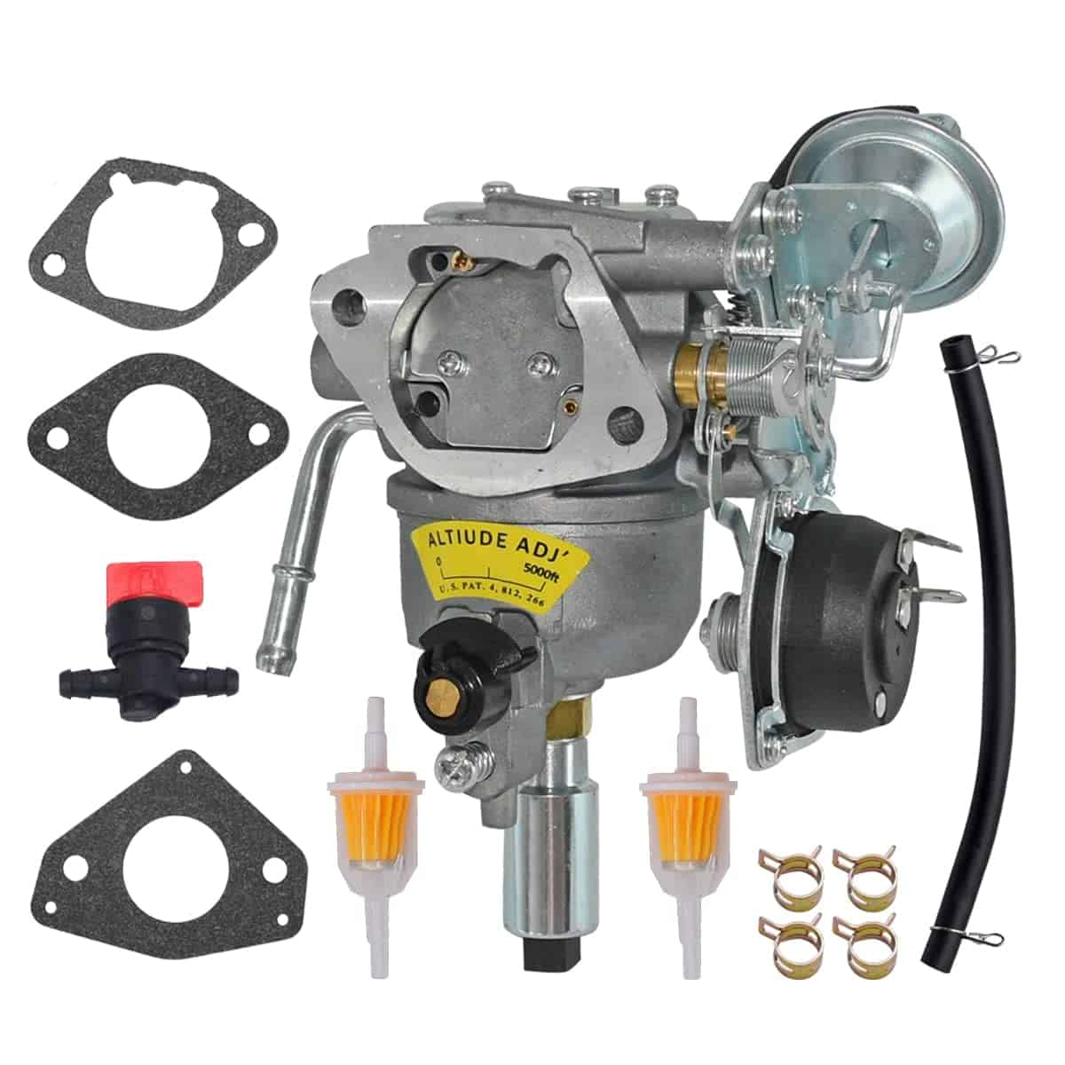 Incluye 1 kit de carburador como se muestra en la imagen: 1 carburador, 3 empaques, 2 filtros de combustible, 1 válvula de corte de combustible, 1 línea de combustible, 4 abrazaderas.