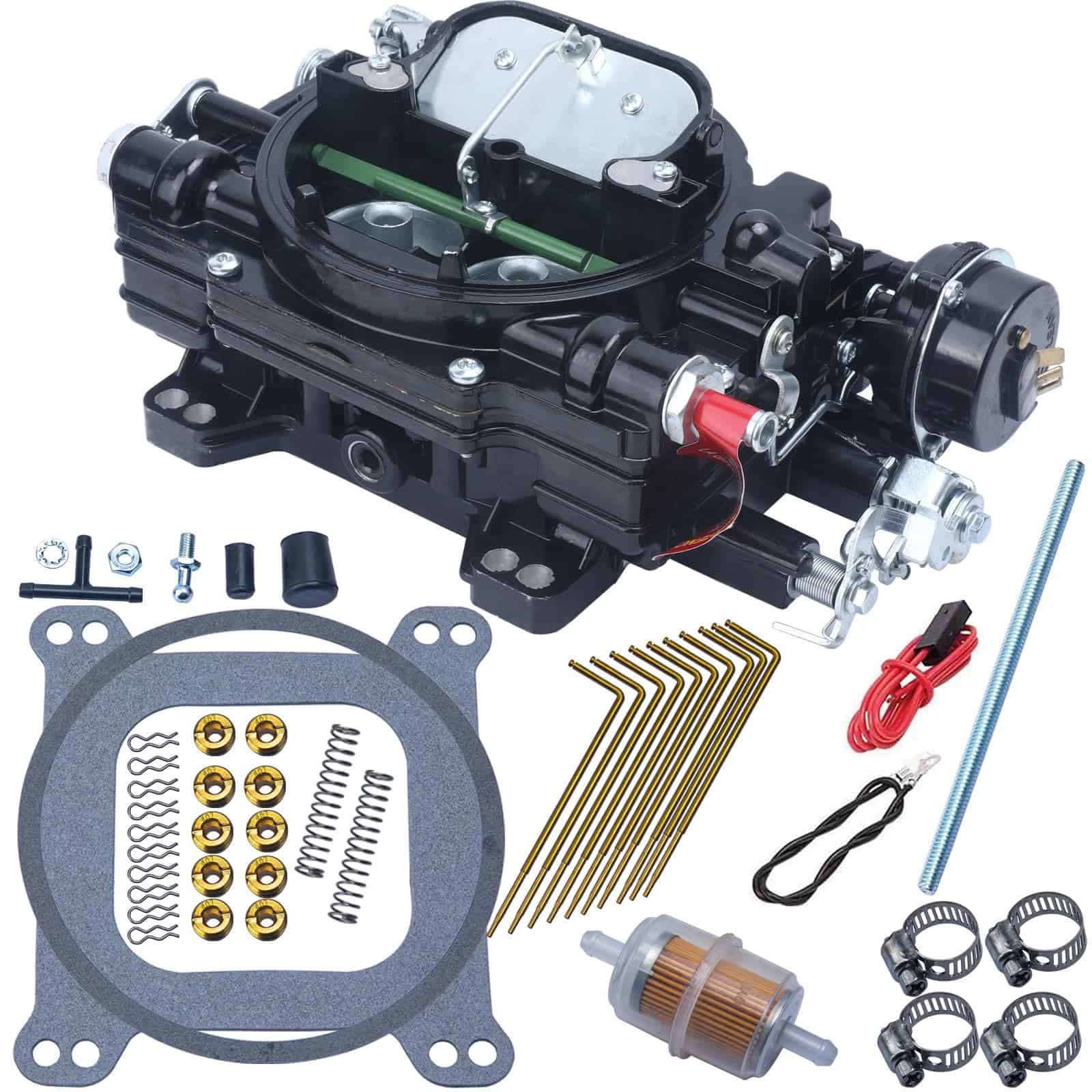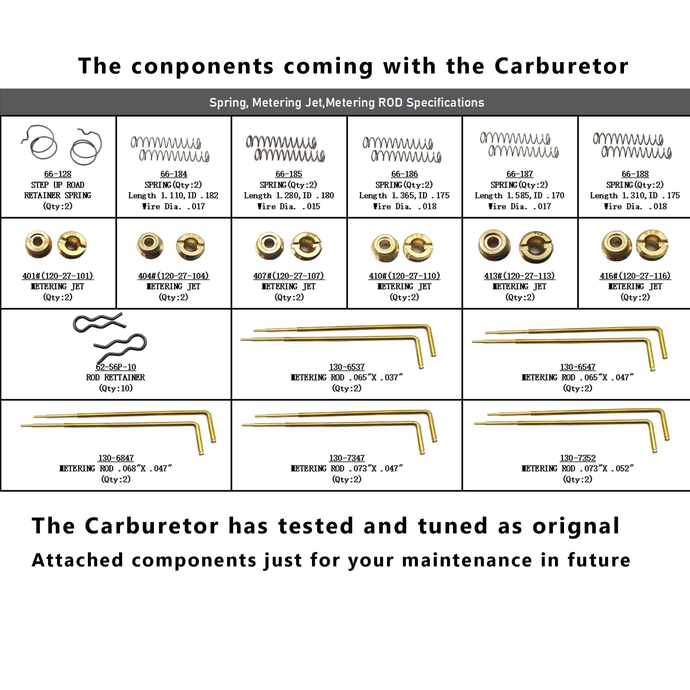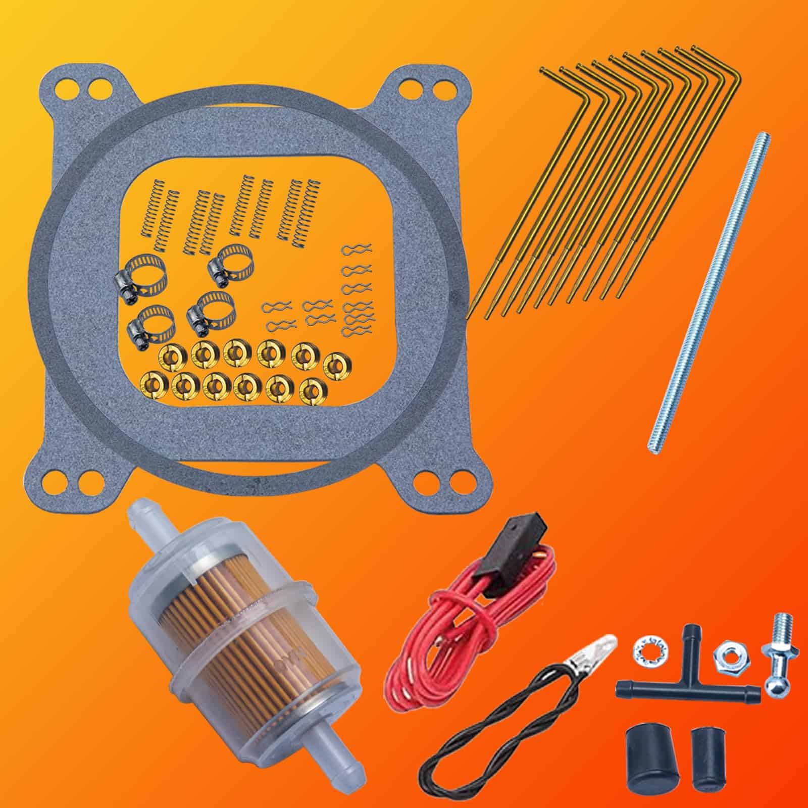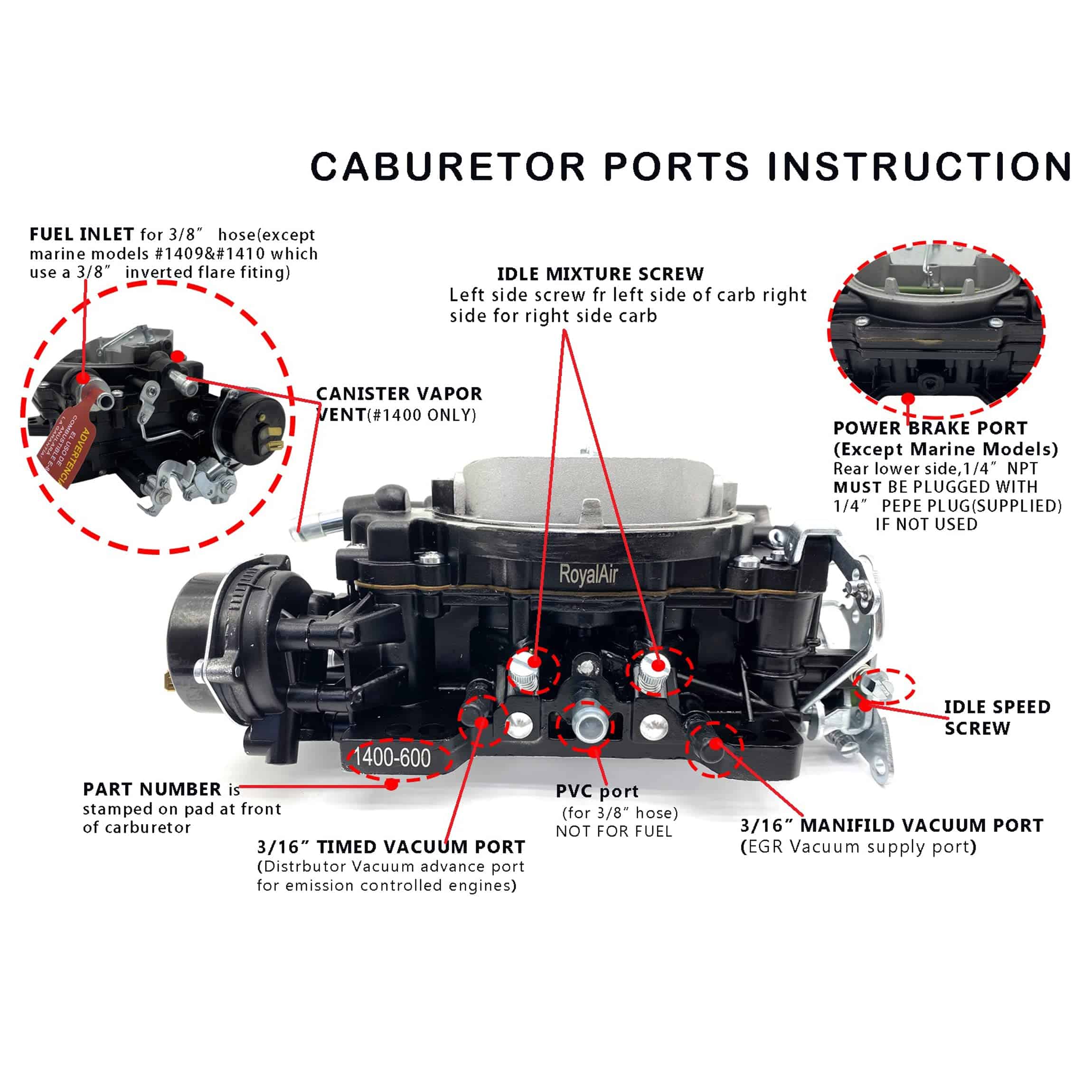 El nuevo Carburador cuadrado de estrangulador eléctrico de válvula de aire Performer de RoyalAir presenta una construcción de aluminio de dos piezas para temperaturas de funcionamiento más frescas y menos deformación. Está diseñado y calibrado para un buen rendimiento en carretera y economía de combustible en motores de 402 CID y más grandes con los múltiples de admisión Performer de RoyalAir. No hay juntas debajo del nivel del depósito de combustible para menos fugas y no hay partes de plástico o válvulas de potencia para explotar. El carburador de estrangulador eléctrico incluye puertos de vacío tanto temporizados como de vacío completo para avance de encendido. Los carburadores utilizan varillas de medición fácilmente cambiables para una sintonización precisa. El carburador se ha probado antes de enviarlo. El paquete incluye: 1. un nuevo cuerpo de carburador 1403-500 2. todas las piezas del kit para la instalación 3. Cepillos y agujas de limpieza de carburador. 4. Piezas de mantenimiento para su respaldo Jet de medición, Varilla de medición, Resortes, Agujas, Tornillos También puede ver todos los componentes en la primera imagen, la línea de alimentación de aceite y los lazos de nylon en el paquete también.