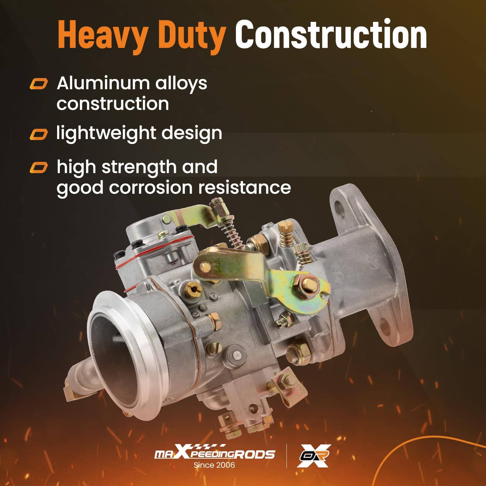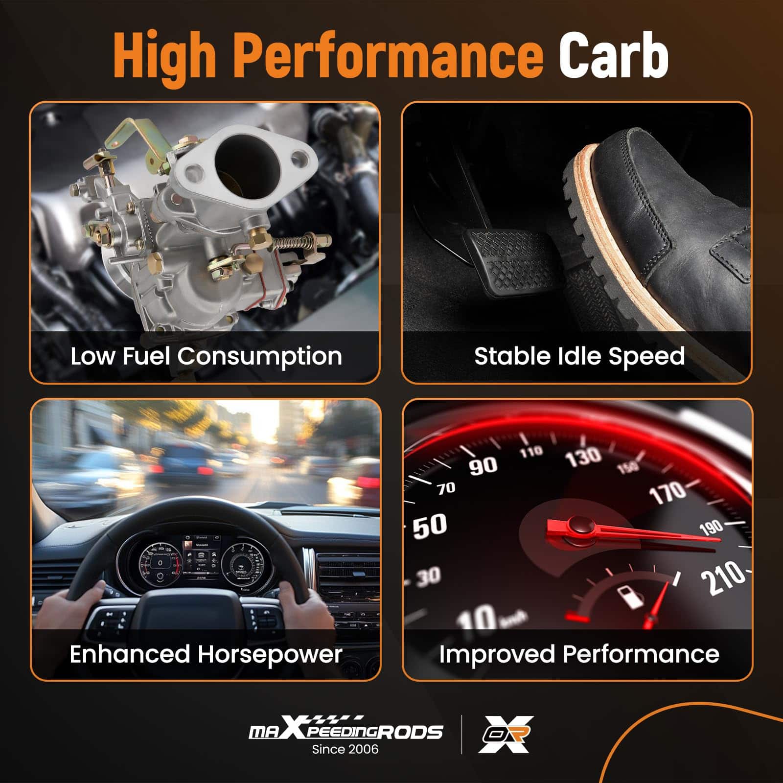 Carburador de 1 Barril maXpeedingrods para Jeep F-head 4 Cilindros CJ5 CJ6 CJ3B 1955-1975 / Willys 1954-1958 923808 17701.02. Este carburador de reemplazo se ajusta perfectamente a una variedad de modelos Jeep, incluyendo Jeep CJ5, CJ6, CJ3B fabricados entre 1955-1975, así como Willys Jeeps fabricados entre 1954-1958 con motores de 4 cilindros F-head. El paquete incluye un carburador y una junta de montaje para una fácil instalación. Construido con aluminio de alta calidad, este carburador ofrece resistencia a la corrosión y una vida útil más larga. Diseñado para mejorar el rendimiento del motor al mezclar adecuadamente aire y gasolina, este carburador proporciona una nueva potencia a tu vehículo. Además, mejora el consumo de combustible y garantiza un arranque rápido. Con una velocidad de ralentí estable, permite una mejor experiencia de manejo y maniobrabilidad. Disfruta de un motor más eficiente y potente con este carburador de maXpeedingrods.