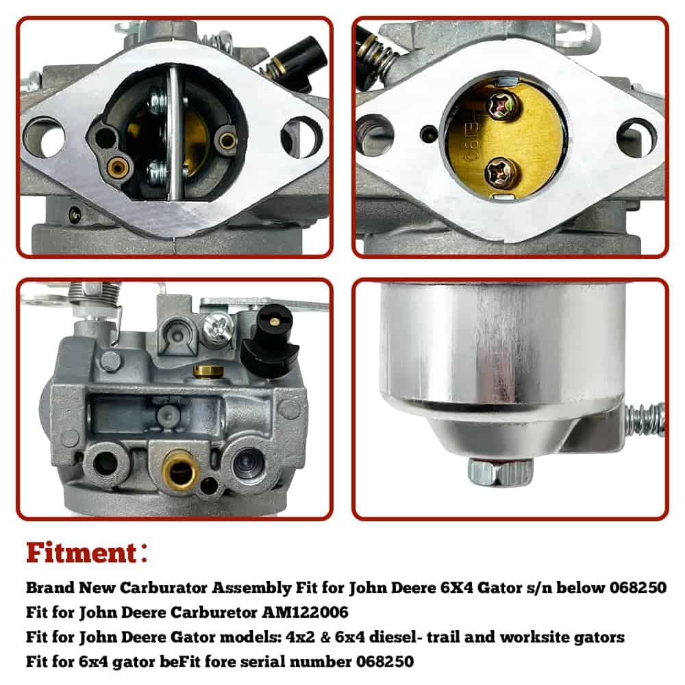 Este carburador es nuevo en la caja y reemplazará un carburador en un Gator 6×4 marcado como 32256, 32214 o 32429. Números de parte: AM118740 y AM121391