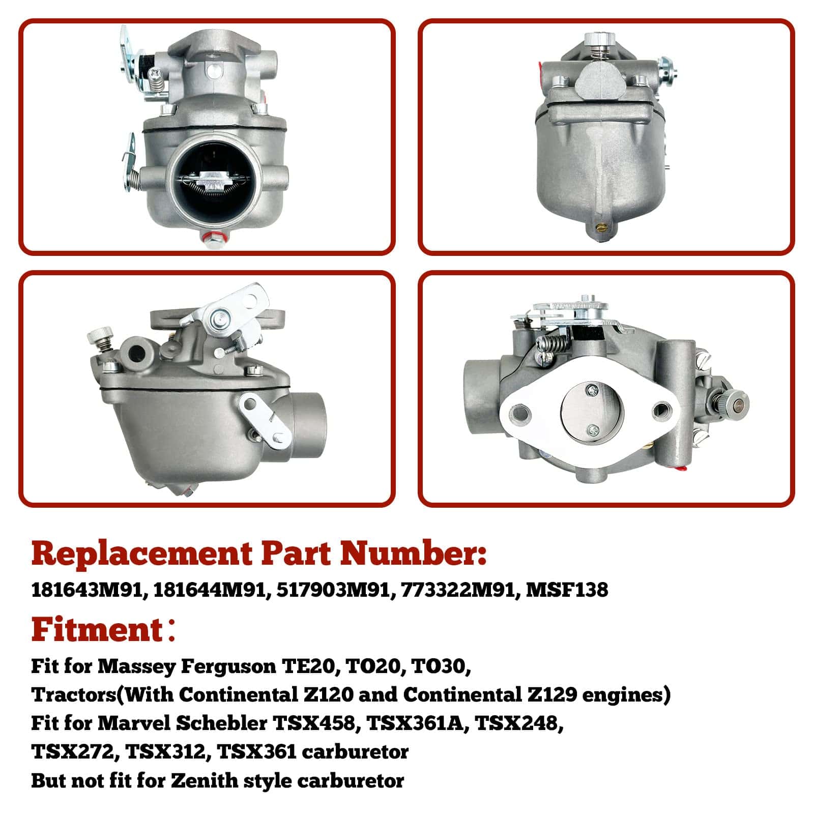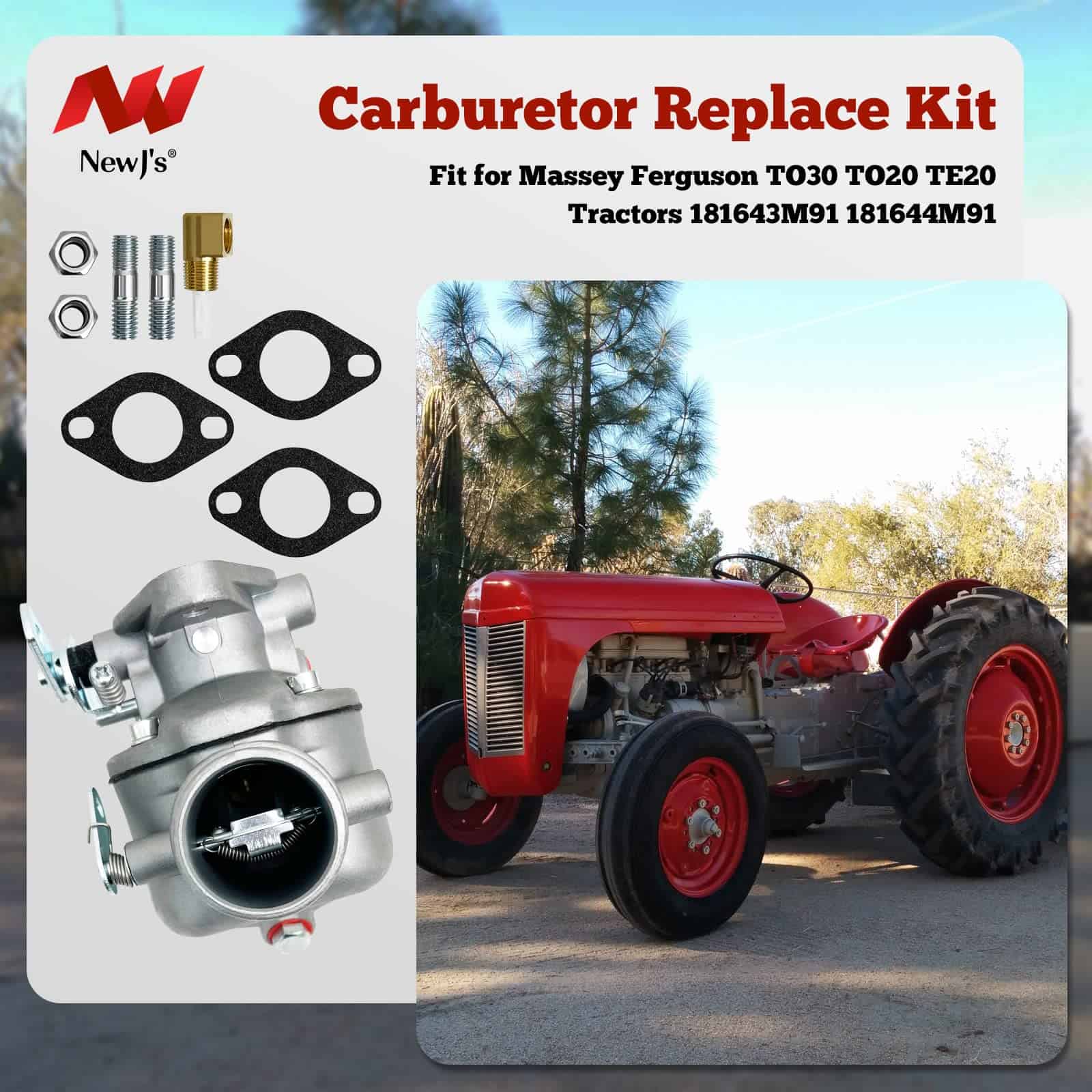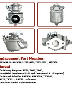 Carburador de repuesto NewJ’s para tractores Massey Ferguson TO30 TO20 TE20. Este carburador se ajusta a los modelos de tractores antes mencionados y es compatible con los modelos Marvel Schebler TSX458, TSX361A, TSX248, TSX272, TSX312, TSX361. Incluye los números de parte 181643M91 y 181644M91, con un perno de montaje de 2-3/8″ de centro a centro. El paquete incluye 1 carburador para su conveniencia. En caso de cualquier problema, ofrecemos reemplazo gratuito o opción de devolución para garantizar su satisfacción con el producto.