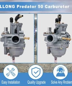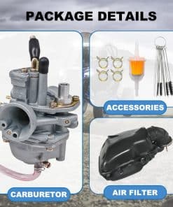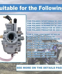 Compatibilidad con Carburador para Polaris Predator 50 2004-2007, Polaris Predator 90 2003-2007, Polaris Scrambler 50/90 2001-2003, Polaris Sportsman 90 2001-2006. Especificaciones: Diámetro Interior del Lado de Admisión: 3/4″ (19mm), Diámetro Exterior del Lado de Admisión: 15/16″ (23mm), Diámetro Interior del Montaje del Filtro de Aire: 1-1/4″ (31mm), Diámetro Exterior del Montaje del Filtro de Aire: 1-1/2″ (37mm). Incluye: 1 Carburador, 1 Caja de Filtro de Aire, 1 Línea de Combustible, 1 Filtro de Combustible, 4 Abrazaderas, 1 Kit de Herramientas para Limpiar Chorros de Carbón. Este Carburador Nuevo de Alta Calidad cumple con las Especificaciones Profesionales para un Rendimiento Estable y Duradero. Fácil de Instalar, Estructura Simple y Clara que Ahorra Tiempo. Servicio al Cliente Disponible para Preguntas y Respuestas en un Plazo de 24 Horas