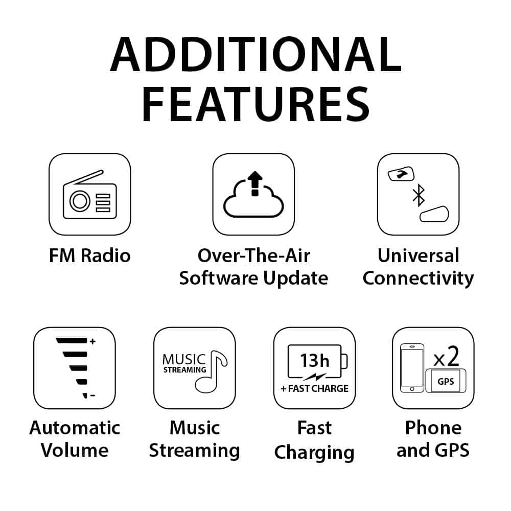 Experimenta una intercomunicación Bluetooth cristalina como nunca antes. Nuestro intercomunicador de banda ancha cubre a 2 jinetes en un rango de hasta 600m. Potentes altavoces HD de 40 mm, procesador avanzado y 3 perfiles de sonido únicos transformarán cualquier paseo. Resistente al agua: sin importar lo que le arrojes, tu Spirit HD resistente al agua soportará los golpes y te mantendrá conectado. Actualizaciones de software por aire: Mantén siempre actualizada tu unidad a través de la aplicación Cardo Connect. Descarga actualizaciones de software por aire cada vez que haya una nueva versión disponible. Radio FM incorporada con RDS para selección automática de la señal más fuerte ya sea que estés en la ciudad o en medio de la nada. Conectividad universal: Conecta con cualquier otro auricular Bluetooth de cualquier marca. Volumen automático: Ajusta automáticamente el volumen del sonido en función del ruido ambiental exterior. Transmisión de música: Toda la música que desees se transmite directamente desde tu teléfono inteligente. Controla, comparte y experimenta tu canción favorita en la carretera. Teléfono y GPS: Realiza llamadas y controla tu GPS con un toque de dedo o la voz. Carga rápida: ¿Se está agotando la batería? Obtén 2 horas de tiempo de conversación después de 20 minutos de carga. USB tipo C robusto y universal para conexiones fáciles a cualquier dispositivo.