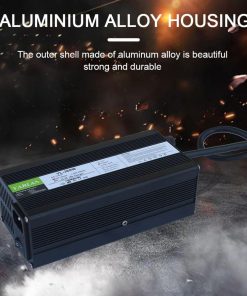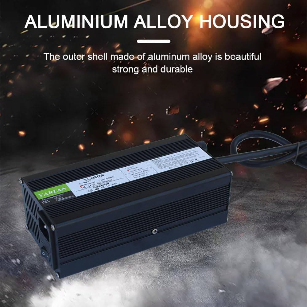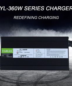 Especificaciones: Modelo: YL-360W. Dimensiones: 180x90x63mm. Tipo de batería: Batería LiFePO4. Potencia de trabajo: 100-120Vac, 50 ~ 60Hz. Voltaje de salida: 14.6V (Para batería LiFePO4 de 4S). Corriente de salida: 20A. Protección de la batería: SCP, OVP, OCP, OTP. Modo de carga: corriente constante – voltaje constante – trickle (carga flotante) carga inteligente de tres etapas. Eficiencia de carga: 85% (carga completa). Temperatura de trabajo: -5 ~ +40. Temperatura de almacenamiento: -40 ~ +70. Cable de alimentación AC, conector DC se pueden personalizar. Instrucciones de funcionamiento: 1. Antes de cargar, conecte primero el terminal DC a la batería y luego conecte el terminal AC. 2. Después de completar la carga, desconecte primero el terminal AC y luego el terminal DC. 3. No cargue o después de completar la carga, asegúrese de desconectar primero el terminal DC y luego el terminal AC. Indicador LED: LED 1 rojo: Encendido. LED 2 rojo: Batería en carga. LED 2 parpadea: La batería se cargará por completo pronto. LED 2 verde: La batería ha sido cargada por completo. Paquete: 1 cargador 14.6V 20A, 1 cable de alimentación estándar de EE.UU., 1 manual de funcionamiento, 2 fusibles de repuesto.