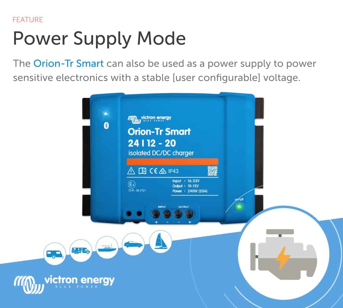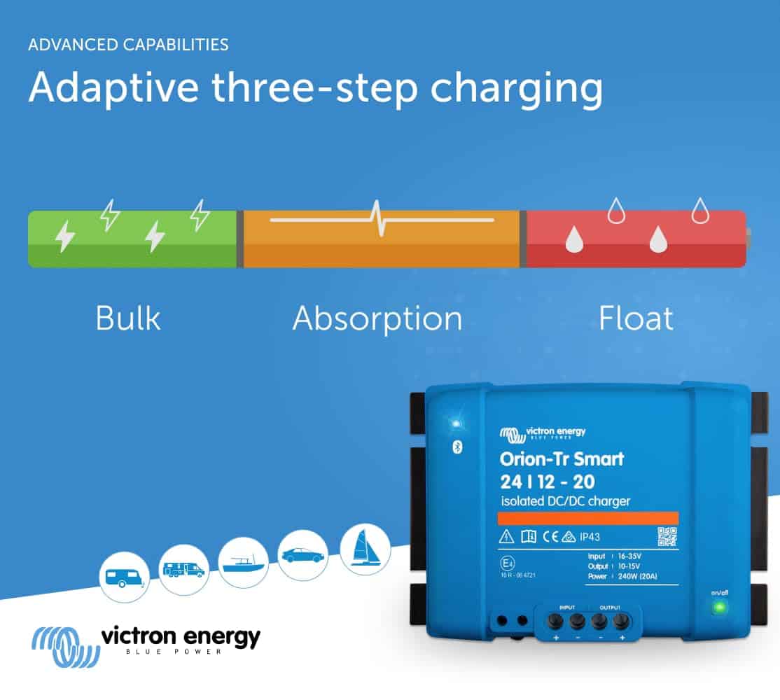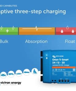 El cargador DC-DC Orion-Tr Smart es un cargador adaptativo de 3 etapas profesional con Bluetooth integrado. Diseñado para sistemas de doble batería en vehículos o embarcaciones donde el alternador (inteligente) y la batería de arranque se utilizan para cargar la batería de servicio. El cargador se puede monitorear y programar a través de Bluetooth y puede ser controlado remotamente con un interruptor de encendido/apagado remoto. El Orion Tr-Smart puede ser utilizado en sistemas de 12V o 24V y es adecuado para baterías de plomo ácido y de litio. Modelos disponibles de hasta 400 W y se pueden conectar múltiples unidades en paralelo para aumentar la potencia de salida. Adecuado para altas temperaturas de hasta 55 C con una salida nominal de hasta 40 C.
