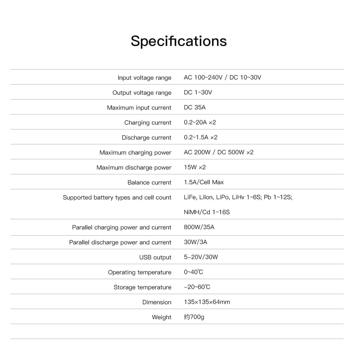 Tipos de batería admitidos y recuento de celdas: LiFe, Lilon, LiPo 1~6S, LiHv 1-6S, Pb 1-12S, NiMH/Cd 1-16S