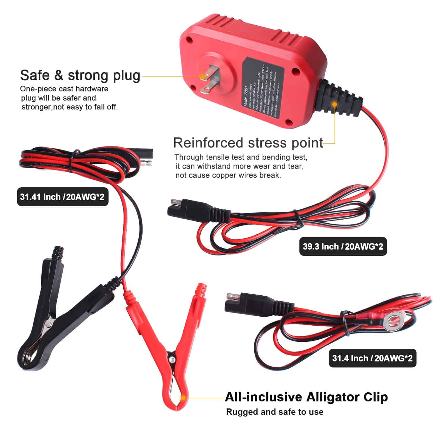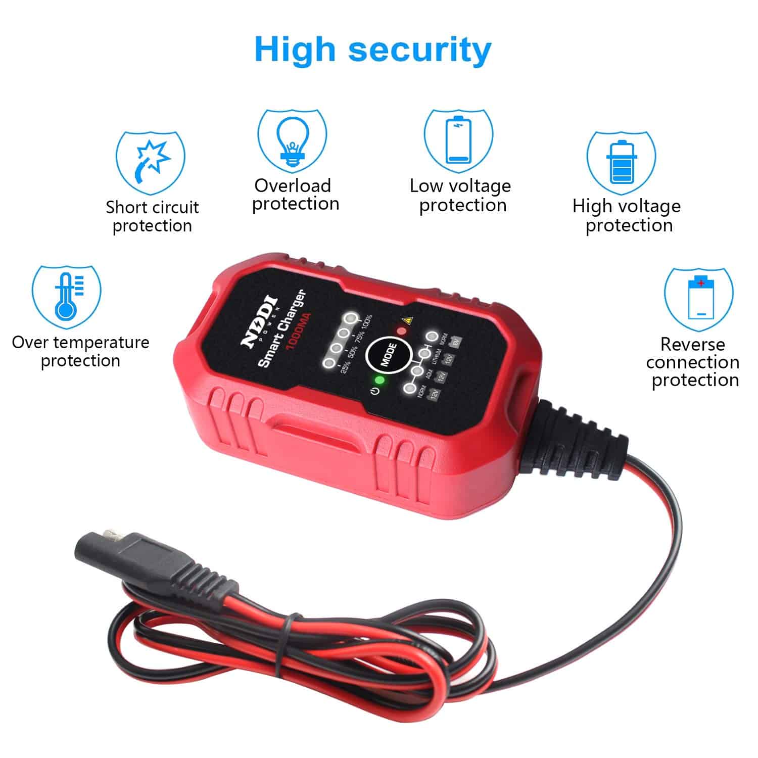 2. Múltiples Protecciones: Este cargador de batería ofrece protección contra polaridad inversa, protección contra sobrecalentamiento, protección contra sobrecarga, protección contra cortocircuitos, protección de bajo y alto voltaje. Extiende eficazmente la vida de la batería.