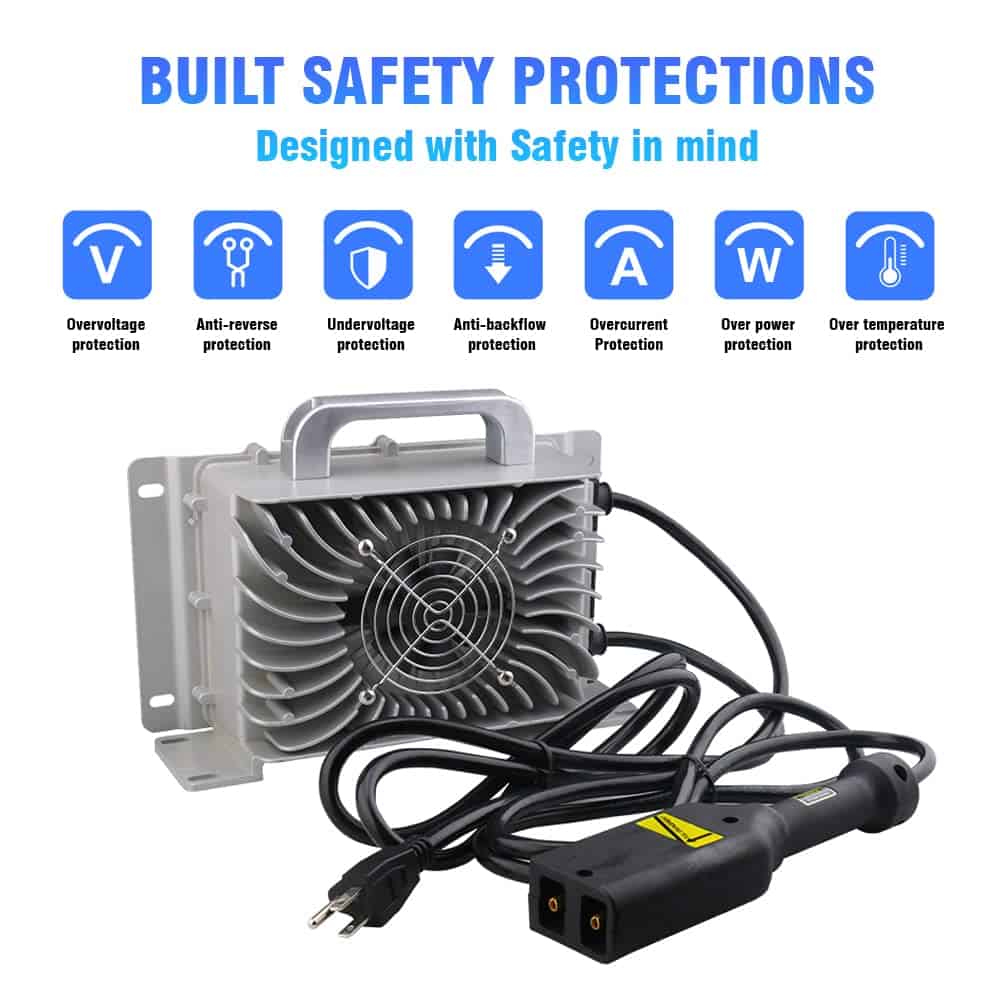 El Cargador de Batería para Carro de Golf de 36V 20A con Enchufe Tipo D es perfecto para cargar rápidamente carros de golf EZGO RXV/TXT de 36V. Con modo de carga lenta y apagado automático cuando está completamente cargado, nunca sobrecargará ni subcargará la batería de su carro de golf. Este cargador es seguro y duradero, con protección contra sobrecorriente, sobre voltaje y cortocircuitos. Además, su carcasa está hecha de aleación de aluminio de alta calidad para una mayor durabilidad. Con clasificación de resistencia a la intemperie IP68, este cargador es resistente al agua y al polvo, lo que garantiza una carga segura y eficiente. Antes de comprar, asegúrese de que su Carrito de Golf EZGO sea compatible.