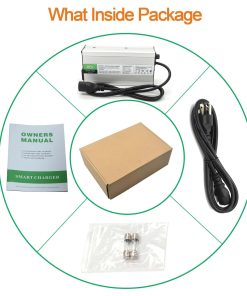 Cargador de batería de ácido de plomo de 72V y 8A con diseño de carcasa de aluminio, hermosa y duradera. Diseñado con ventilador de refrigeración para una mejor disipación del calor durante la carga. Modo de carga inteligente de tres etapas: Corriente constante – Voltaje constante – Carga flotante para garantizar que la batería se cargue completamente. Con indicador LED, luz roja significa cargando, luz verde significa completa. Protección contra sobretensión, protección contra sobrecorriente, protección contra cortocircuitos, protección contra inversión de polaridad.