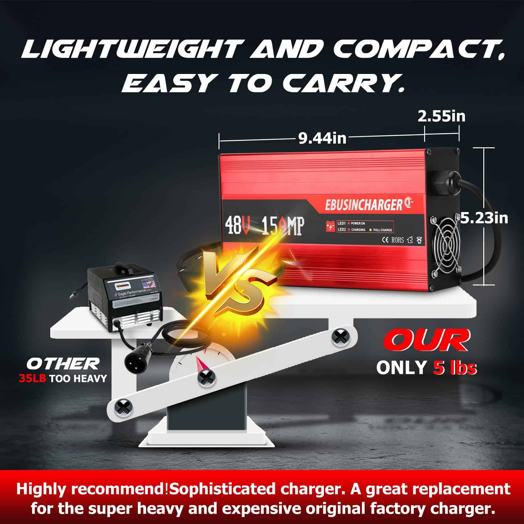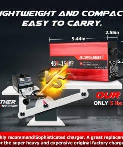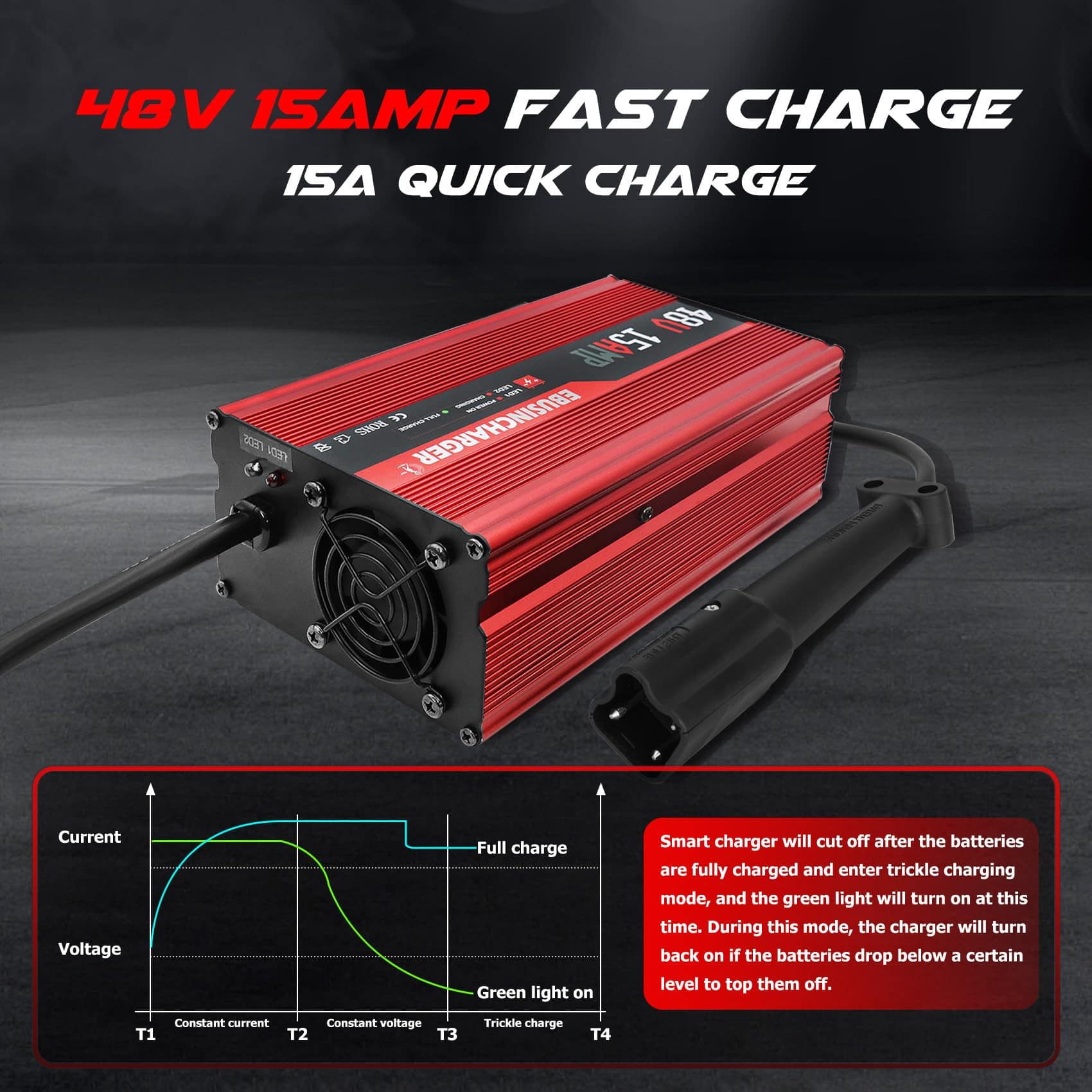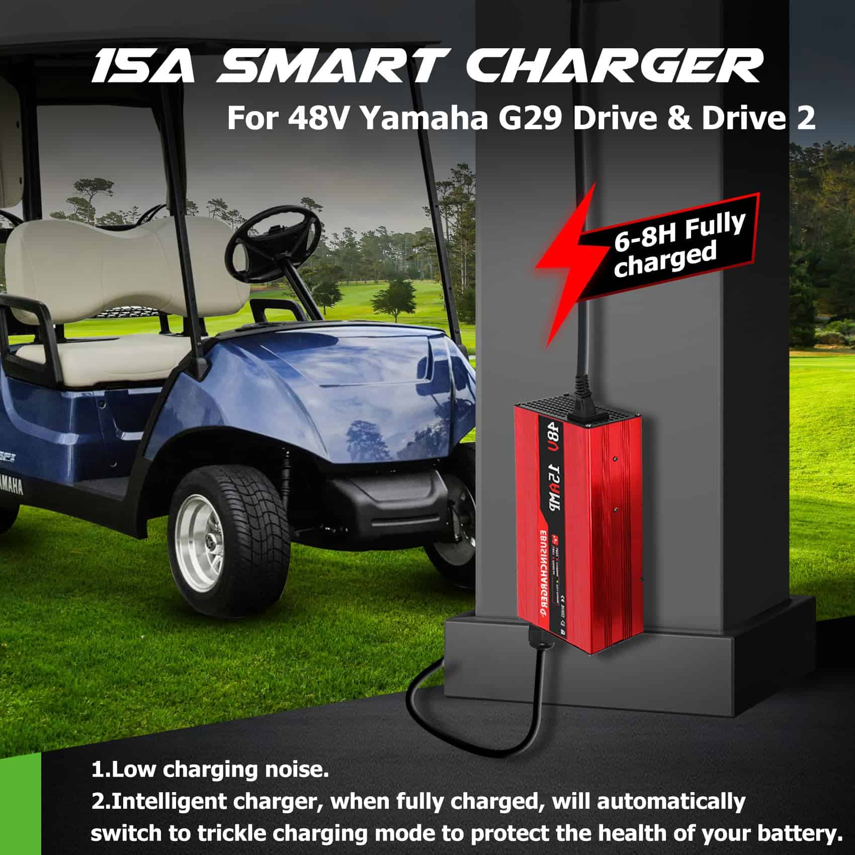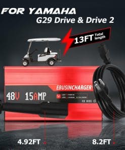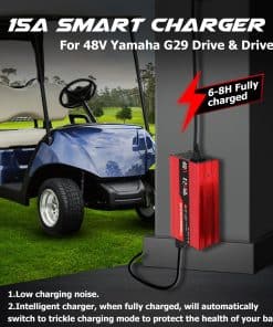 Cargador de Carro de Golf de 48 voltios para los carros de golf Yamaha G29 Drive & Drive 2. Carga rápida: ¡El cargador inteligente de Carro de Golf de 48 Voltios y 15 Amperios puede cargar completamente su carro de golf en 6-8 horas! Carga 3-4 veces más rápido que un cargador de 5 amperios, ¡ahorrándote tiempo! Nota: El tiempo de carga depende de la capacidad de la batería de plomo-ácido. Carga inteligente: Cuando la carga está completa, la luz verde se enciende. En este punto, el cargador deja de cargar y entra en modo de goteo. En este modo, cuando el nivel de la batería está por debajo del 80%, el cargador se encenderá automáticamente para cargar la batería. Fácil de usar: Peso portátil de 5.5 libras. La longitud del cable de salida de 4.9 pies y el cable de alimentación utilizable de 8.2 pies le permiten conectarse fácilmente al carro de golf para cargar. Por lo que no necesitas mover el cargador «pesado» en ningún momento. Alta calidad: El cargador de carro de golf de yamaha de 48 voltios con certificación CE y RoHS es el ayudante perfecto para su carro de golf. El modo de carga inteligente puede hacer que su batería tenga una vida más larga.