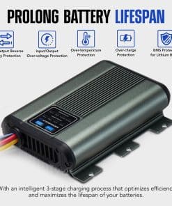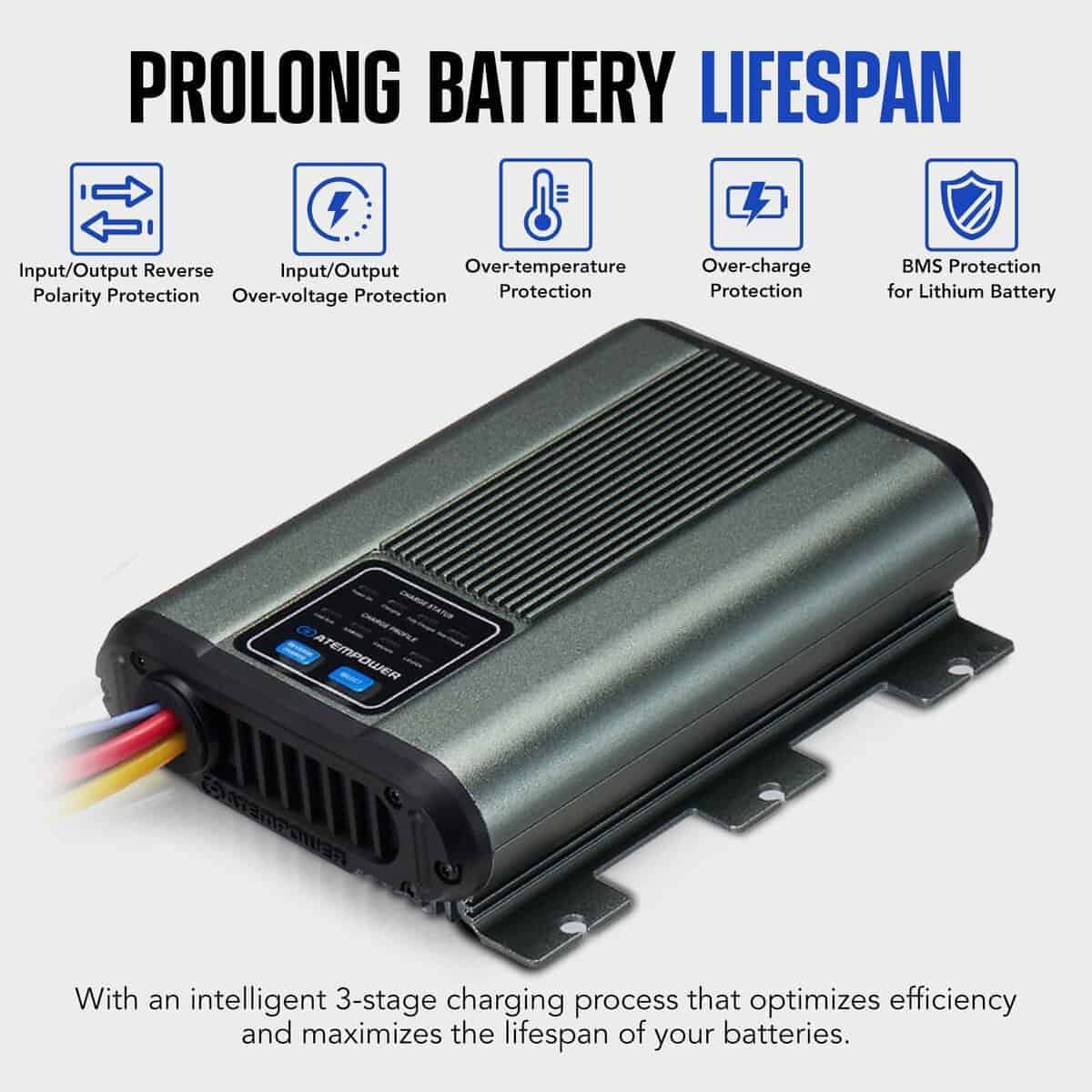 3. Amplía al Máximo la Vida Útil de la Batería: Acepta nuestro avanzado cargador de CC a CC con un proceso de carga inteligente de 3 etapas que optimiza la eficiencia y maximiza la vida útil de tus baterías. Esto asegura que permanezcan en óptimas condiciones durante períodos prolongados. Además, nuestro cargador cuenta con un modo inteligente de LiON que activa automáticamente tu batería LiFePO4 dormida, garantizando un uso prolongado y confiable.