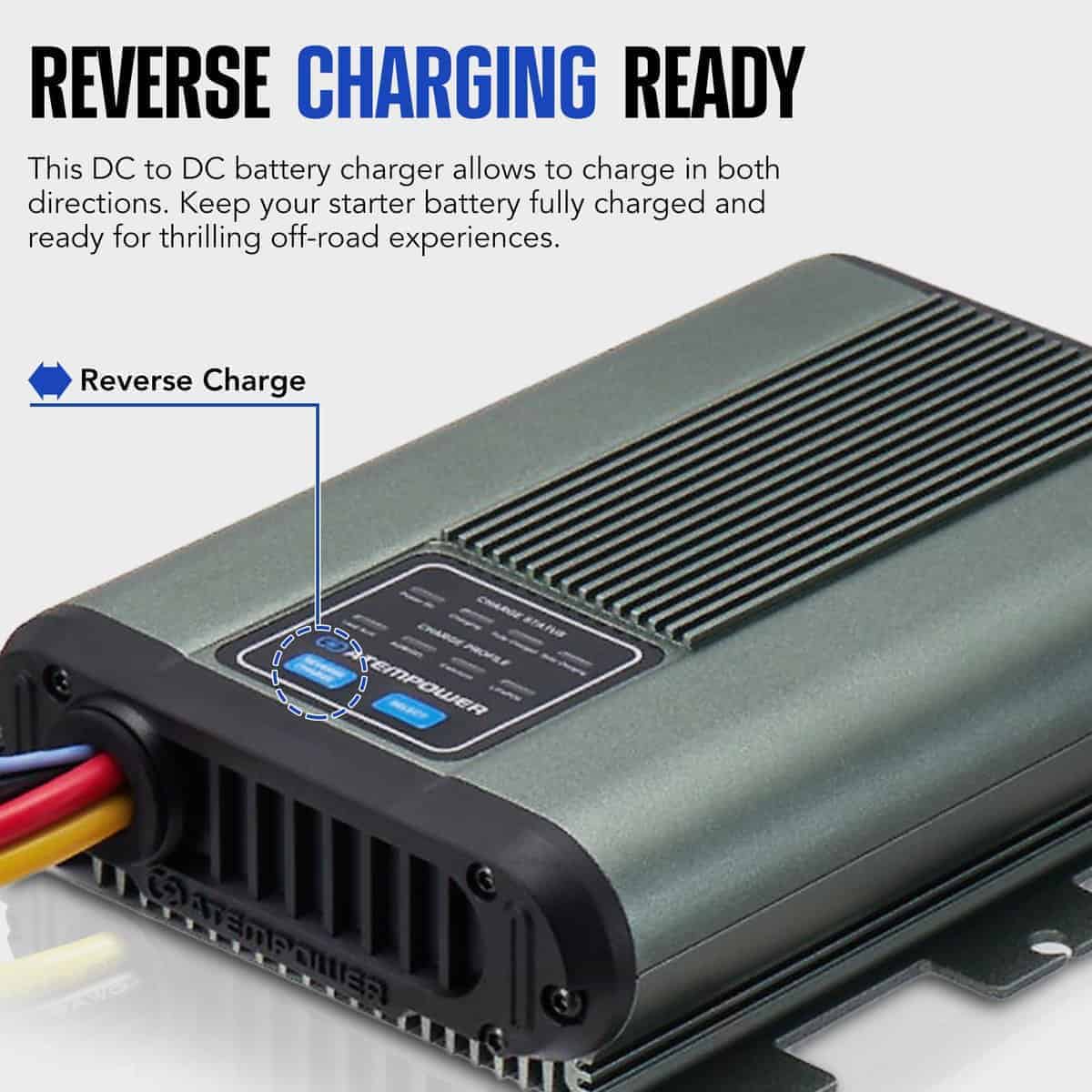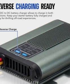1. Listo para Carga Inversa: Toma el control de tus aventuras todoterreno con nuestro cargador de batería de CC a CC. Nuestro cargador de batería de CC a CC es una creación versátil, que te permite cargar en ambas direcciones. Simplemente activa el botón de carga inversa para revivir sin esfuerzo una batería de arranque baja usando tu batería auxiliar. Mantén tu batería de arranque completamente cargada y lista para emocionantes experiencias todoterreno.