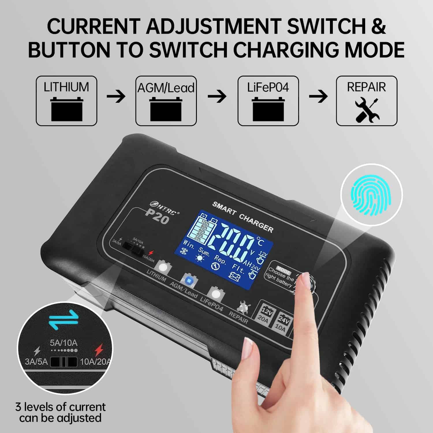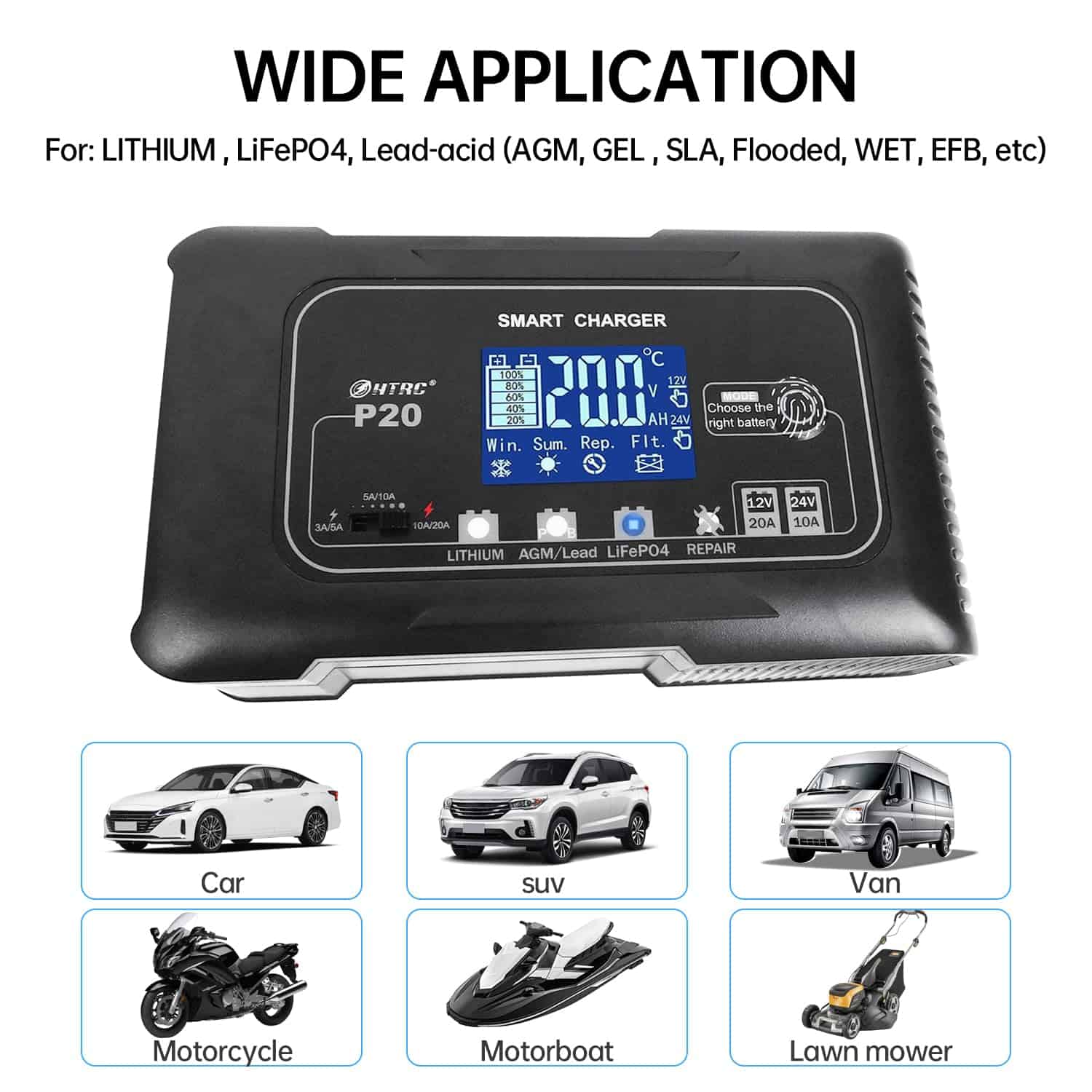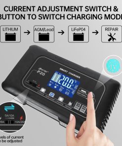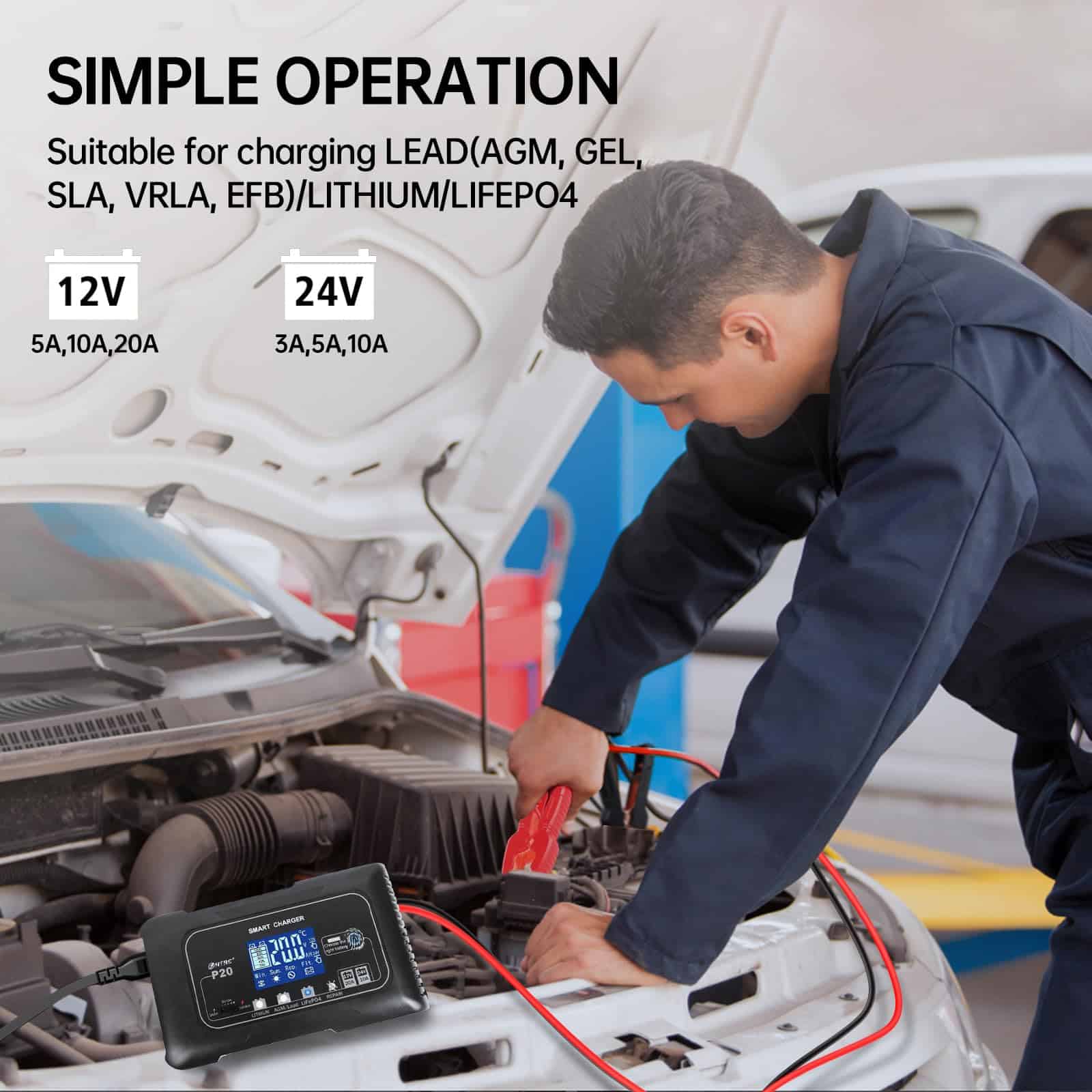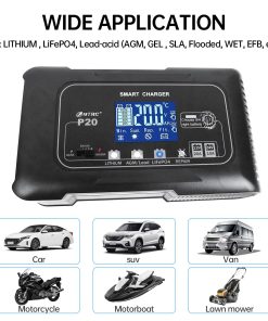 Cargador de batería inteligente de 20 amperios para automóvil, barco, motocicleta, cortacésped, 12V/20A y 24V/10A. Este cargador de batería de alta potencia es perfecto para una amplia variedad de aplicaciones, gracias a su identificación inteligente que permite una carga rápida sin dañar la batería. Cuenta con un botón de bloqueo automático después de 10 segundos para evitar operaciones incorrectas. Compatible con diferentes tipos de baterías, como litio, LifePO4, ácido de plomo (AGM / GEL / EFB, MF, batería inundada, VRLA, SLA, batería húmeda), este cargador es adecuado para automóviles, camiones, motocicletas, SUVs, carros de golf, vehículos agrícolas y barcos. Con funciones de protección y reparación de la batería, este cargador identifica automáticamente el estado de la misma. Además, cuenta con la función de carga automática, que extiende la vida útil de la batería y ajusta automáticamente la corriente de carga según sea necesario. El paquete incluye el cargador inteligente, cable de corriente de 3 m, cable de pinza, manual y 2 orejetas de cable para una fácil instalación y uso.