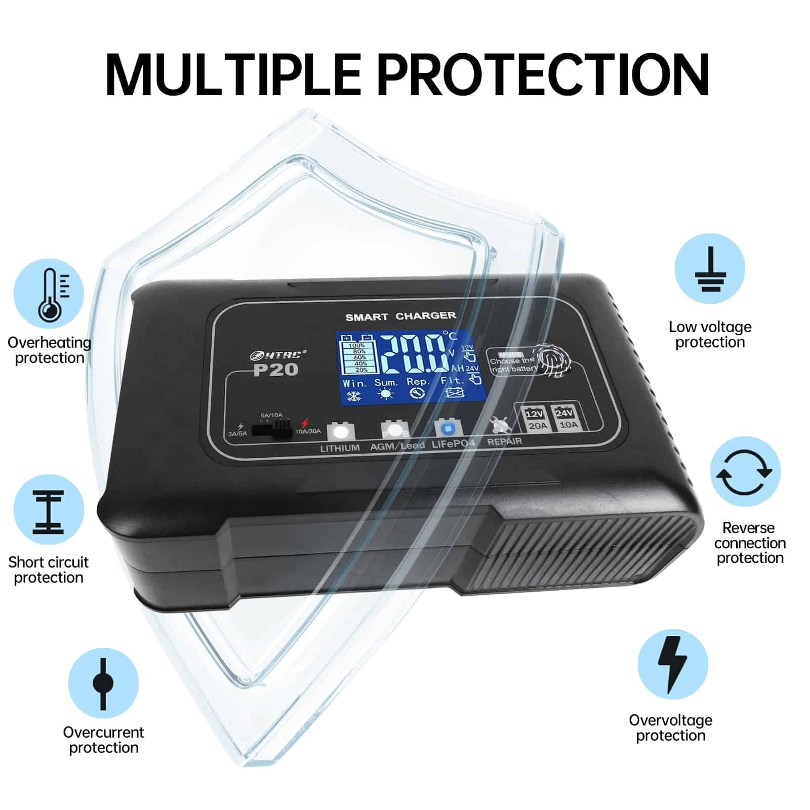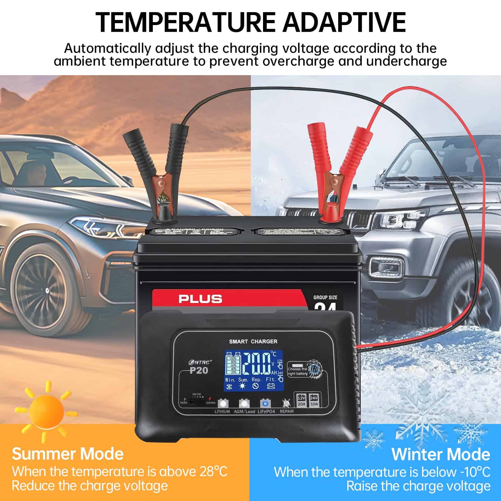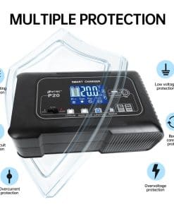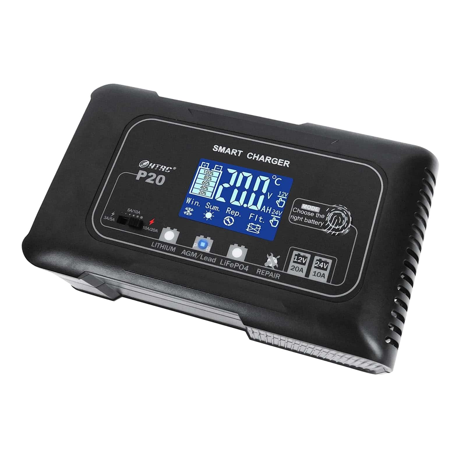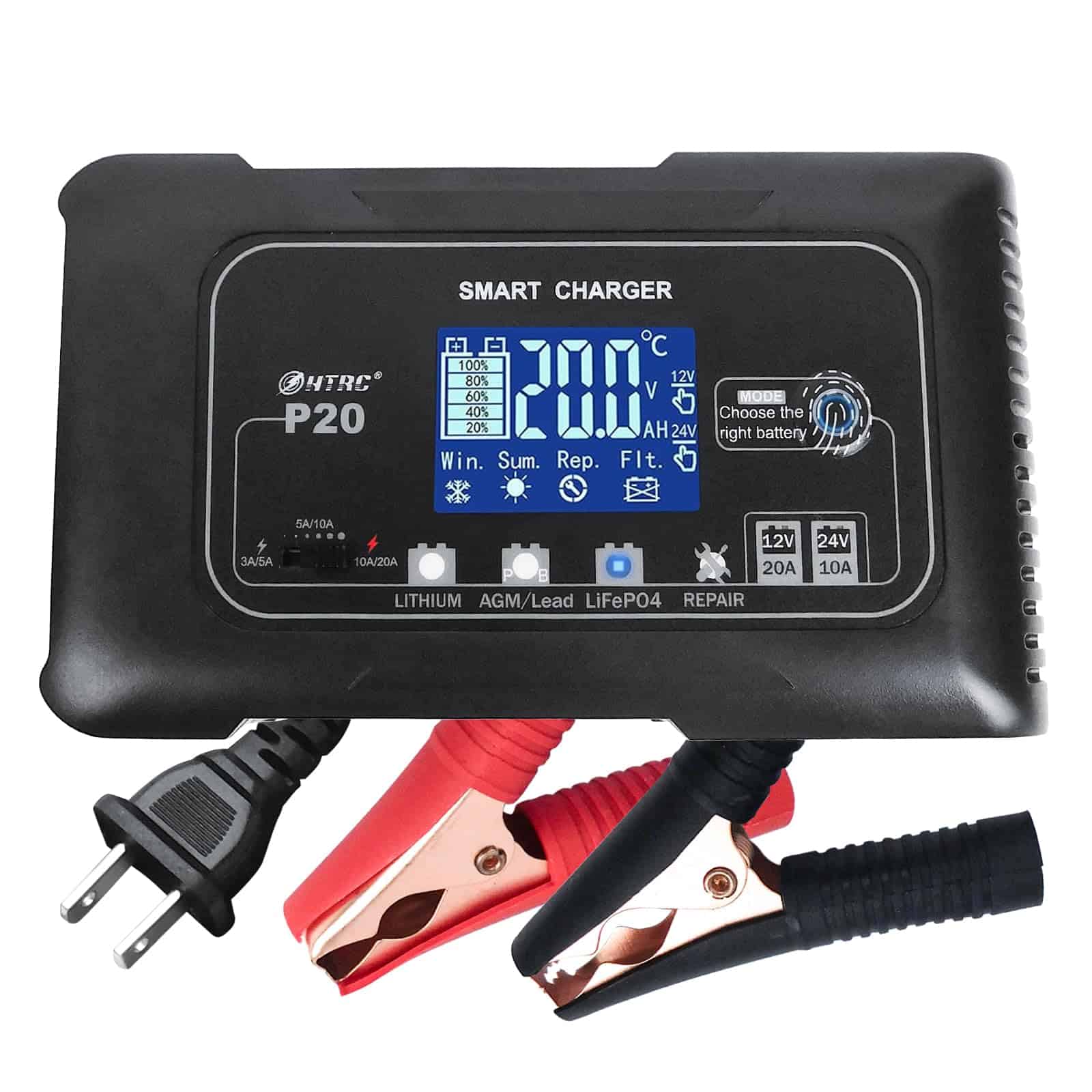 Cargador de batería inteligente de 20 amperios para automóvil, barco, motocicleta, cortacésped, 12V/20A y 24V/10A. Este cargador de batería de alta potencia es perfecto para una amplia variedad de aplicaciones, gracias a su identificación inteligente que permite una carga rápida sin dañar la batería. Cuenta con un botón de bloqueo automático después de 10 segundos para evitar operaciones incorrectas. Compatible con diferentes tipos de baterías, como litio, LifePO4, ácido de plomo (AGM / GEL / EFB, MF, batería inundada, VRLA, SLA, batería húmeda), este cargador es adecuado para automóviles, camiones, motocicletas, SUVs, carros de golf, vehículos agrícolas y barcos. Con funciones de protección y reparación de la batería, este cargador identifica automáticamente el estado de la misma. Además, cuenta con la función de carga automática, que extiende la vida útil de la batería y ajusta automáticamente la corriente de carga según sea necesario. El paquete incluye el cargador inteligente, cable de corriente de 3 m, cable de pinza, manual y 2 orejetas de cable para una fácil instalación y uso.