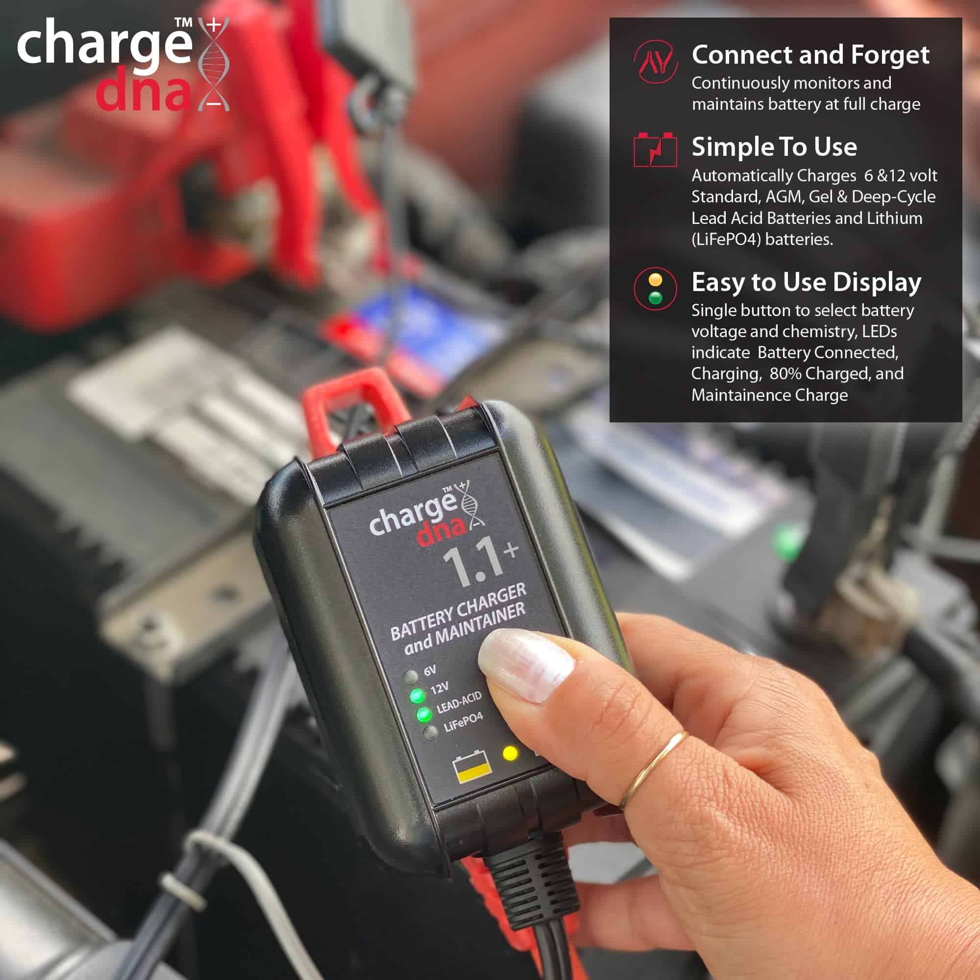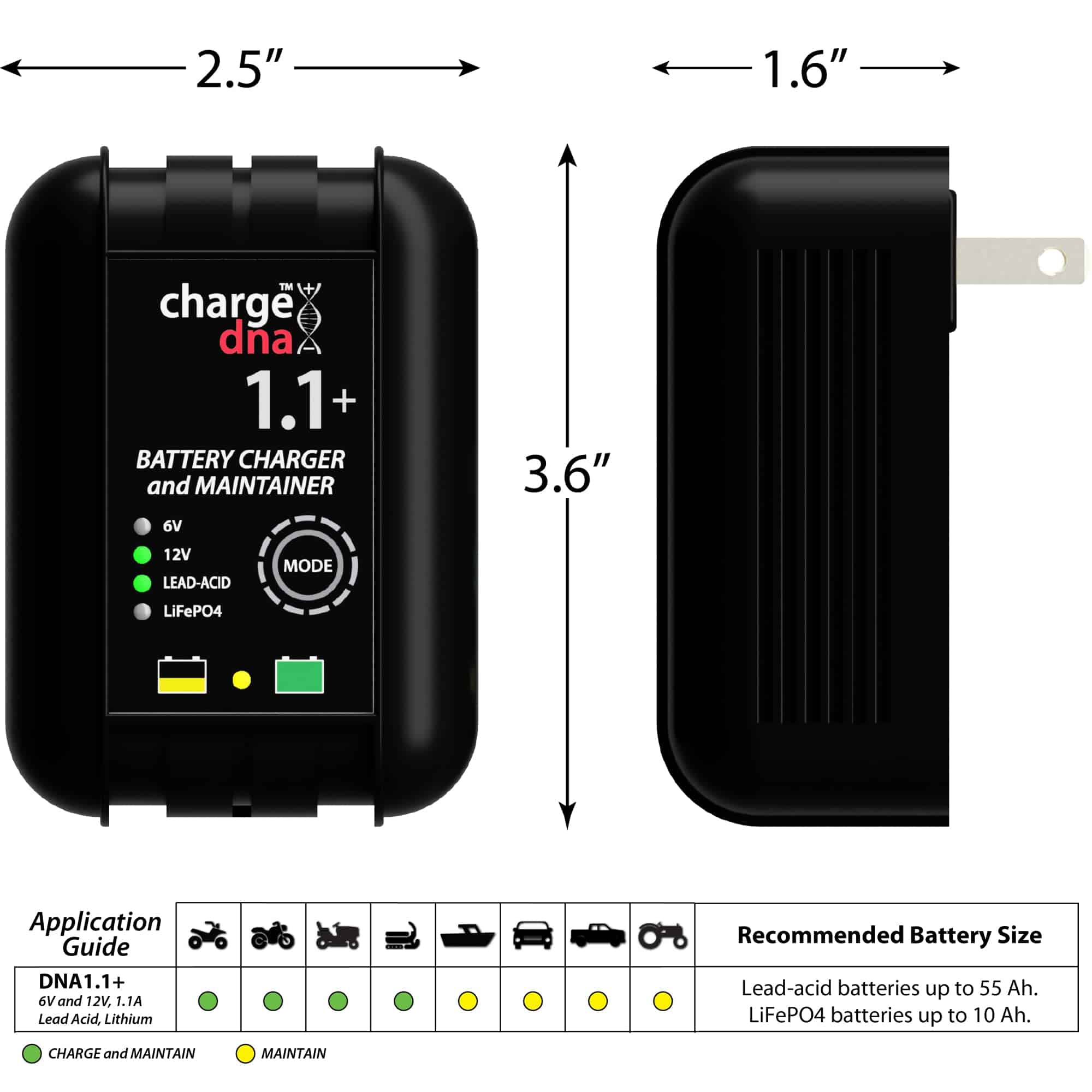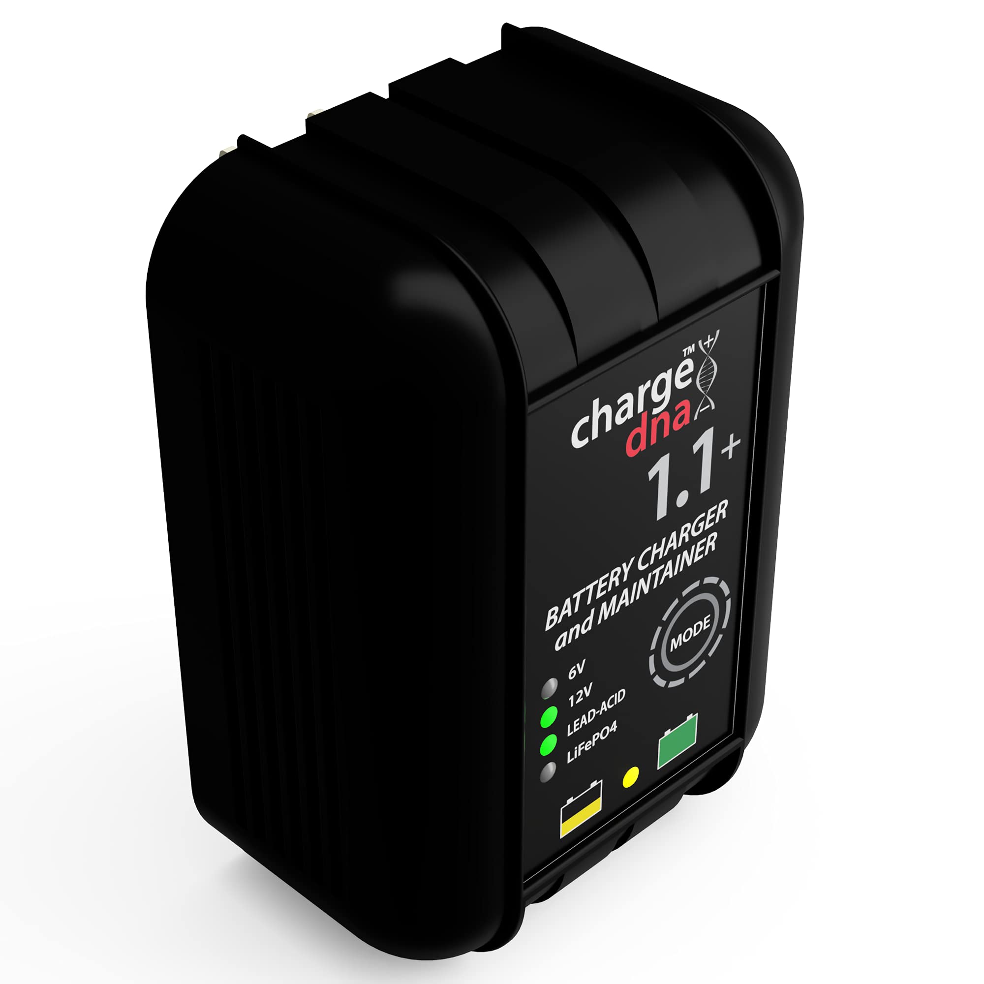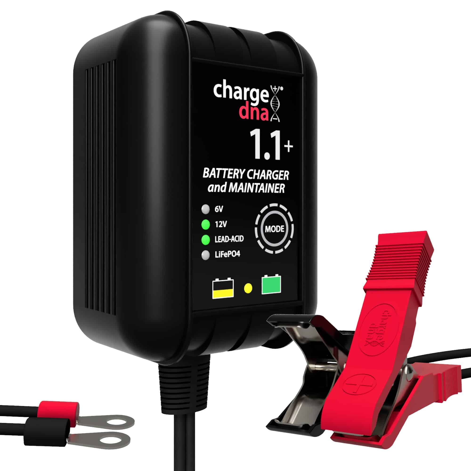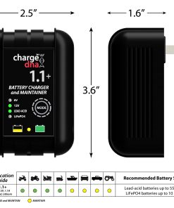 Cargador de Batería ChargeDNA 1.1+, 1.1A, 6/12V totalmente automático para Baterías de Plomo-Ácido y Litio.El ChargeDNA 1.1+ es un cargador de batería y mantenedor totalmente automático para baterías de plomo-ácido y litio de 6V y 12V de automóviles, motocicletas, ATV y marinas. Cuenta con un diseño de circuito de última generación que proporciona la carga exacta que necesita tu batería maximizando la eficiencia. Después de cargar, monitoreará tu batería y la mantendrá al 100% cargada.Diseñado para cargar baterías de plomo-ácido de hasta 55Ah y baterías de litio (LiFePO4) de hasta 10 Ah. Totalmente automático para una carga de batería sin preocupaciones todos los días. Diseñado para cargar completamente tu batería y nunca sobrecargará.Un microcontrolador integrado monitorea continuamente la condición de carga de la batería para proporcionar voltaje y corriente de carga precisos para dar a tu batería una carga óptima y luego monitorear la batería para mantenerla completamente cargada.Compatible con todo tipo de baterías de vehículos: coches, motocicletas, cortadoras de césped, ATV, tractores, camiones, SUVs, botes y más. 40% más potencia que un cargador de 750mA en el mismo tamaño de carcasa. Listado en la Base de Datos de Certificación de Cumplimiento del Departamento de Energía de EE. UU. 3 años de garantía sin problemas. Algoritmo de Carga Adaptativa Multietapa Inteligente:Pre-Carga:Etapa 1: Cualificación de la bateríaEtapa 2: Recuperación de la batería/arranque suaveCarga: Etapa 3: Carga rápida hasta al menos un 80% de cargaEtapa 4: Carga de absorciónEtapa 5: Mantenimiento/Carga flotante¡La Tecnología de Carga está Evolucionando! ChargeDNA es la próxima generación de cargadores de baterías.