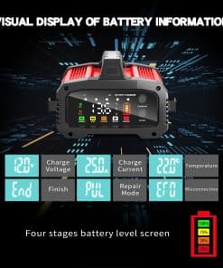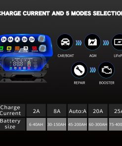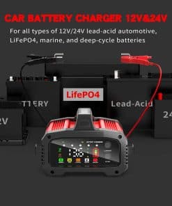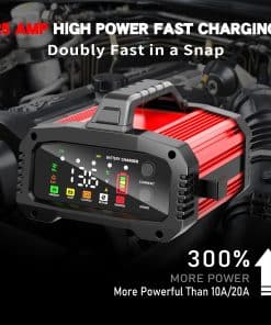 Cargador de batería de 12V de primera línea con tecnología exclusiva de Refuerzo de Emergencia. Diseñado para recuperaciones críticas, este modo suministra la corriente máxima instantánea para revivir baterías gravemente agotadas en 200 segundos (limitado en tiempo por seguridad). Este potente dispositivo de 25 amperios funciona automáticamente con sistemas de 12V/24V y se adapta perfectamente a todos los tipos de baterías de plomo-ácido, incluidas las estándar, AGM, gel y de ciclo profundo. Ofrece protección avanzada contra la sobrecarga, cortocircuitos y polaridad inversa. Ligero y portátil, con pantalla LCD digital visual para monitorear fácilmente el estado de carga, la corriente, el voltaje, el tipo de batería y la información de error.