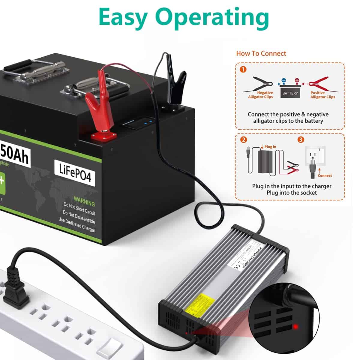 Especificaciones: Especificación: DC48V 15AmpVoltaje de Carga Constante: 58.4V (batería lifepo4 de 16s)Corriente de Carga Constante: 15AModo de Carga: 3 Etapas, CC, CV, GoteoDimensión: 26.5 12 5(cm)Peso Neto: 1.65kgMaterial: Aleación de aluminio con VentiladorVarias Protecciones: Salida sin carga, Conexión anti-inversa, Protección contra cortocircuitos, Protección contra sobrecalentamiento, Protección contra baja tensión, Protección contra sobretensión, Protección contra sobre-corrienteAplicaciones: Autocaravanas, Vehículos Comerciales, Barcos, Yates y másPor favor tenga en cuenta:1. El ánodo del cargador se conecta al ánodo de la batería LiFePO4, y el cátodo del cargador se conecta al cátodo de la batería LiFePO4.2. El clip de carga rojo es el ánodo(+) y el clip de carga negro es el cátodo(-).3. Protección contra conexiones invertidas: El cargador debe estar conectado a un enchufe energizado primero y esperar 10 segundos para que pase la corriente a través del cargador. Luego conectar la batería lifepo4 con un clip. La protección contra conexiones inversas del cargador entra en vigencia.