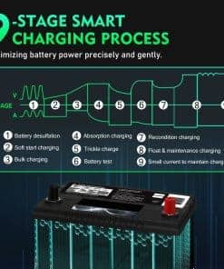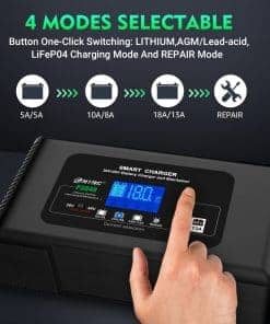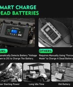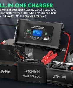 Cargador inteligente de batería completamente inteligente con proceso de carga de 9 etapas, garantiza una mayor eficiencia de carga y optimiza la potencia de la batería de manera precisa y suave. Reconoce automáticamente la batería de 36/48V, con corriente máxima de carga de 18A(36V) /13A(48V). Tiene la función de memoria automática, por lo que volverá al último modo cuando esté conectado. Este inteligente cargador de batería soporta carga y mantenimiento de baterías de litio, plomo-ácido (AGM, GEL, SLA, inundadas, húmedas, EFB, etc.) y funciona para coches, barcos, motocicletas, carritos de golf, cortadoras de césped, montacargas, tractores, etc. Adopta una carcasa de ABS retardante de llama, diversas funciones de precaución. La tensión de carga se adapta automáticamente a la temperatura para evitar la sobre o subcarga. Además, la protección del circuito integrado, el sistema sin chispas, la protección de polaridad inversa, la protección de sobre carga, sobre voltaje y sobrecalentamiento harán que se mantenga seguro todo el tiempo. Con función de reparación y pantalla LCD. Con la función de reparación, repara y almacena baterías antiguas, inactivas, dañadas, estratificadas y sulfatadas. El tiempo máximo de reparación es de 24 horas. Solo para baterías de plomo-ácido. (NOTA: no puede reparar baterías muy dañadas). La pantalla LCD muestra el estado de carga y de la batería, incluyendo voltaje, corriente, potencia de la batería, temperatura, etc. Así que puedes cargar con más tranquilidad. Lista de paquetes: Cargador de batería inteligente, cable de alimentación de 3m/118 pulgadas, cable de pinzas, manual, 2 pestañas de cables. Si tienes alguna pregunta sobre nuestros productos, no dudes en ponerte en contacto con nosotros.