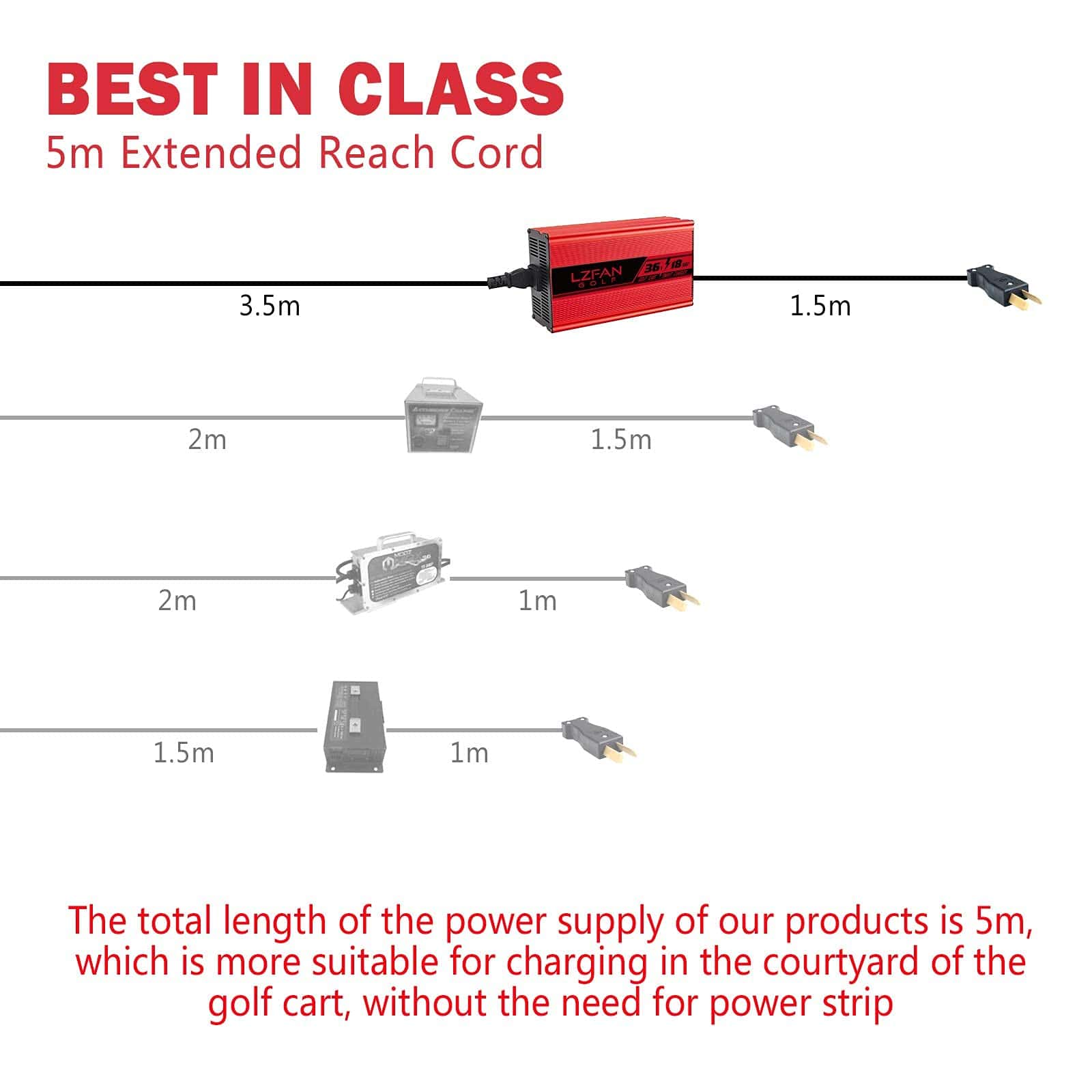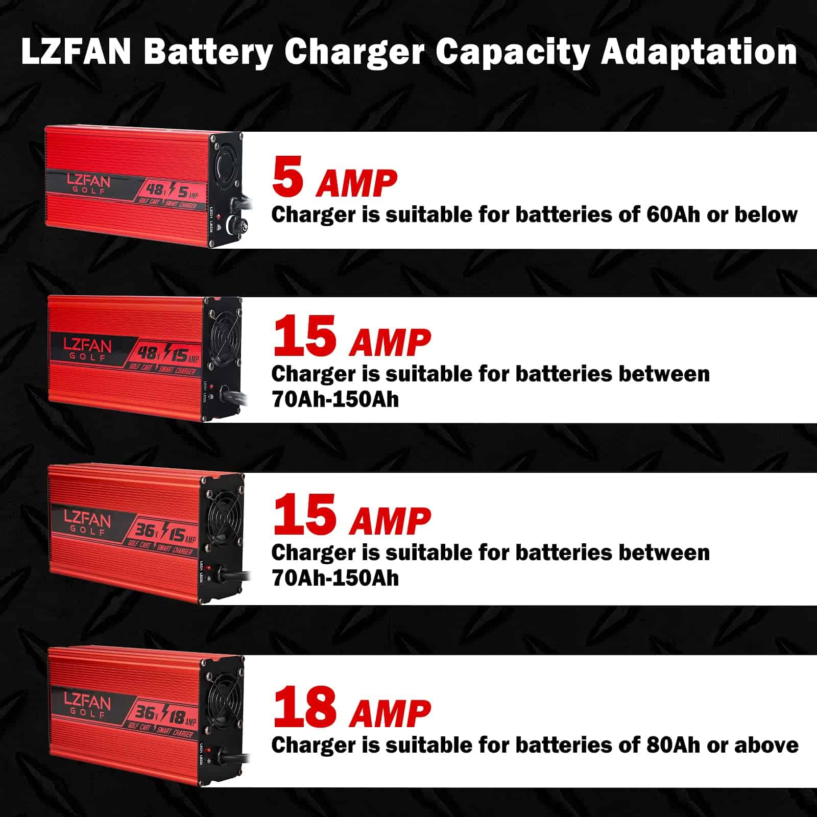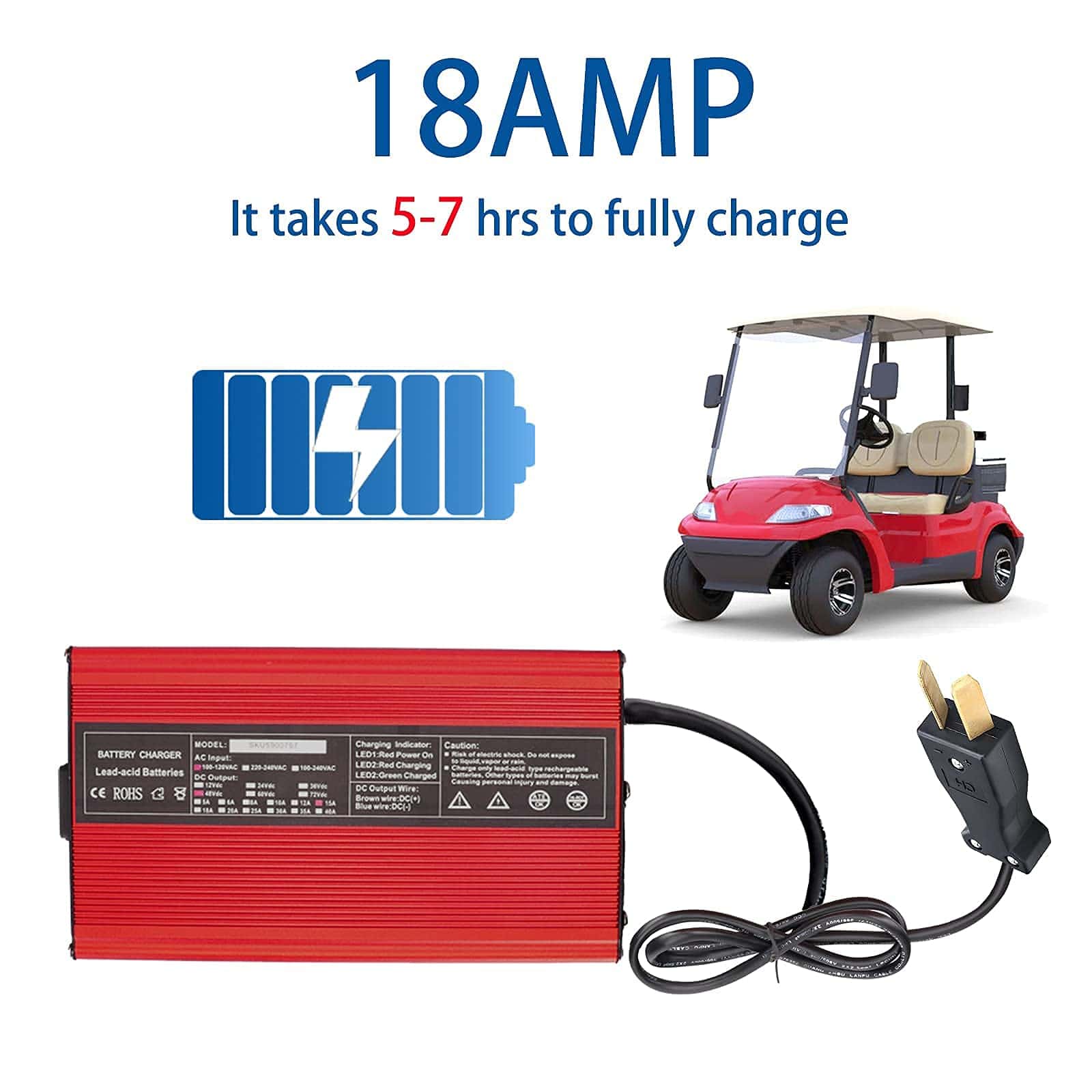 Voltaje de CC: 36 voltios (La salida de carga es: 44.1V) Tasa de carga de CC: 18 amperios Estándar del enchufe: Enchufe de estilo Crowfoot Equipado con luz LED como indicadores para mostrar el estado de carga Prueba de quemado al 100% de carga completa