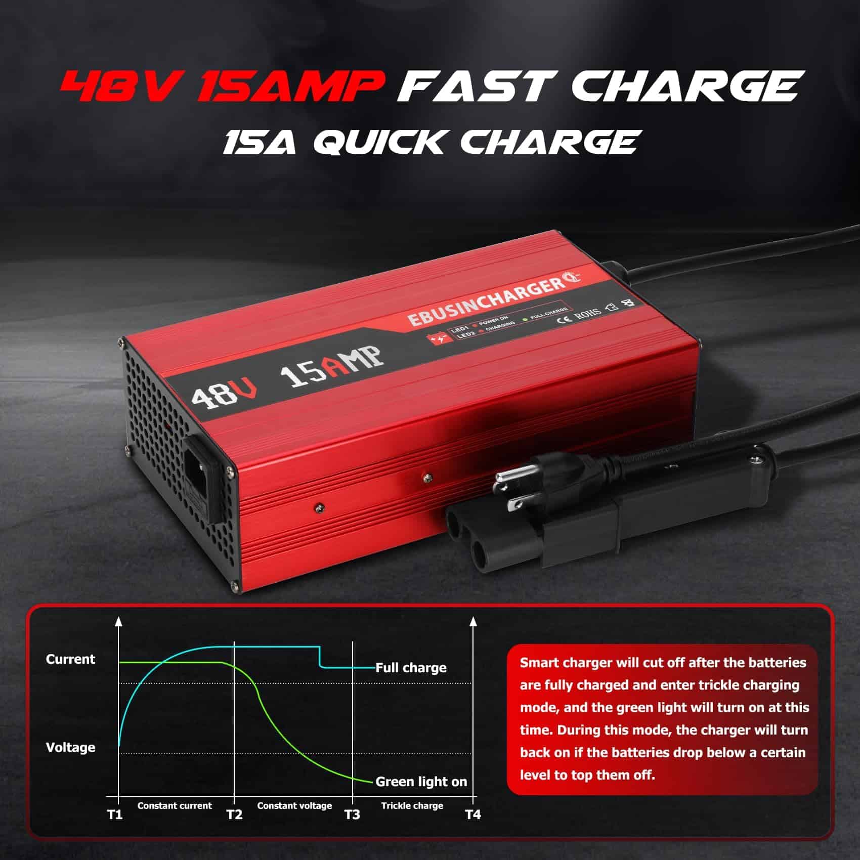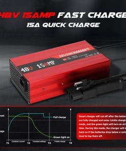 2. Carga Rápida: El Cargador Inteligente de Carro de Golf de 48 Voltios y 15 Amperios puede cargar completamente su carro de golf en 6-8 horas. ¡Carga 3-4 veces más rápido que un cargador de 5 amperios, ahorrándole tiempo! Nota: El tiempo de carga depende de la capacidad de la batería de plomo-ácido.
