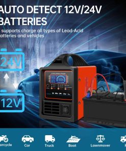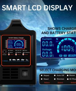 Cargador de batería para coche iSunergy, Cargador de batería automotriz 12V/24V, 0-15A Cargador inteligente con reparación, apagado automático, modo invierno, mantenedor de batería para coches, camioneros, barcos, cortacéspedes Baterías de ciclo profundo. Características del producto: 1. Cargador de batería inteligente que reconoce y carga automáticamente baterías de 12/24V con programa de carga de 7 pasos. Admite cargas para todos los tipos de baterías de plomo-ácido, incluidas baterías húmedas / inundadas, AGM, gel, MF, EFB, calcio y baterías de ciclo profundo, con la capacidad de cargar hasta 400 amperios-hora de capacidad de batería.