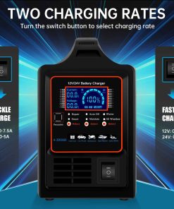 2. Dos velocidades de carga. Tiene 2 tasas de carga que se pueden ajustar, carga rápida y carga lenta, solo debe cambiar el botón para seleccionarlo. El modo de carga rápida es adecuado para baterías con una capacidad superior a 30 Ah, el modo de carga lenta es adecuado para baterías con capacidad entre 4 y 30 Ah.