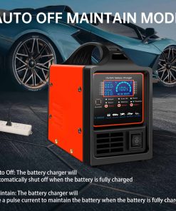 4. Apagado automático / Mantenimiento. El cargador de baterías se apagará automáticamente cuando la batería esté completamente cargada (tardará 1 hora en cargar la batería del 95% al 100%). También se puede seleccionar el modo de mantenimiento, que utilizará una corriente de pulso para mantener la batería en lugar de apagar automáticamente cuando la batería esté completamente cargada.