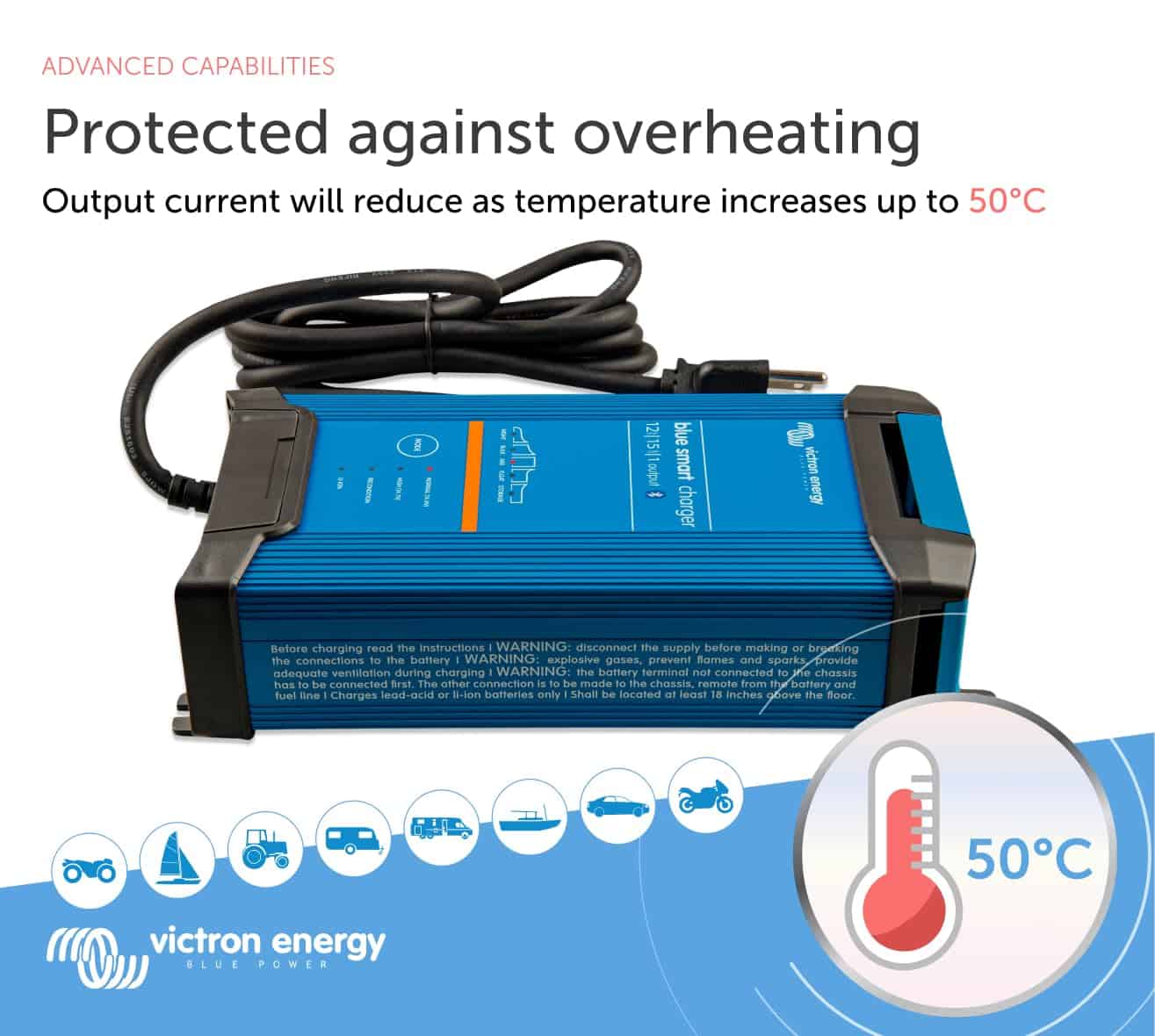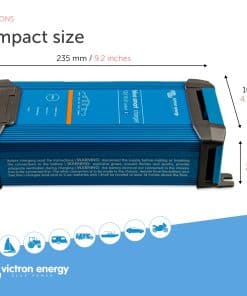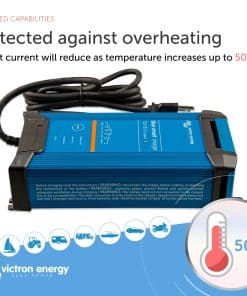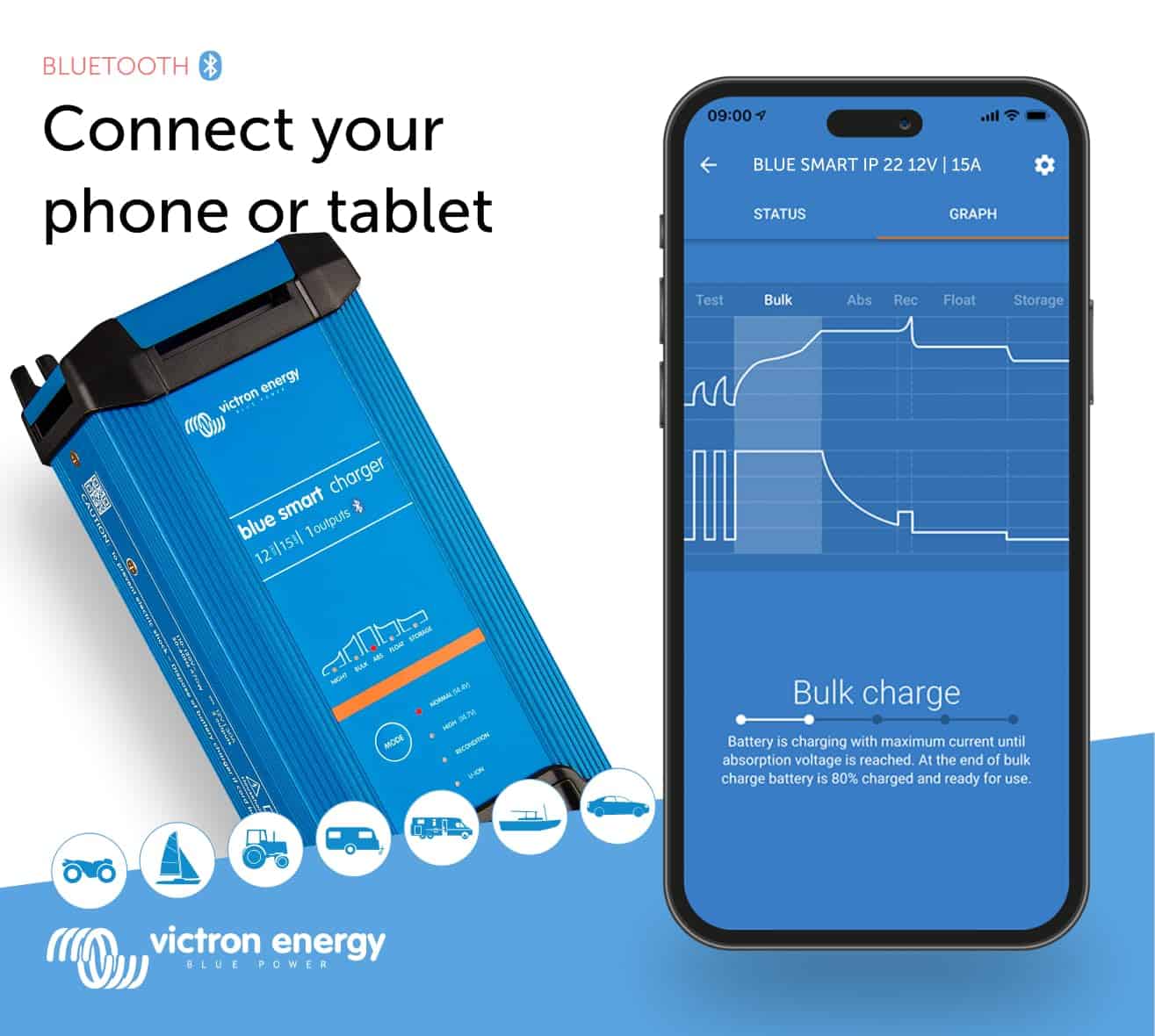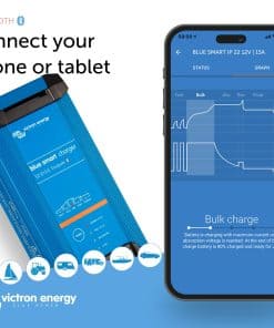 Cargador de 15A para automóviles, autocaravanas y barcos con 1 salida. Cargador de batería con Bluetooth integrado. Esto le permite monitorear el estado de carga de su batería a través de su teléfono inteligente. La aplicación VictronConnect Setting, viewing and configuring your Blue Smart IP22 charger using your smartphone. Utilizando la aplicación VictronConnect para dispositivos iOS y Android, puede ver el estado de su cargador y batería e incluso controlar las funciones de su cargador. De forma predeterminada, el voltaje y la corriente se muestran en la pantalla.